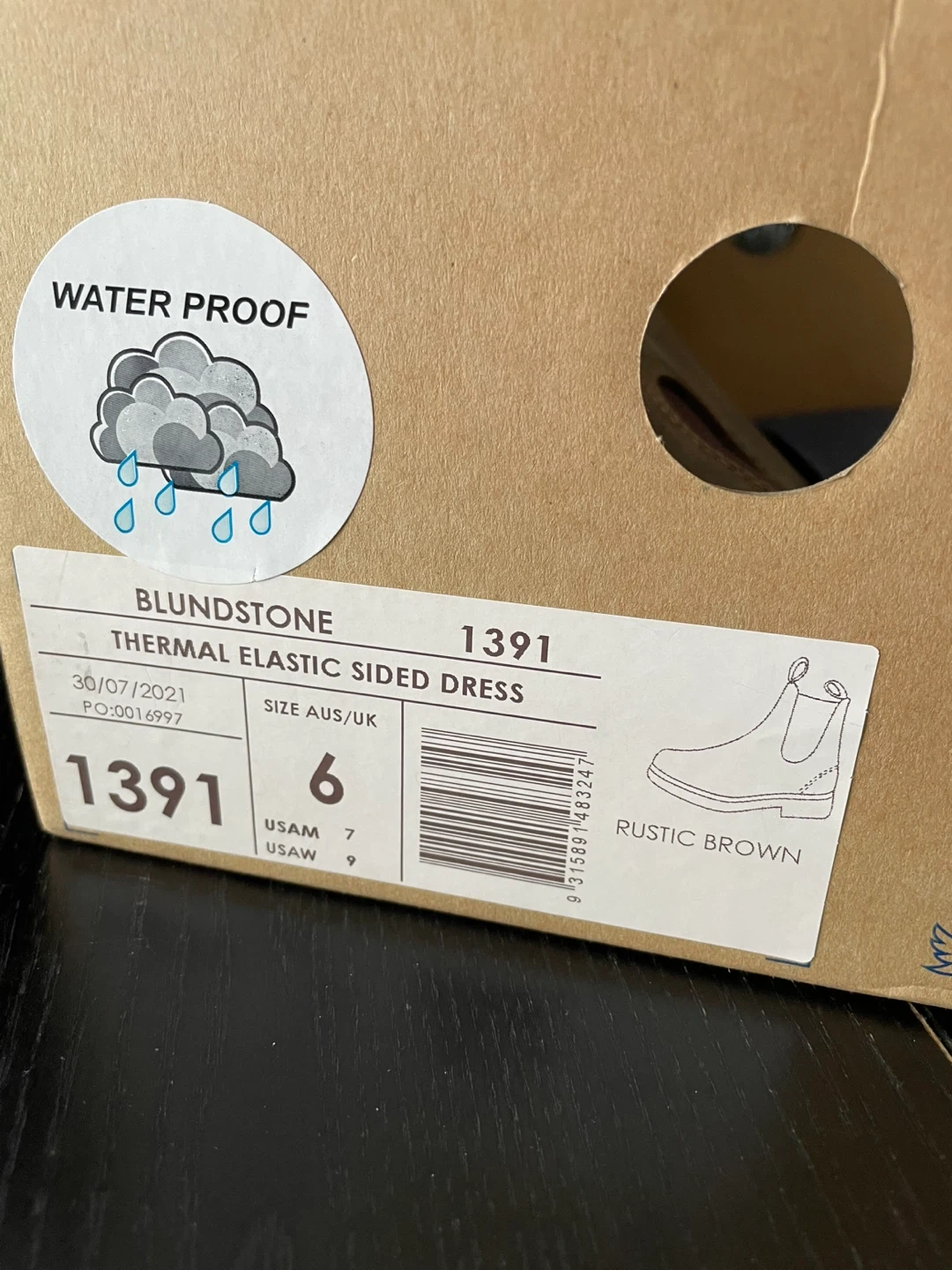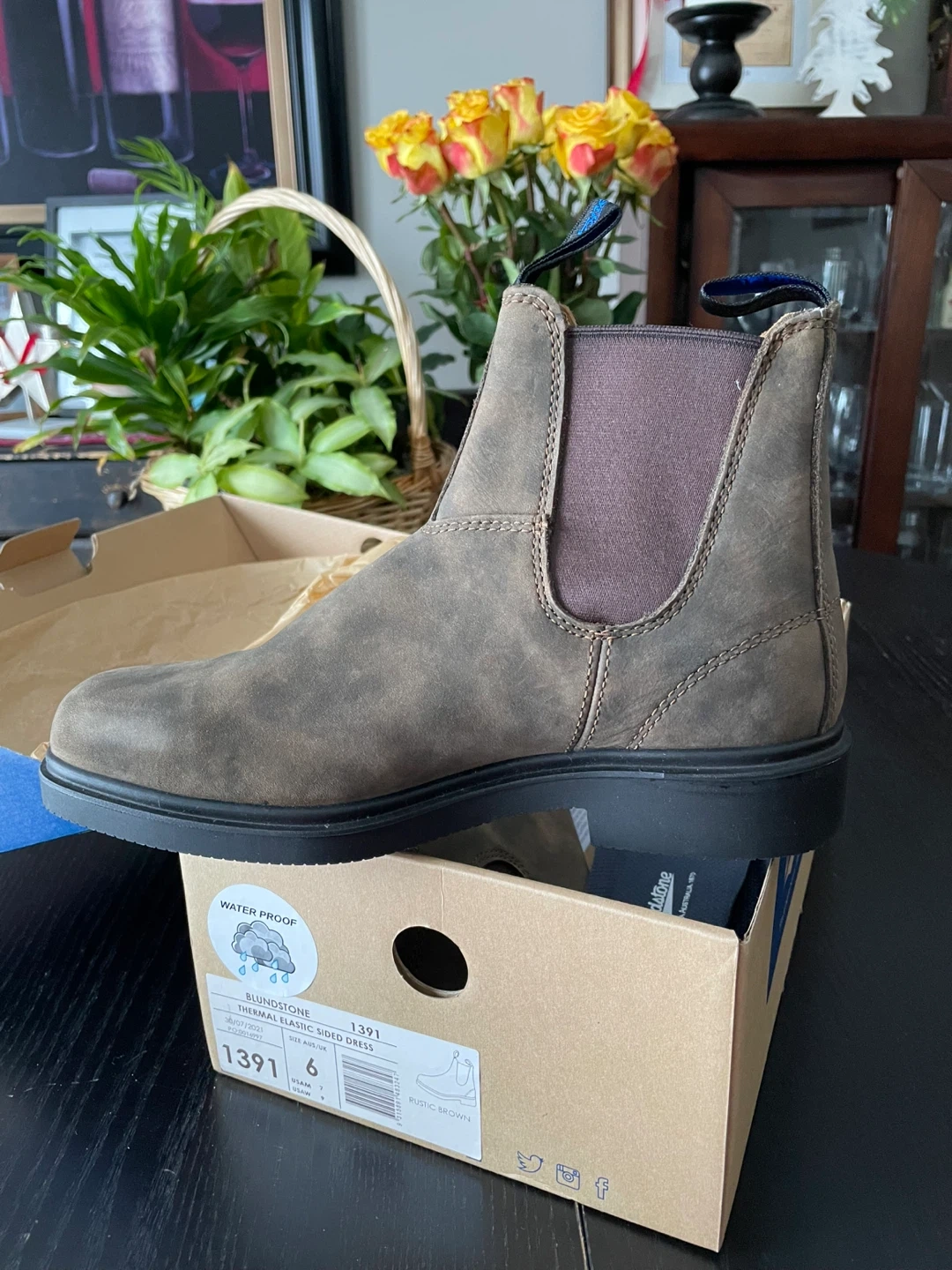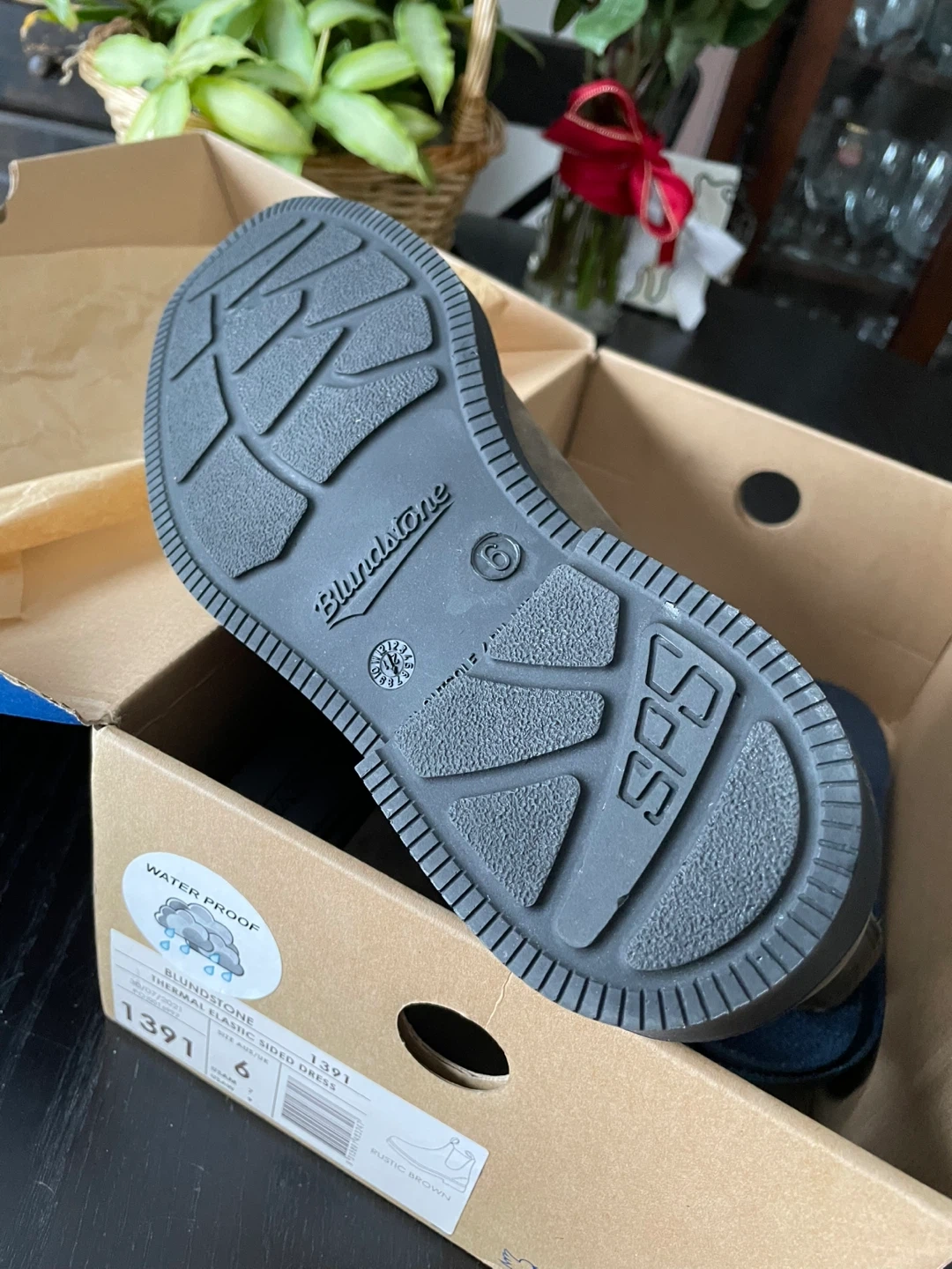 Women’s Blundstone 1391 thermal elastic sided dress boots in rustic brown. Wool fleece foot bed., plus additional regular insert. These boots are waterproof and women’s size 6 AUS/9 US. They're made for warmth and durability.