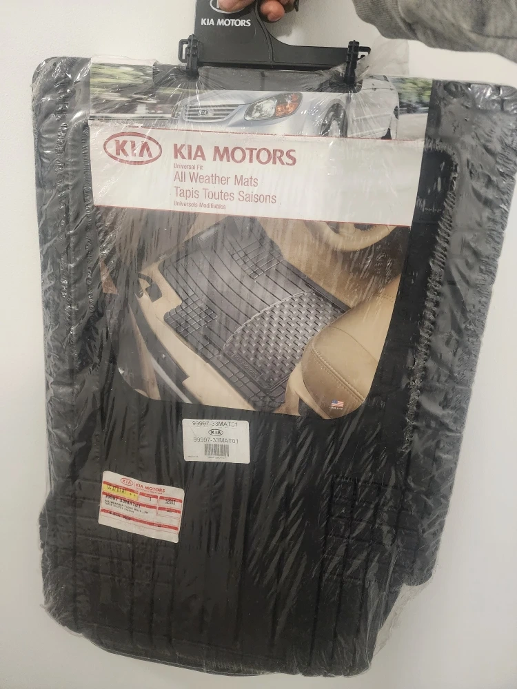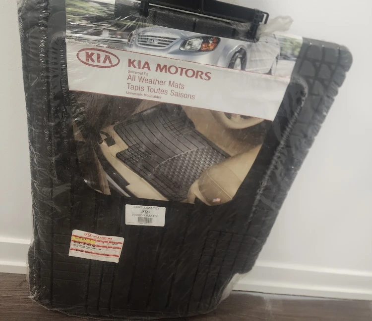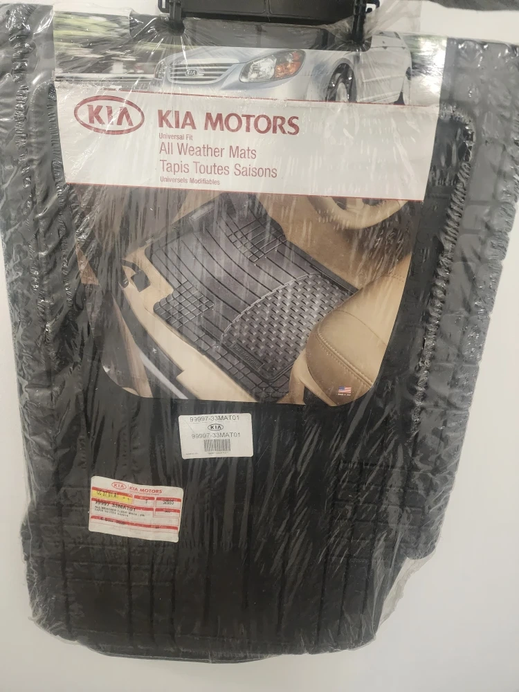 Set of Kia Motors all-weather floor mats. They're designed for a universal fit and are made from durable rubber material. Keep your car's interior protected from dirt and moisture!