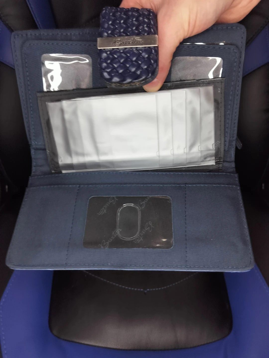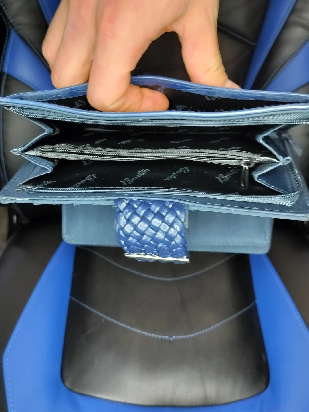 Stylish Blue Buxton women's leather wallet with unique crocodile pattern finish and secure woven snap closure from FriendlyLocalFlippingBusiness. Excellent used condition—clean, soft leather, multiple card slots, bill compartment, and zippered coin pocket for everyday essentials. Perfect compact size for handbags or pockets. Local meeting and delivery within North Bay only, no pickup. Serious buyers message to arrange—first come, first served!