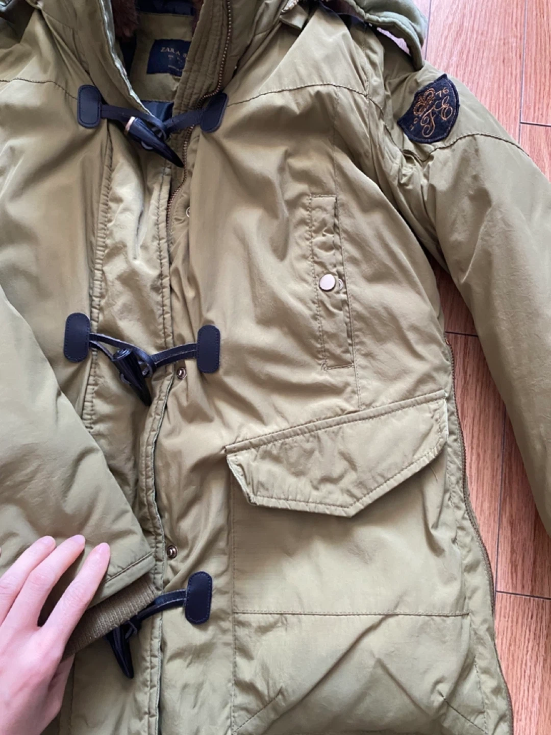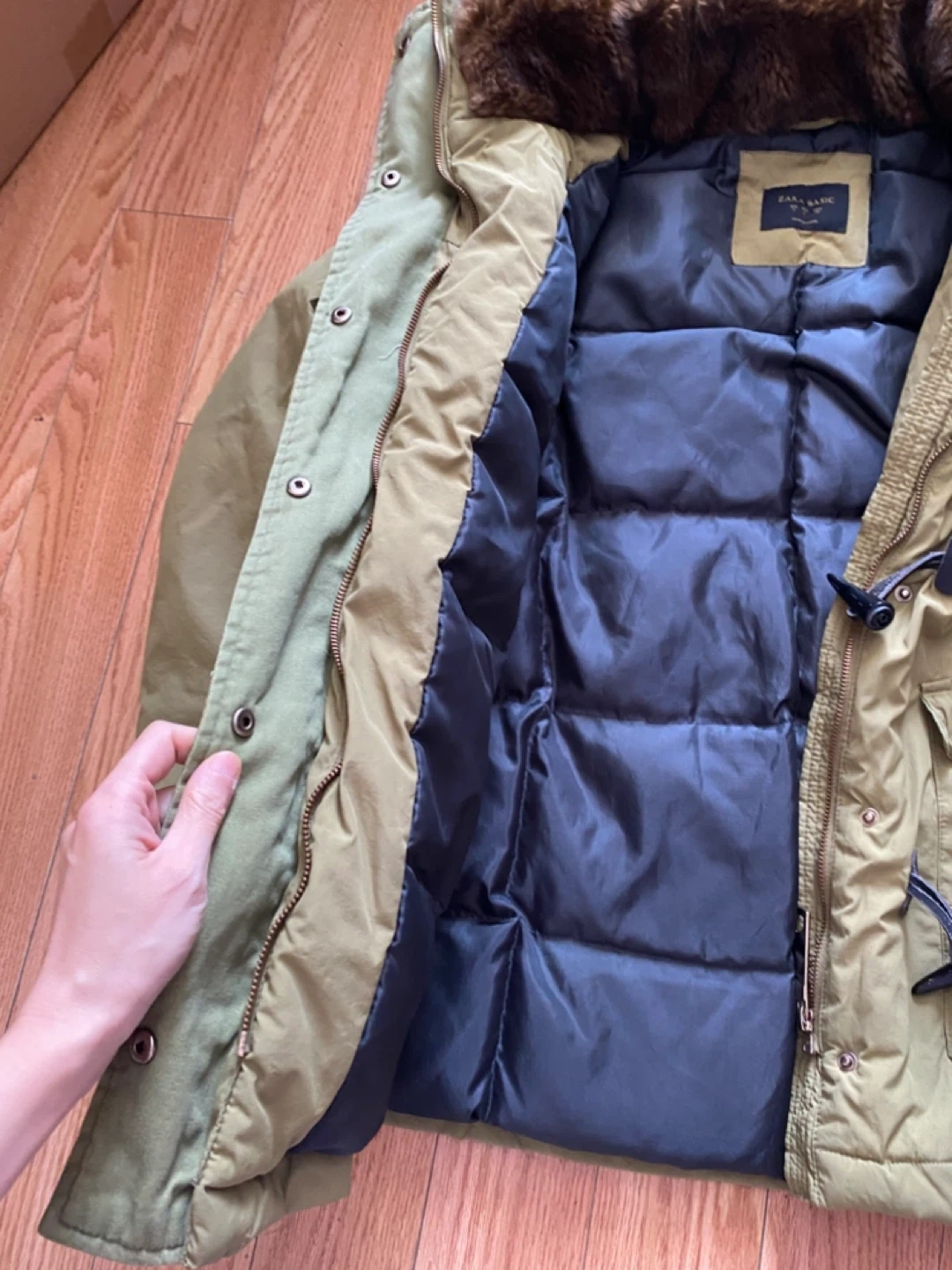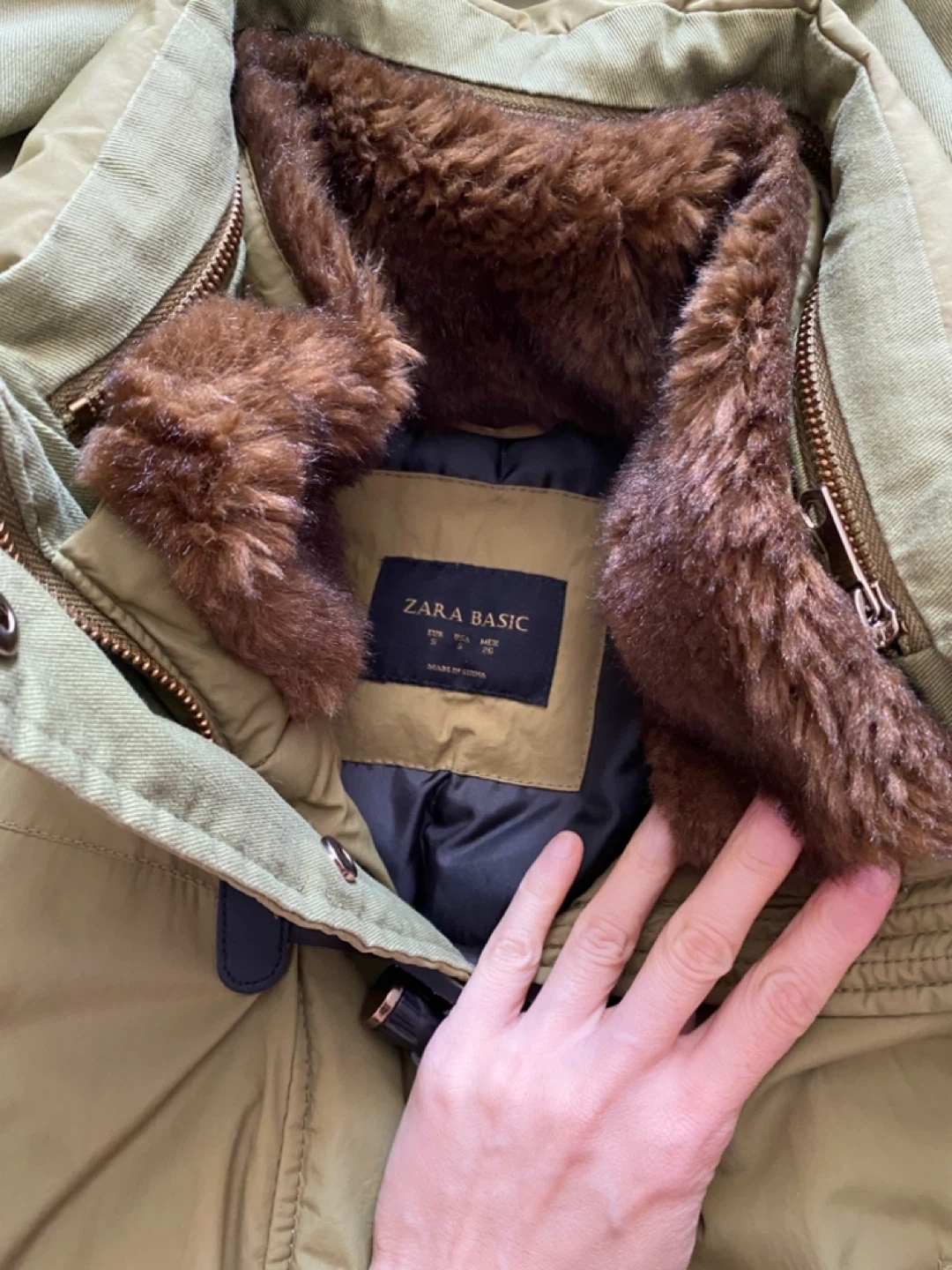 Selling a Zara Basic winter down jacket in a lovely green colour! It's in great condition and perfect for the colder months. The jacket features a cozy faux fur collar and toggle closures. It has a warm lining to keep you snug and stylish all winter long