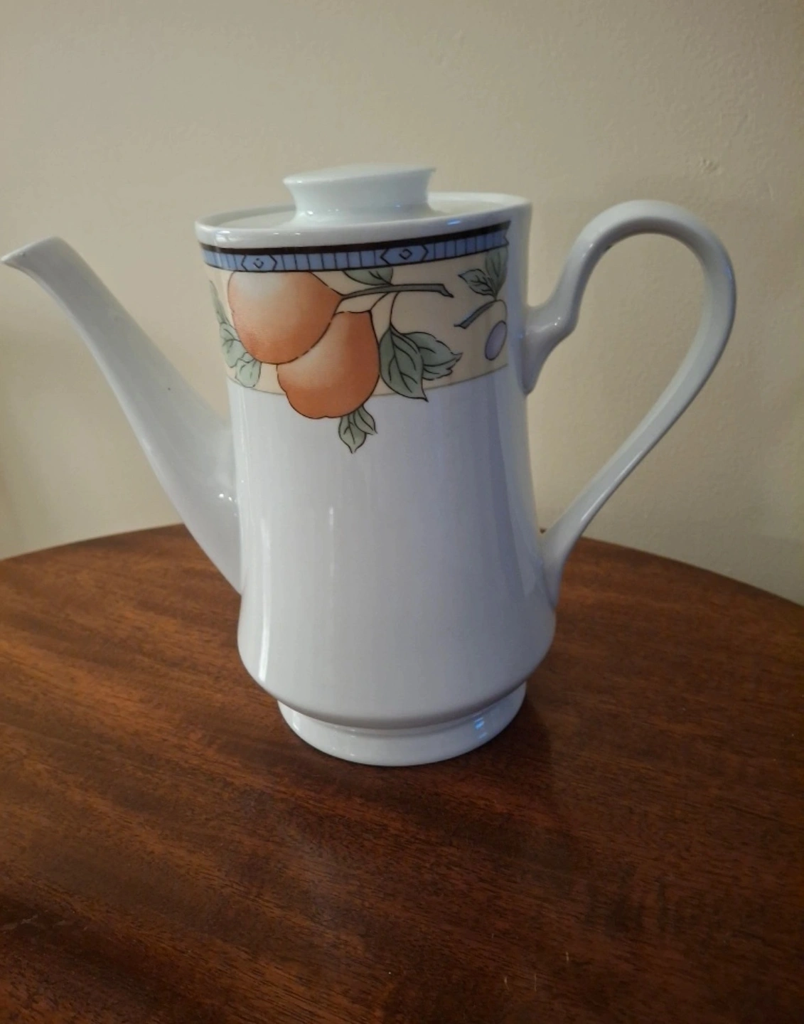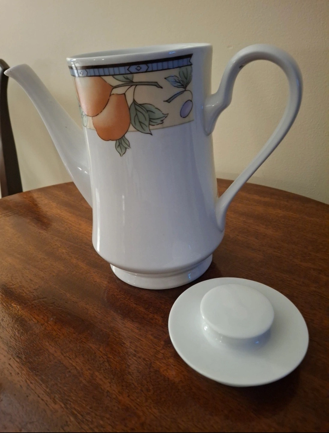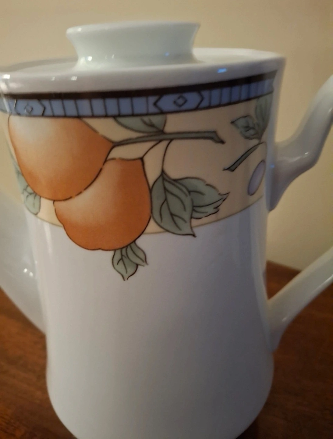 Coffee pot with fruit design, made by ABC Fine China. 8” high from bottom to lid. Never been used, but has a super tiny nick on the spout (hard to see).