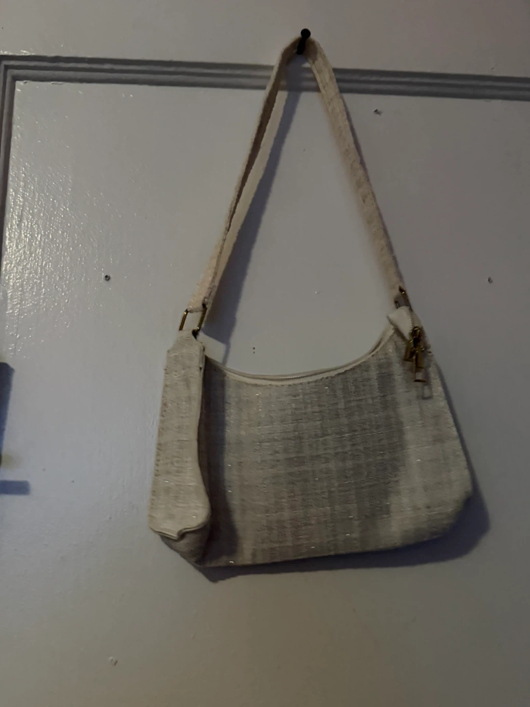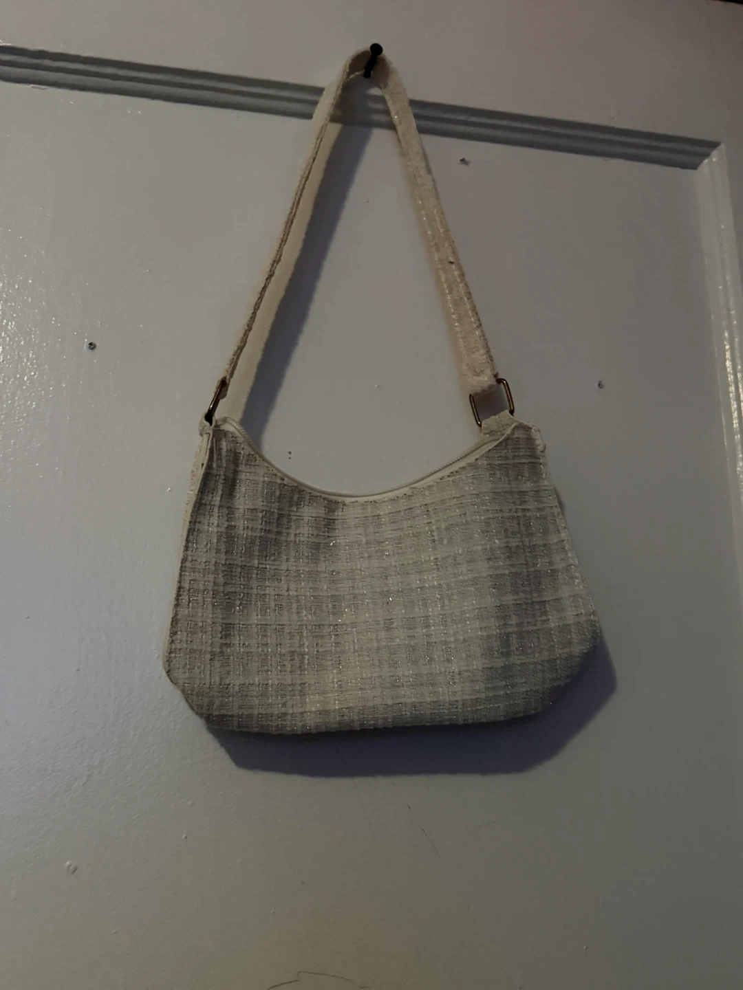 Cream colored shoulder bag with a tweed-like texture and subtle silver threading throughout. It features a curved silhouette with a single strap and a zip closure. Measures approximately 10 inches wide and 6 inches tall.