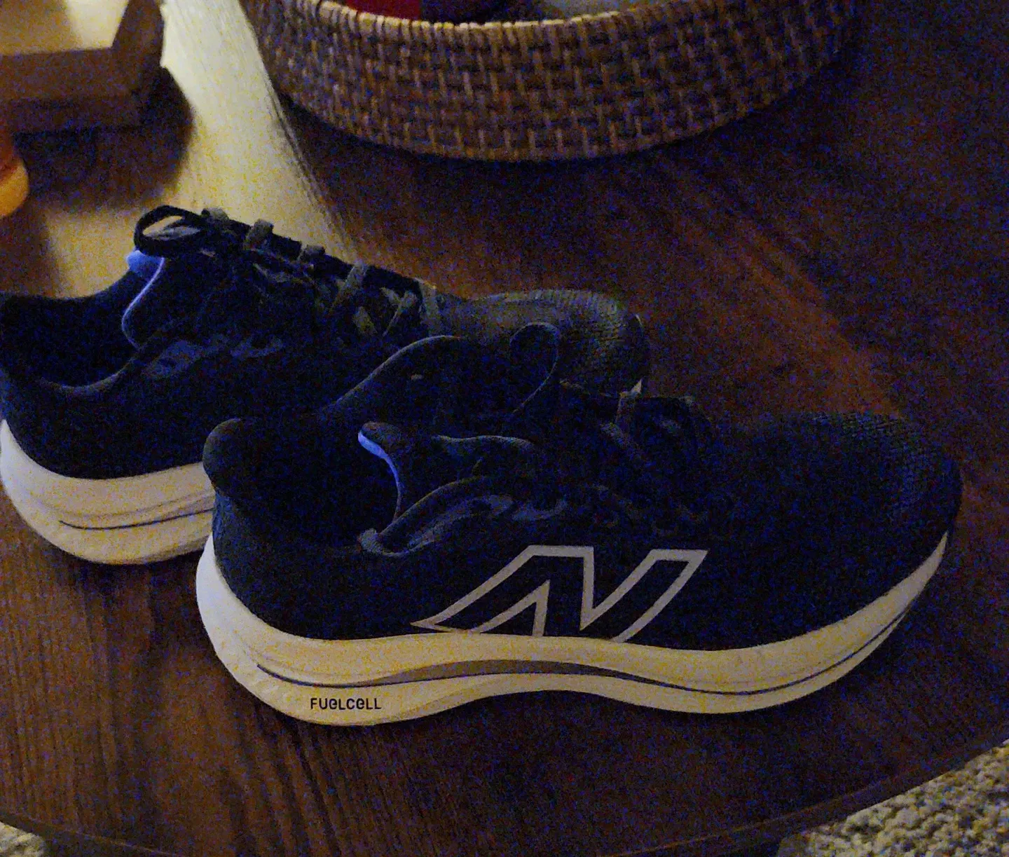 New Balance men's running shoes with FuelCell technology. Features a dark blue mesh upper and a white midsole. Ideal for road running.