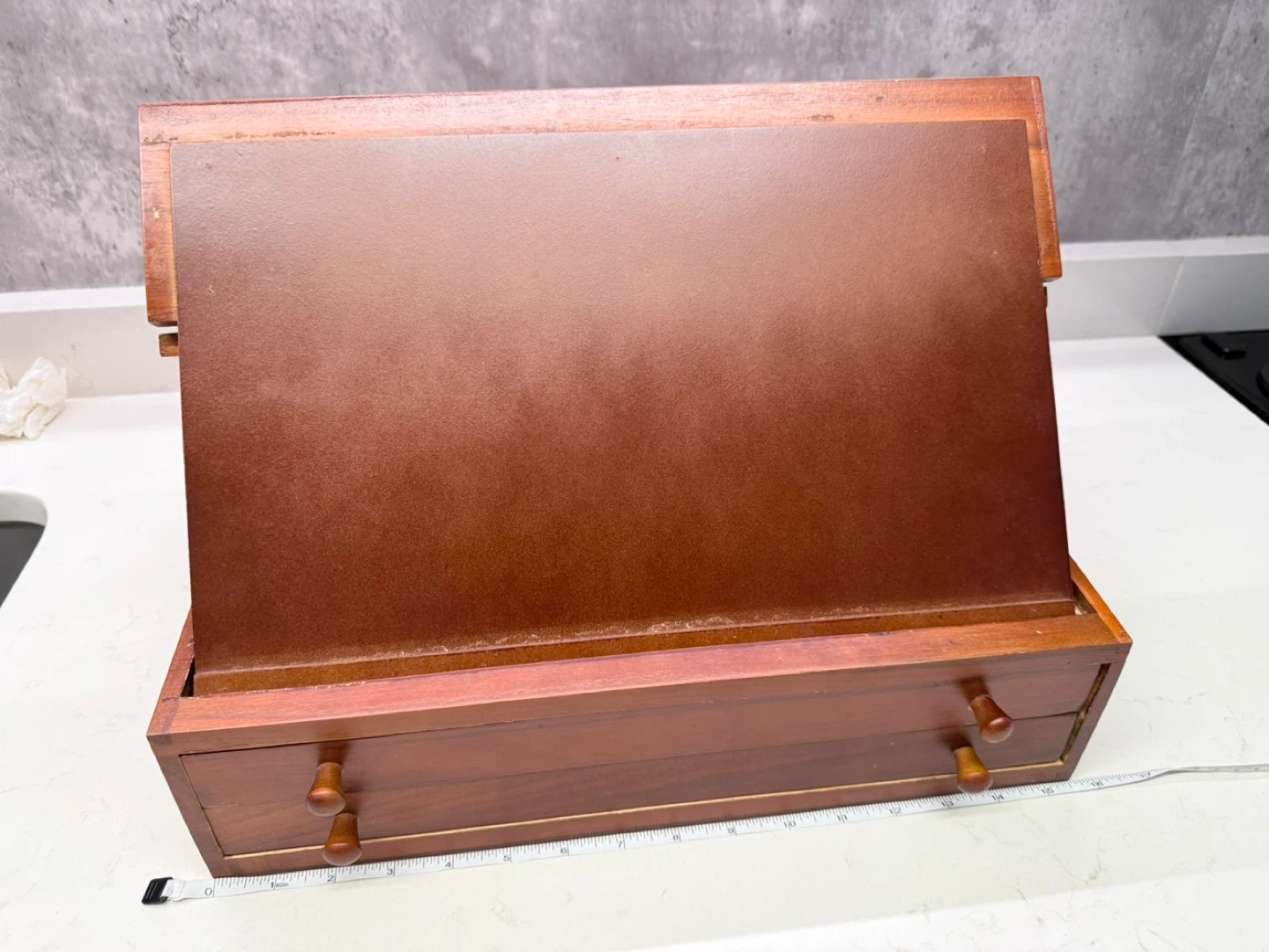 This wooden box easily folds into an easel. Two full drawers below are full of art supplies. There is also a place to store your art.