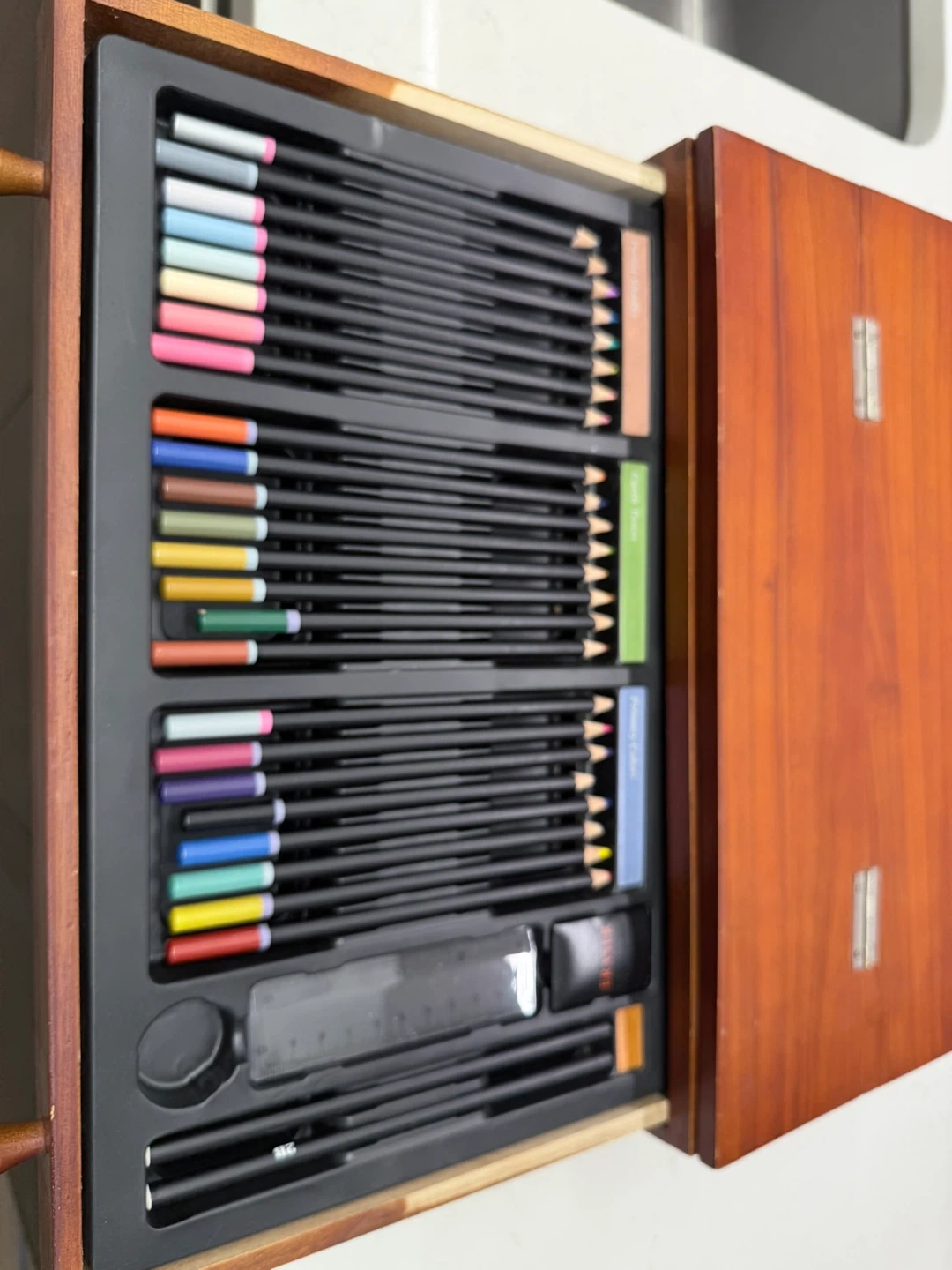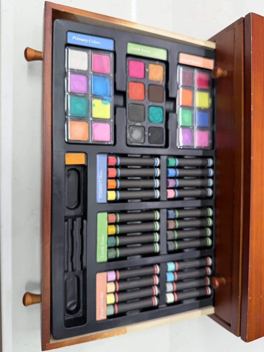 All of this in one wooden box. It is full of art supplies and Great fun for the artist in you.