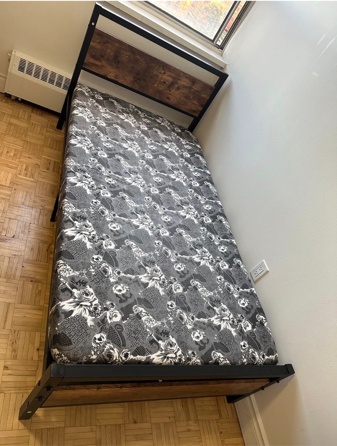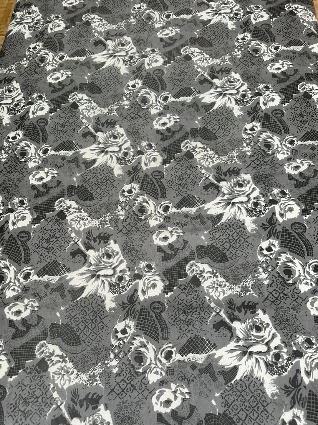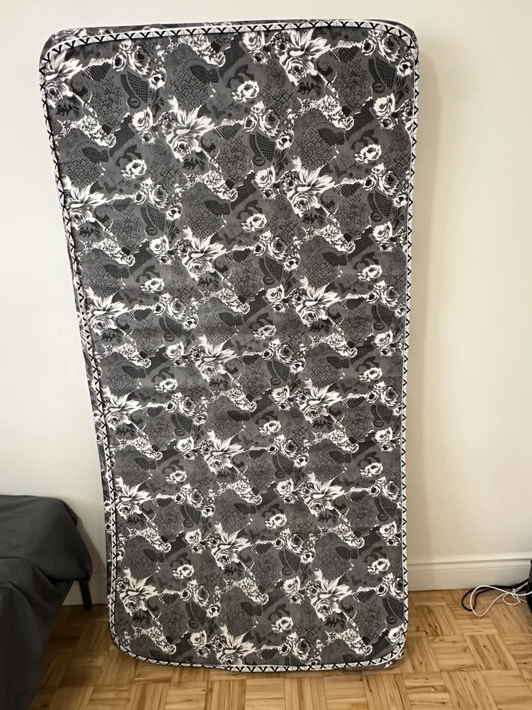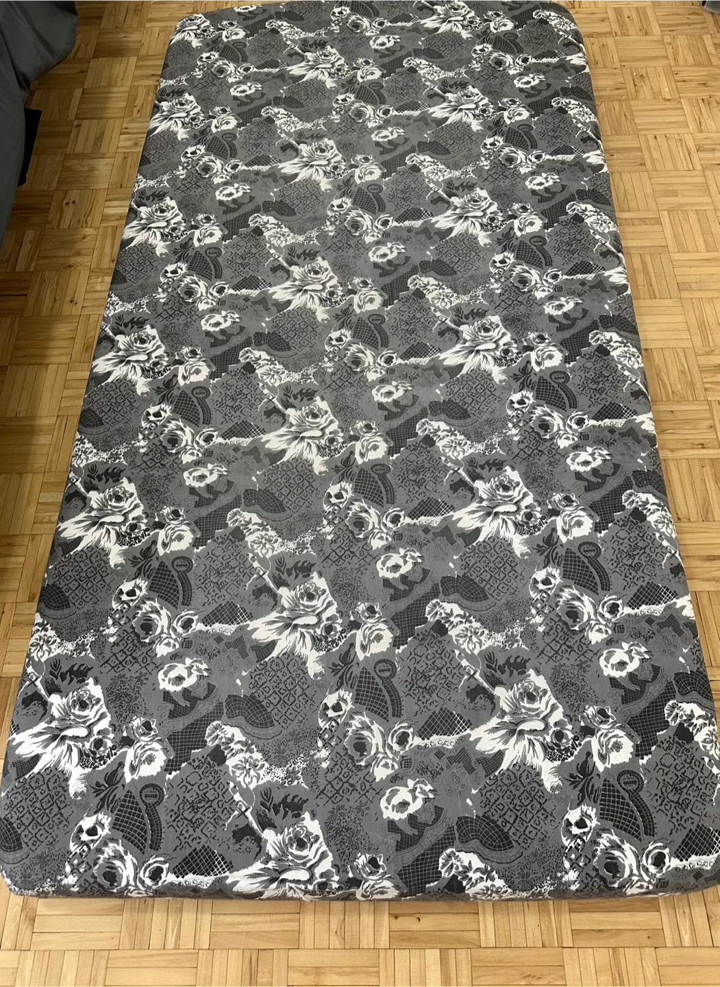 This is a single mattress featuring a unique grey design with skulls and roses. It's great for a student dorm or a guest room. The mattress has a fabric cover with a decorative stitched edge.