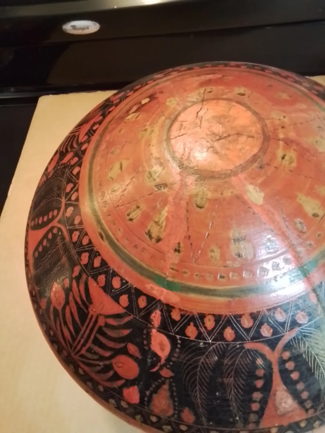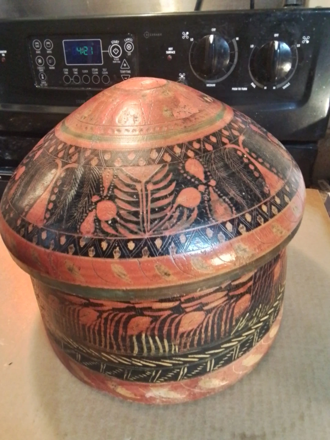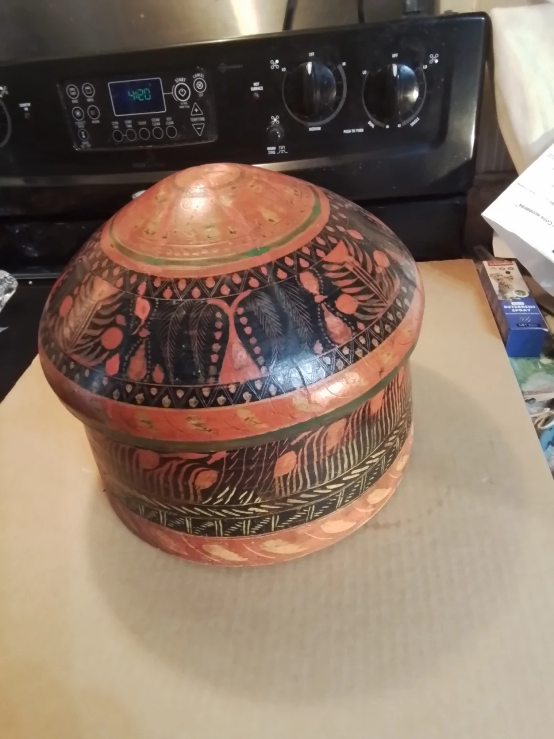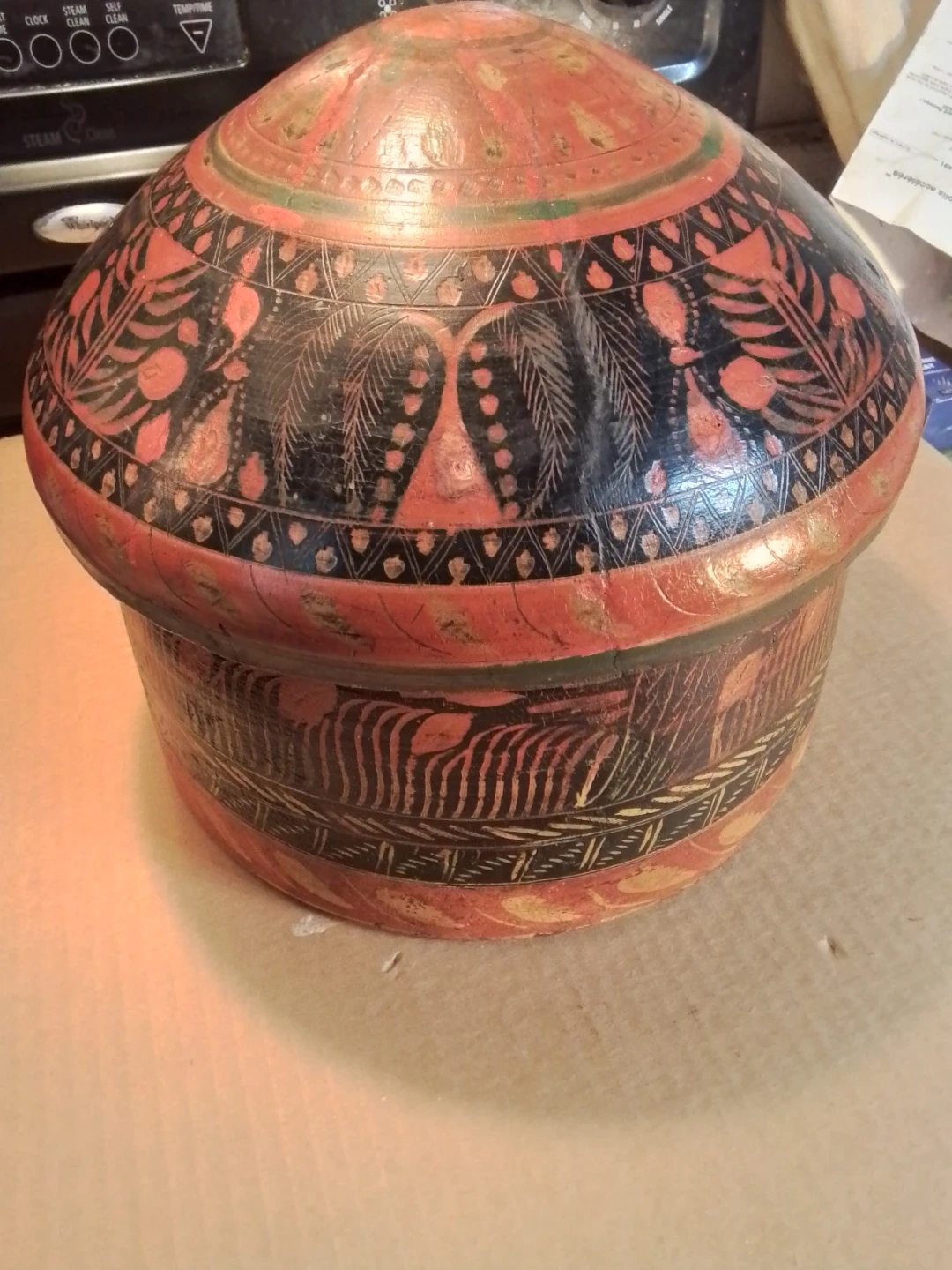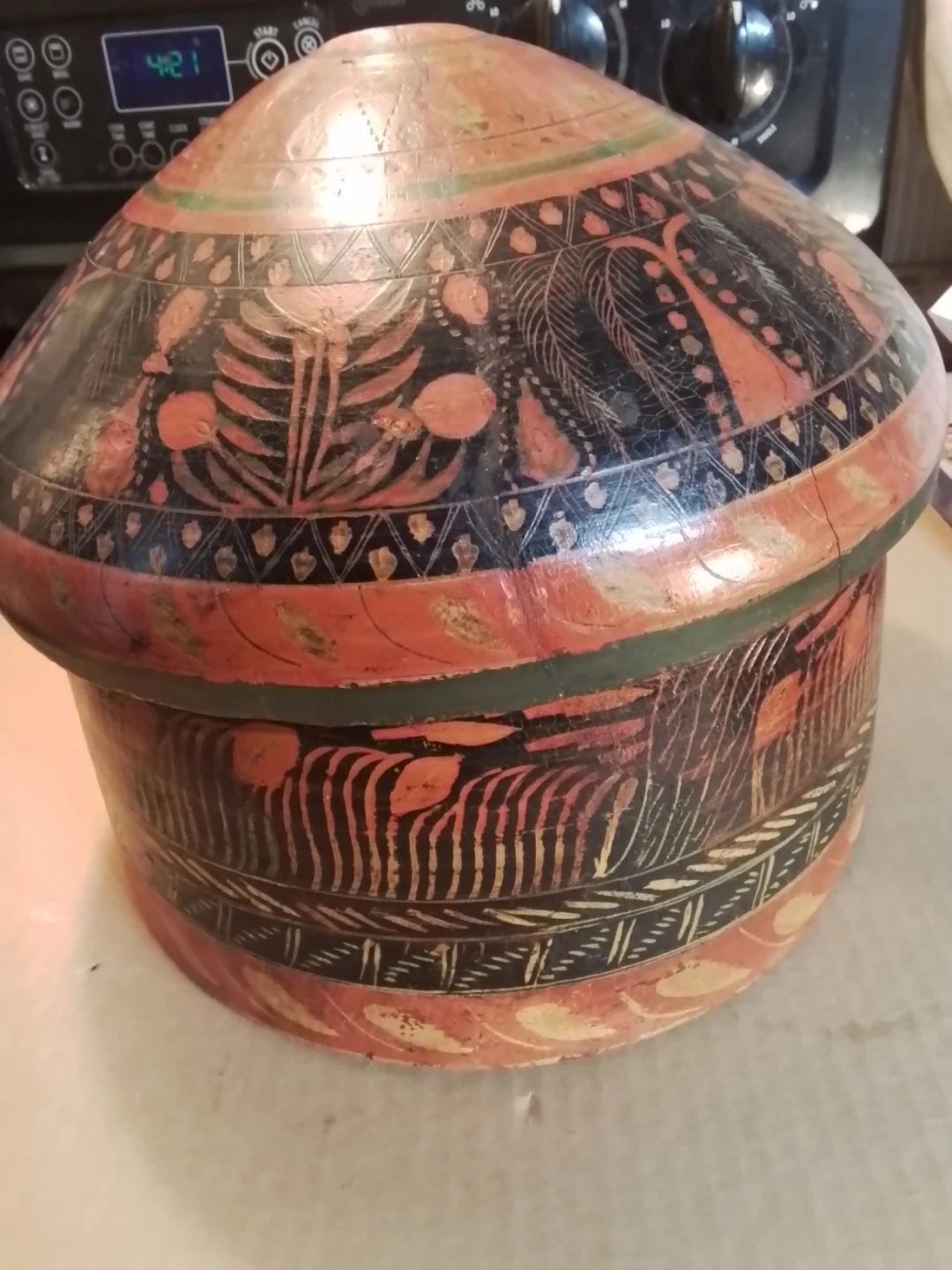 This is a unique hand-painted wooden box with a lid. It's decorated with intricate patterns in red, black, and green. This decorative piece would be great for storing small items or as a display item.