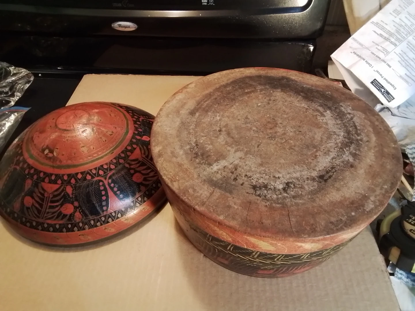 Antique Hand-Painted Mongolian Wood Lidded Bowl shaped like Yurt
