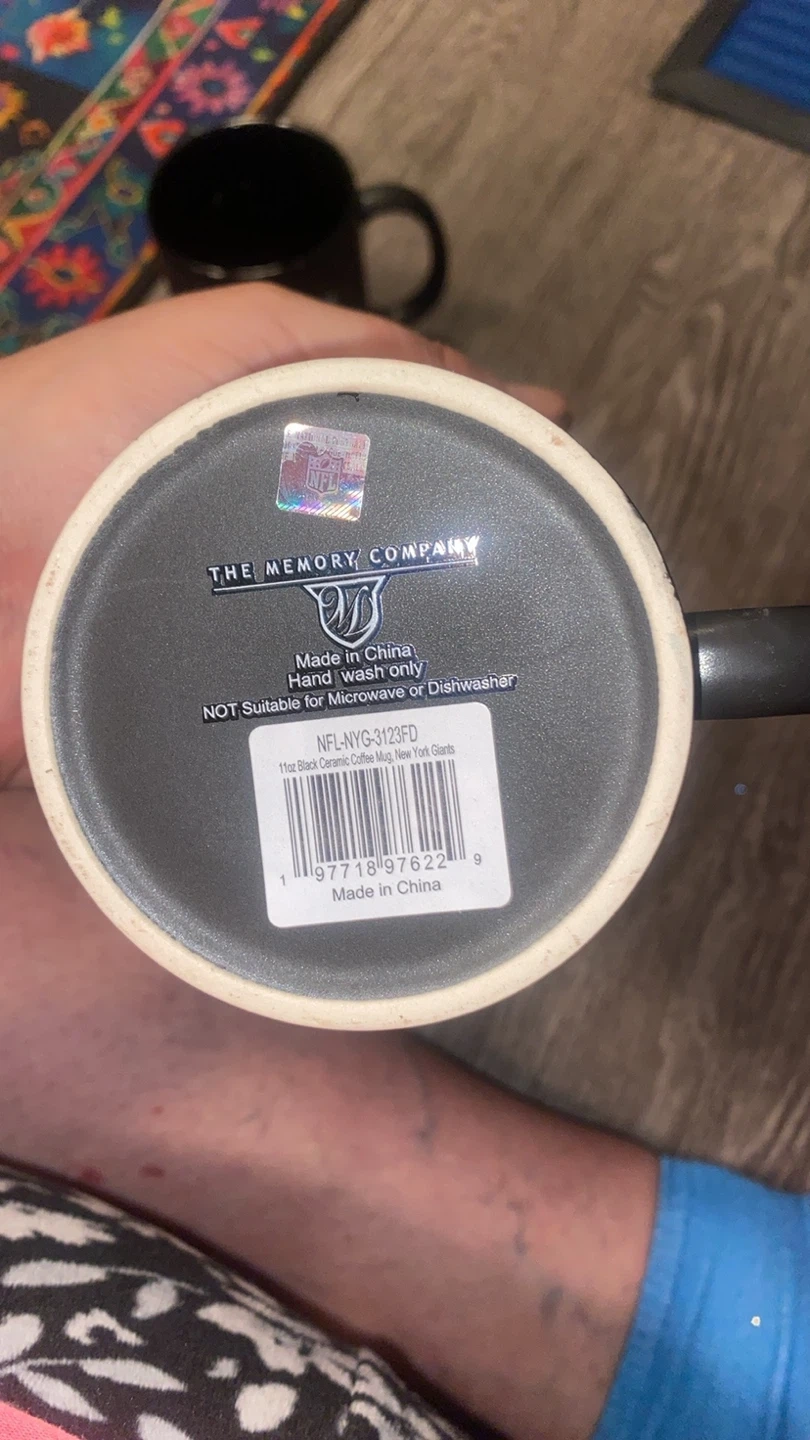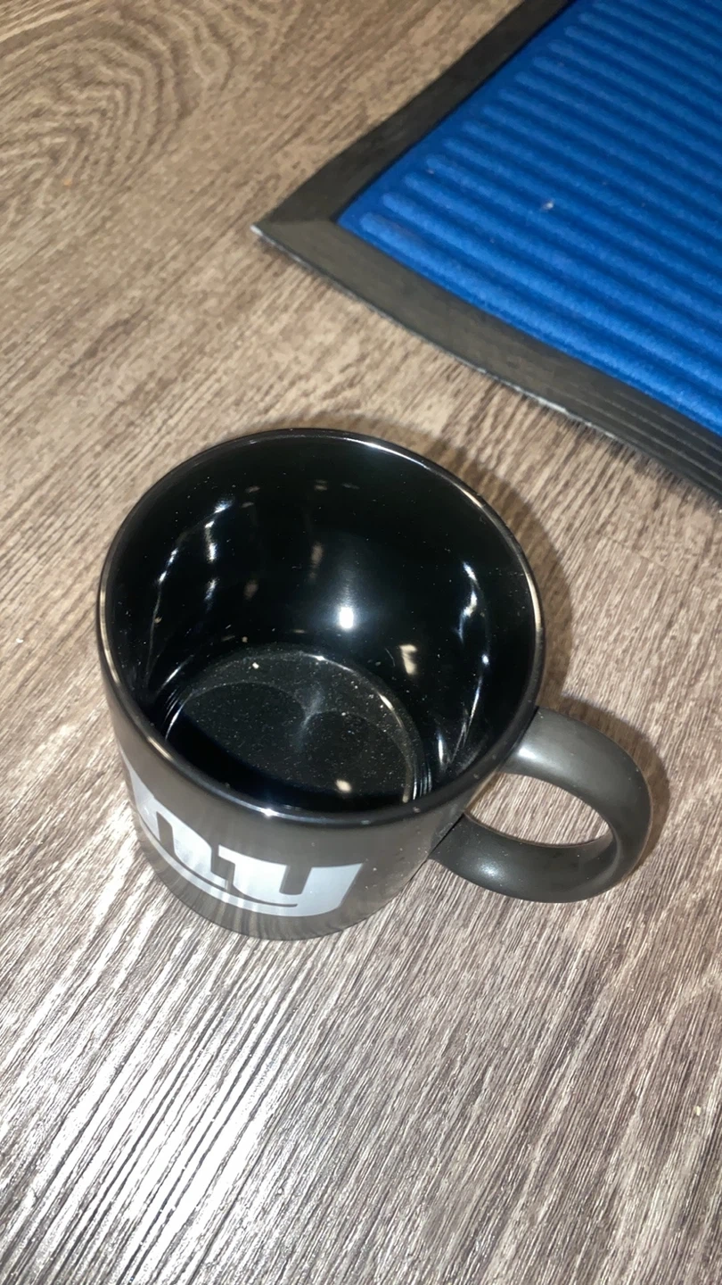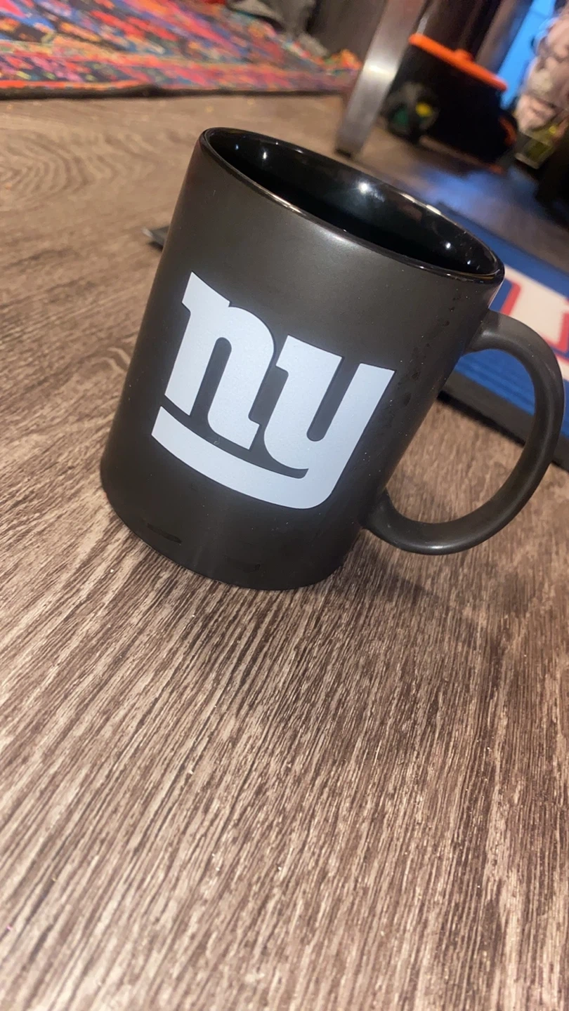 This black ceramic coffee mug features the New York Giants logo. It's 11oz and made in China. Hand wash only, not suitable for microwave or dishwasher.