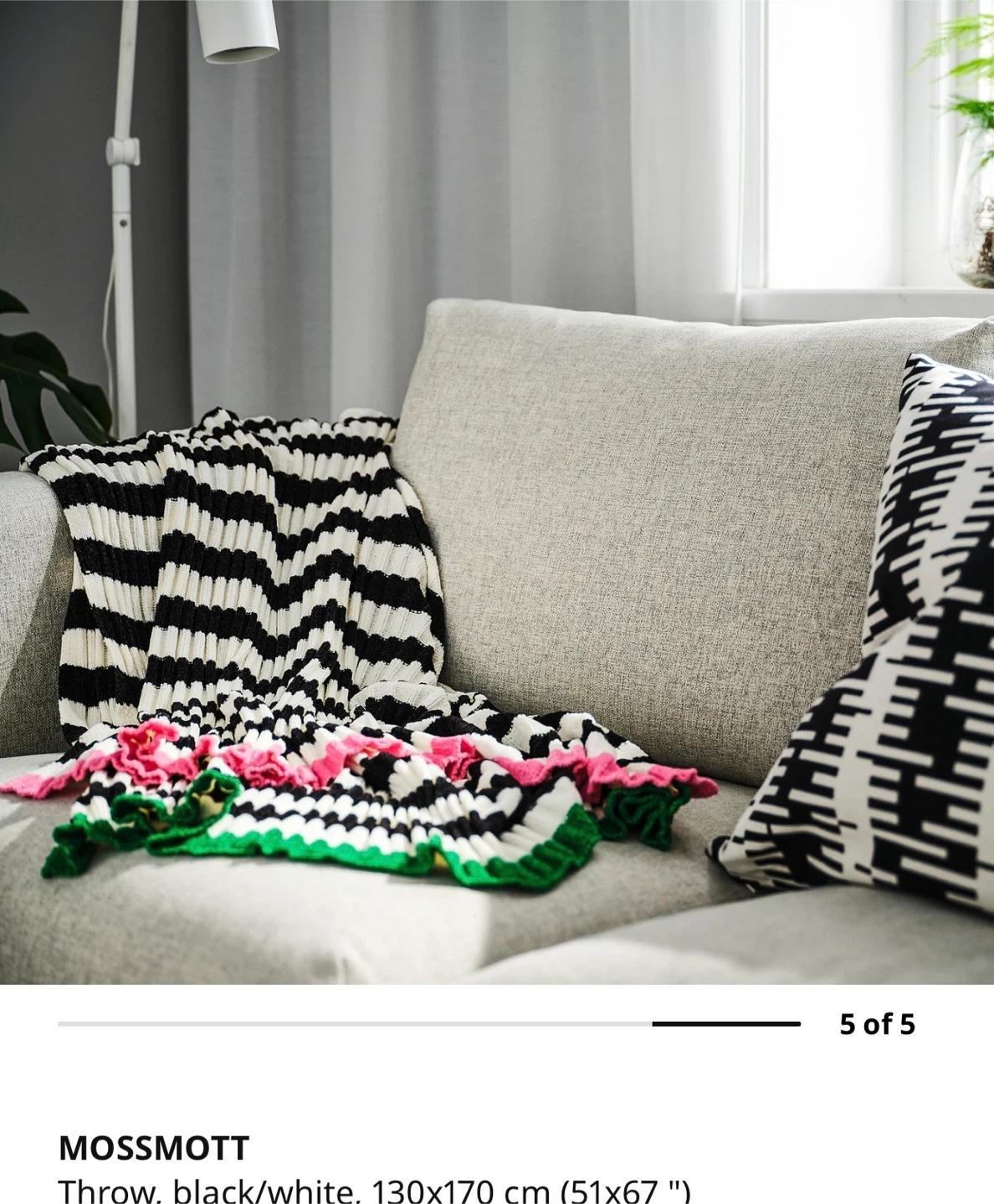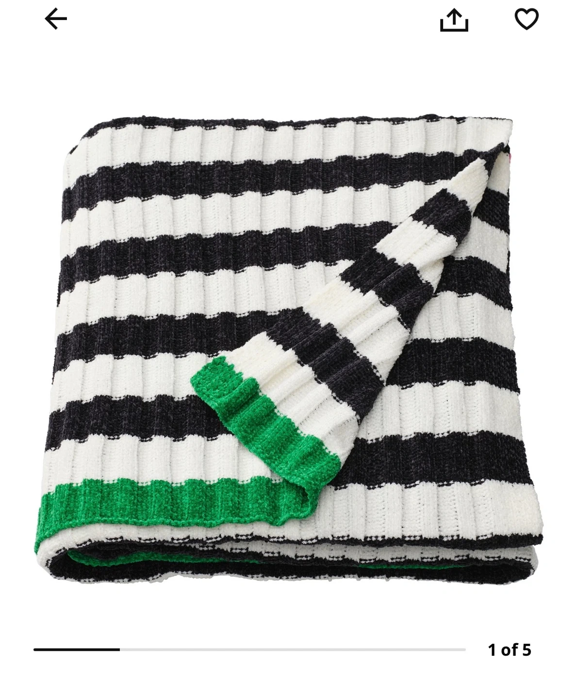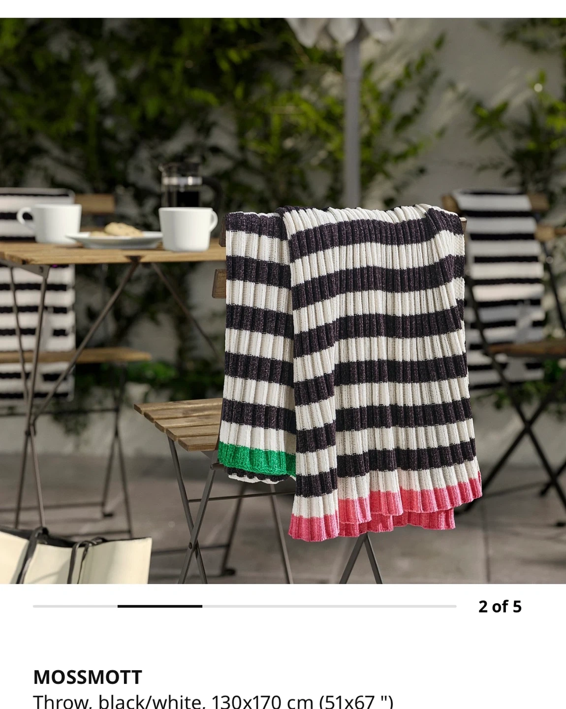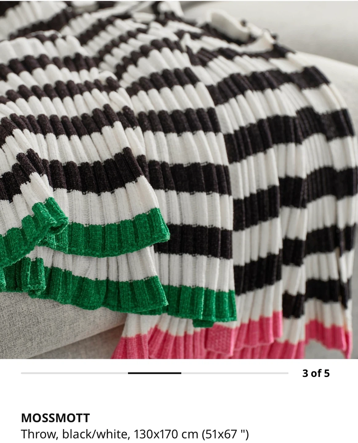 This MOSSMOTT throw blanket features a classic black and white striped design with vibrant green and pink accents. It's made of a soft knit material and measures 130 by 170 cm. It's perfect for adding a pop of colour and comfort to your couch or bed!