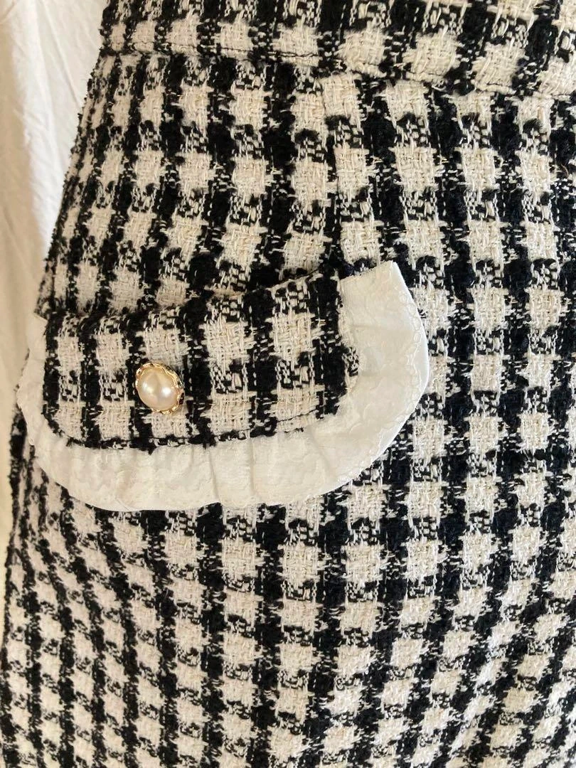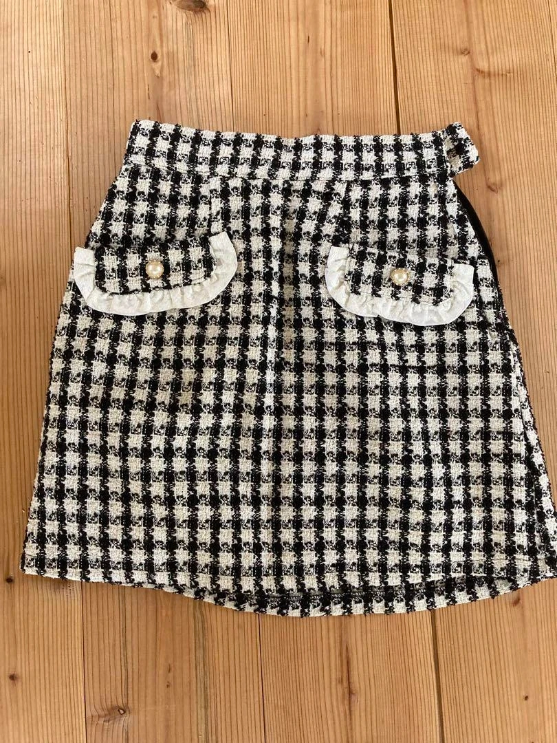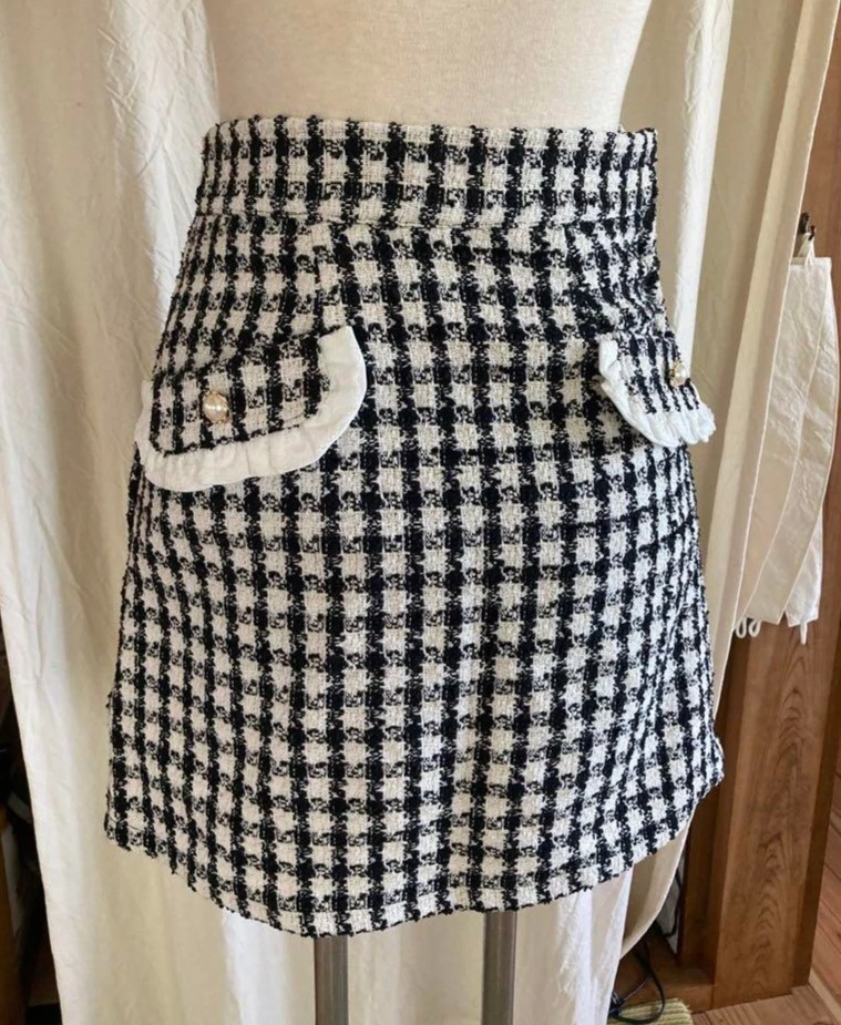 Honey Cinnamon (Japanese brand) houndstooth black and white mini skirt with elegant faux gold toned pearl buttons.