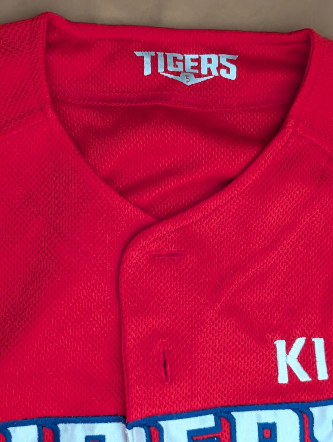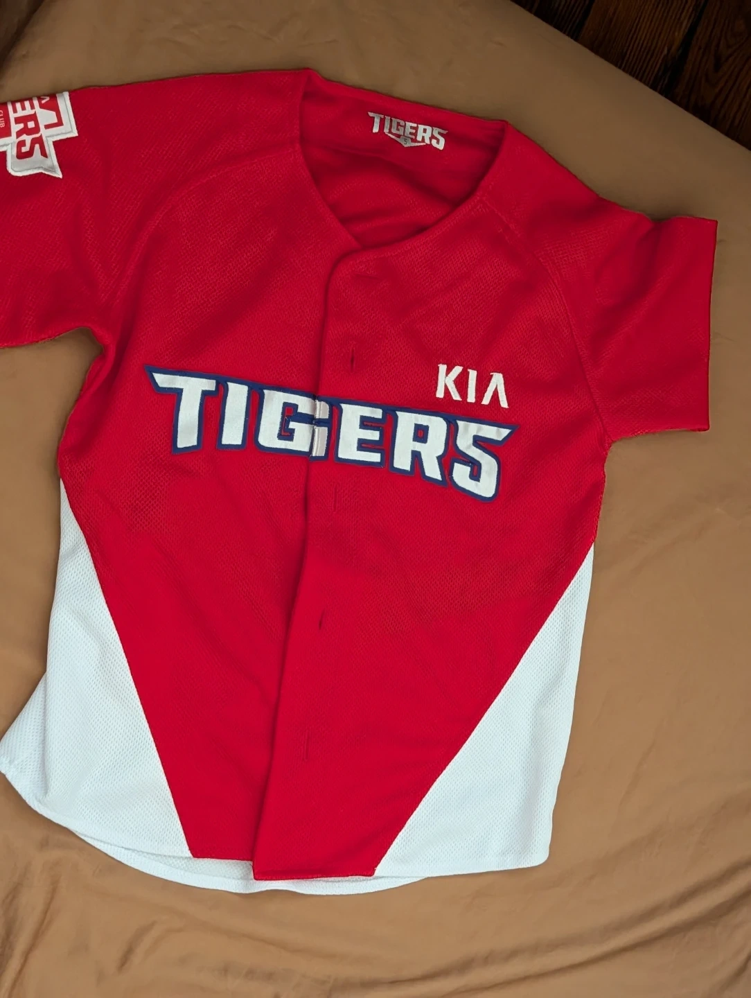 Red KIA Tigers baseball jersey. Features team name and logo. Short sleeves with button-up front. Made of breathable mesh fabric. Size5-6y