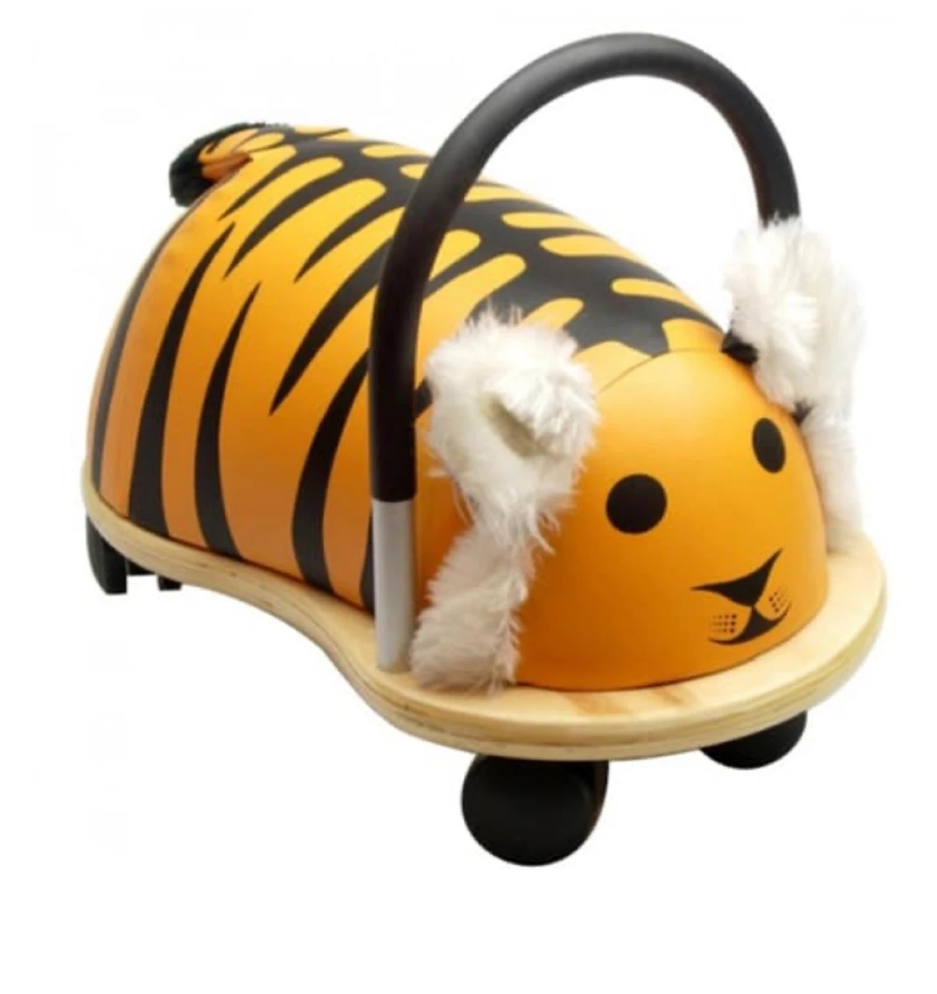 This is a Wheely Bug ride-on toy! It's in great condition and ready for a new home. The toy features a fun tiger design and is perfect for toddlers learning to scoot around. It has a wooden base and a soft, padded body for comfortable riding