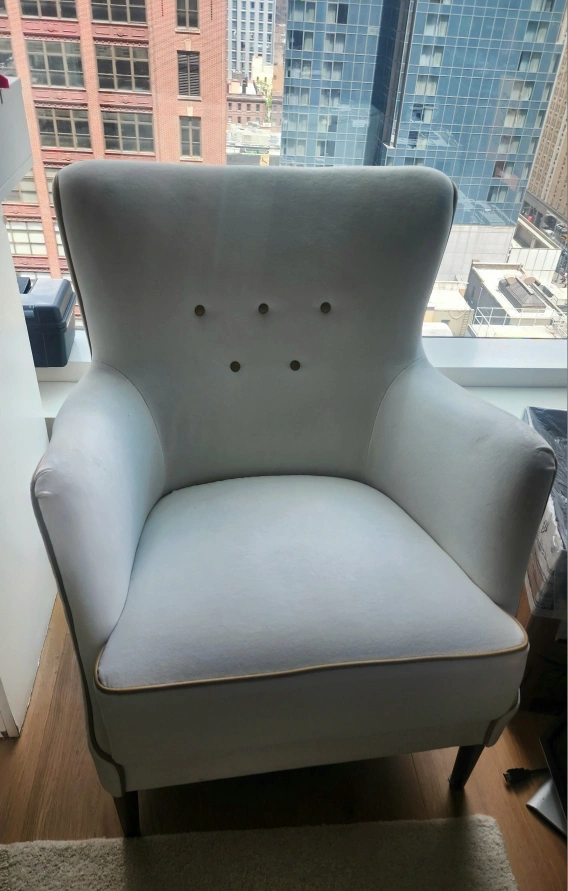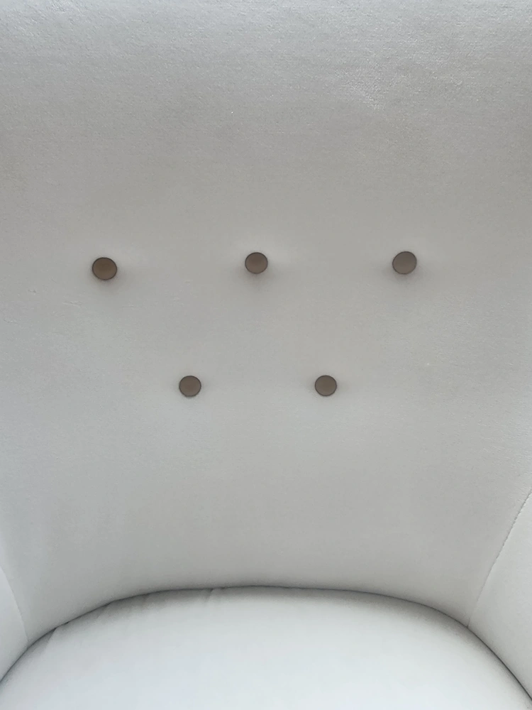 Modern White Velvet Accent Chair (Great Condition!) Upgrade your space with this stylish modern accent chair! Upholstered in soft white velvet with a high back and elegant button tufting, it’s perfect for a cozy reading nook, bedroom corner, or living room statement piece. Features: Plush white velvet fabric — comfy & chic Sleek dark wood legs Mid-century modern vibe with a timeless silhouette Sturdy and comfortable — no wobbles! Used gently and kept in a smoke-free, pet-free home. Minor signs of normal use but overall in excellent condition. Dimensions: Approx. 32”H x 25”W x 20”D (please measure your space!) ✅ Local pickup only — elevator building for easy move-out. ✅ Cash Preferred. Send me a message if you’re interested — grab it before it’s gone!
