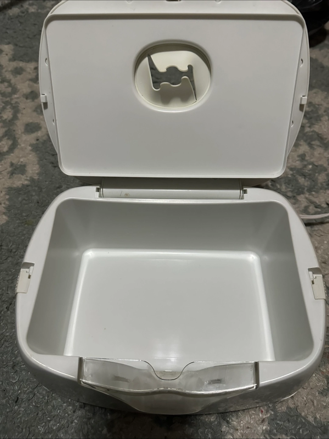 65A white wipes warmer. It has a round, button-like feature on the top with a symbol. The warmer opens to reveal the inside. With this, your little one can have their wipes warm and ready to go.