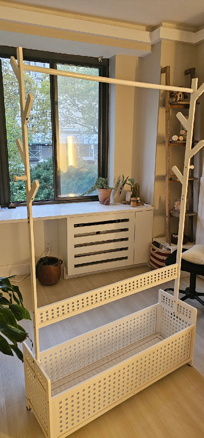 36Selling a white clothes rack with a storage basket at the bottom. It's a great way to organize your clothes and keep them off the floor. Perfect for small spaces! wide 12 tall 66 width 39