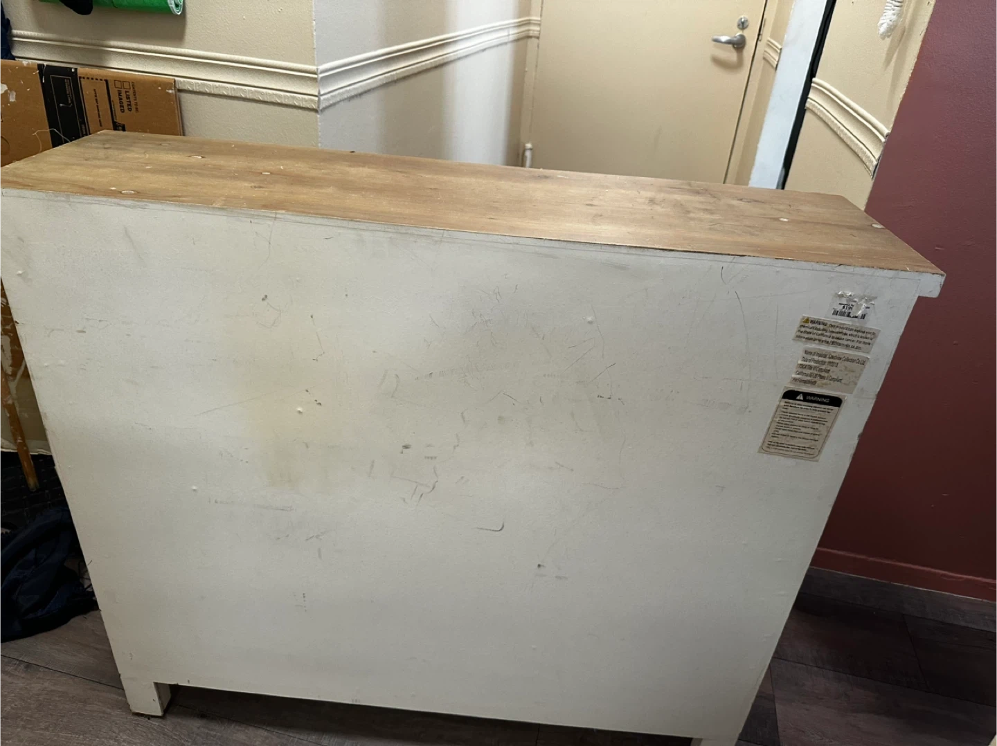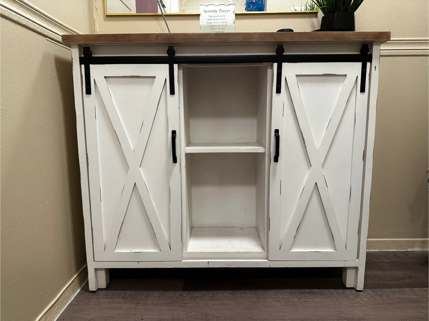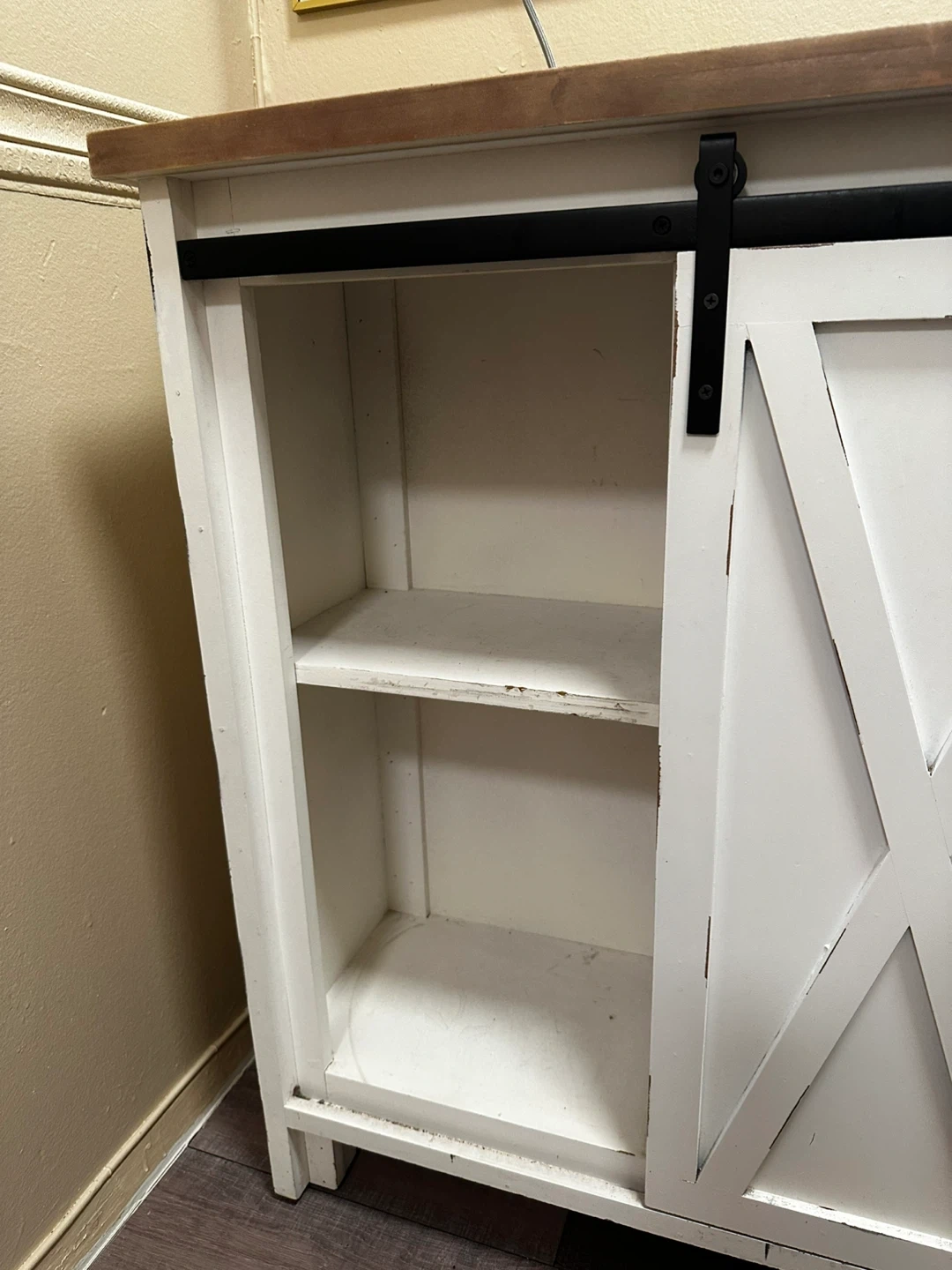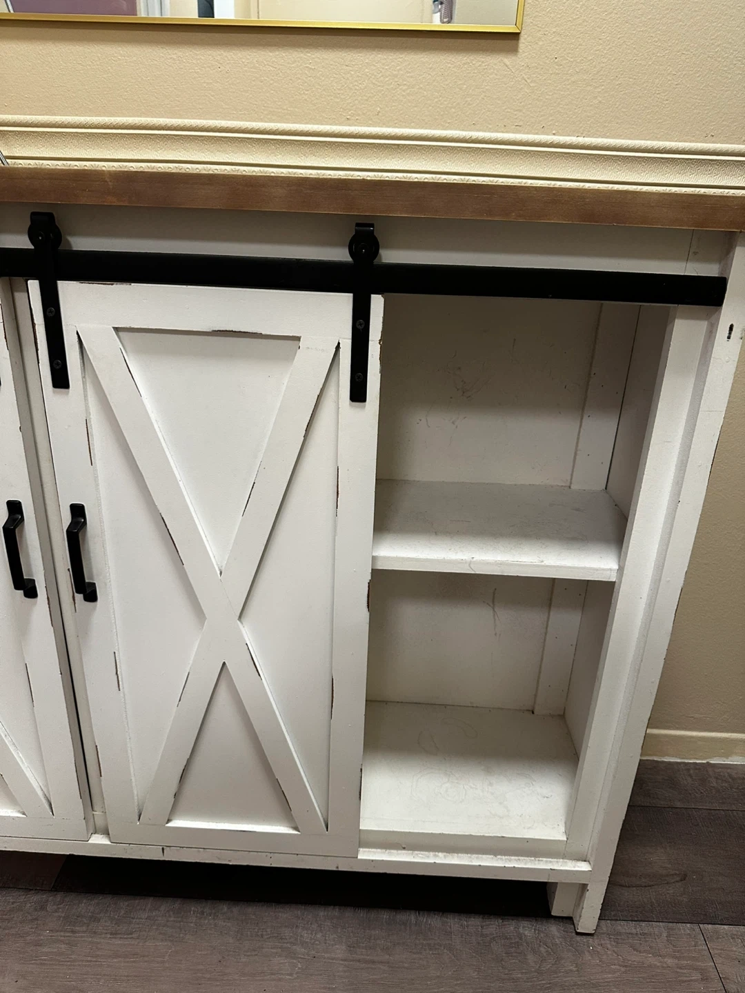 This cabinet features a white finish and a wooden top, offering both style and functionality. It has interior shelves for storage, making it great for organizing your belongings. Very used, but so a great addition… 42L x 36H x 12W OBO