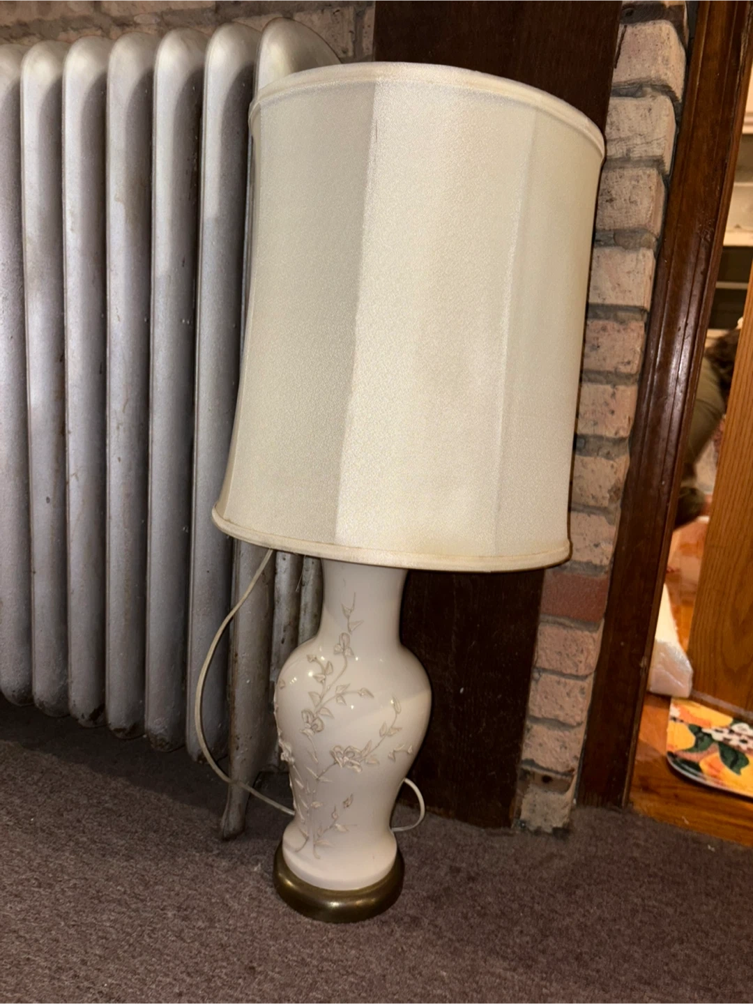 Here's a lovely table lamp with a floral design on a white base. The cover is a little scratched but overall good. It would be a great addition to any room!