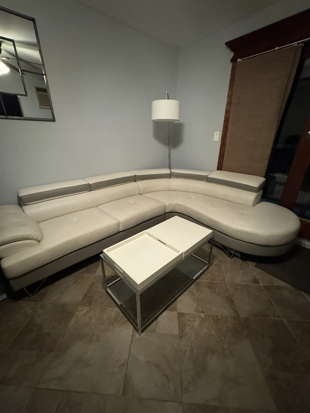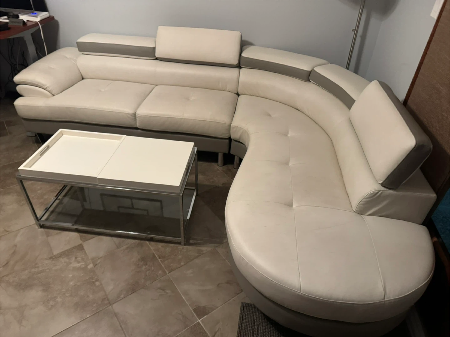 10Selling a comfortable white leather sectional sofa! It's in good condition and would be a great addition to any living room. The sectional design offers plenty of seating space for family and friends and has adjustable headrests. Also including matching coffee table with adjustable flip treys. Feel free to reach out if you're interested!