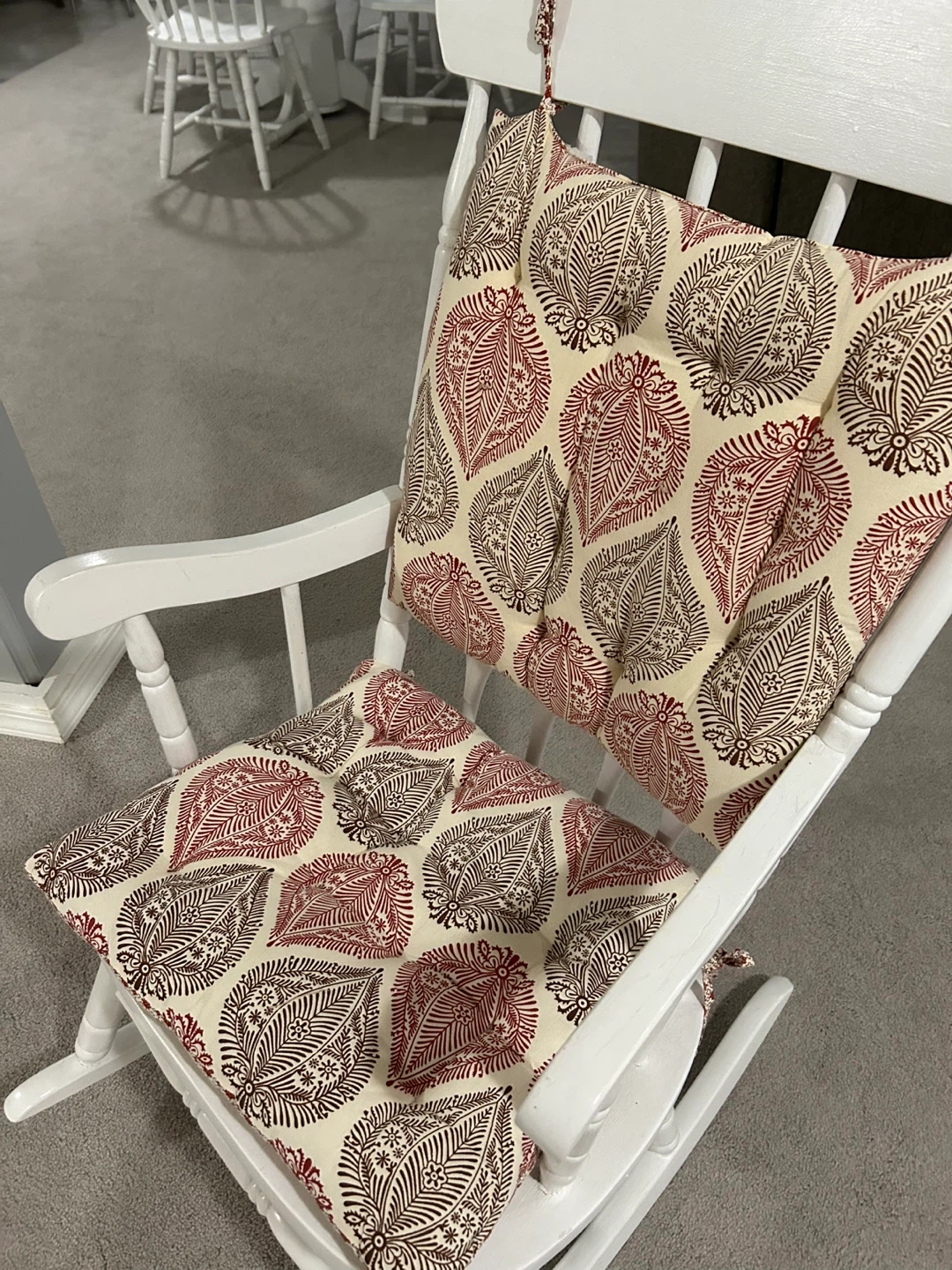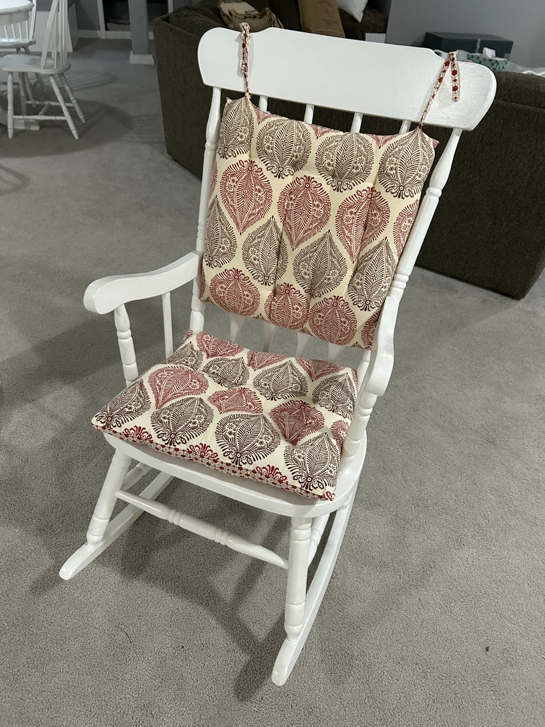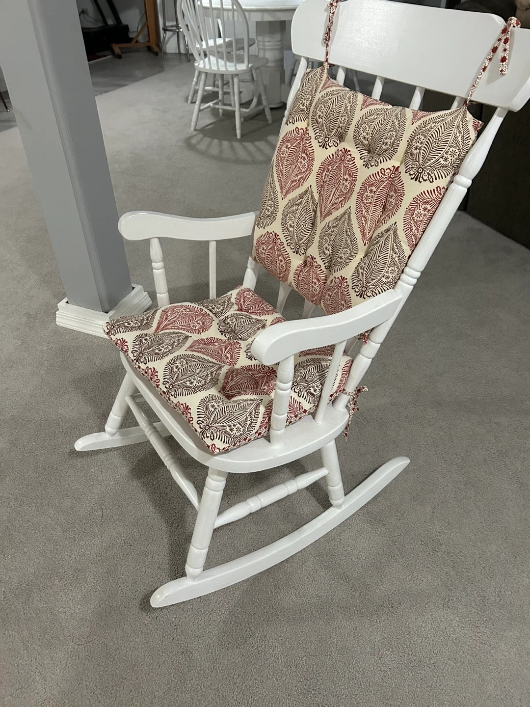 10Selling a gently used white rocking chair. It comes with patterned cushions for the seat and back, adding a cozy touch to any room! The chair is sturdy and in great condition, perfect for relaxing.