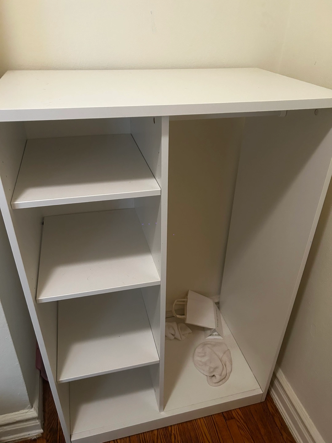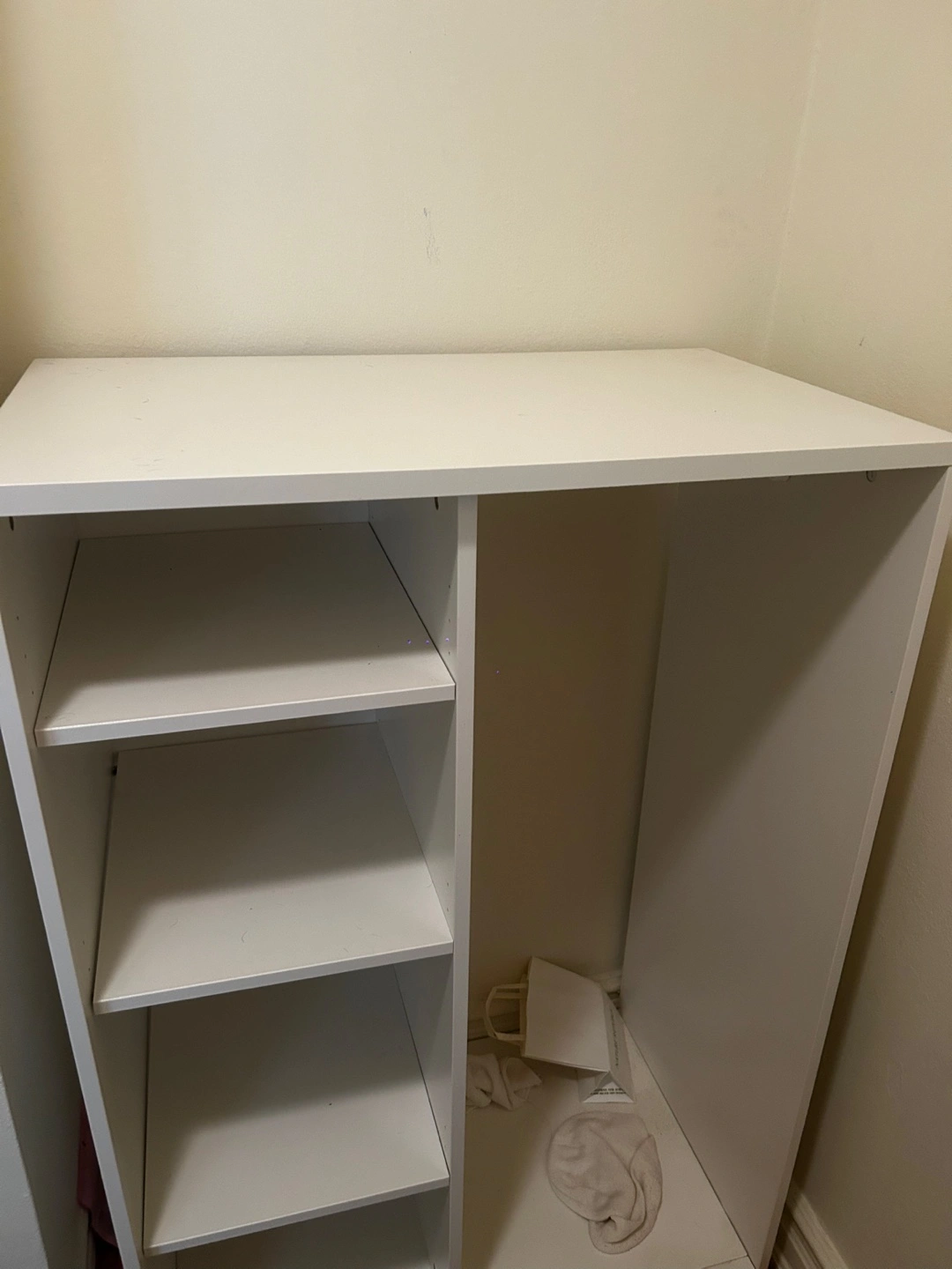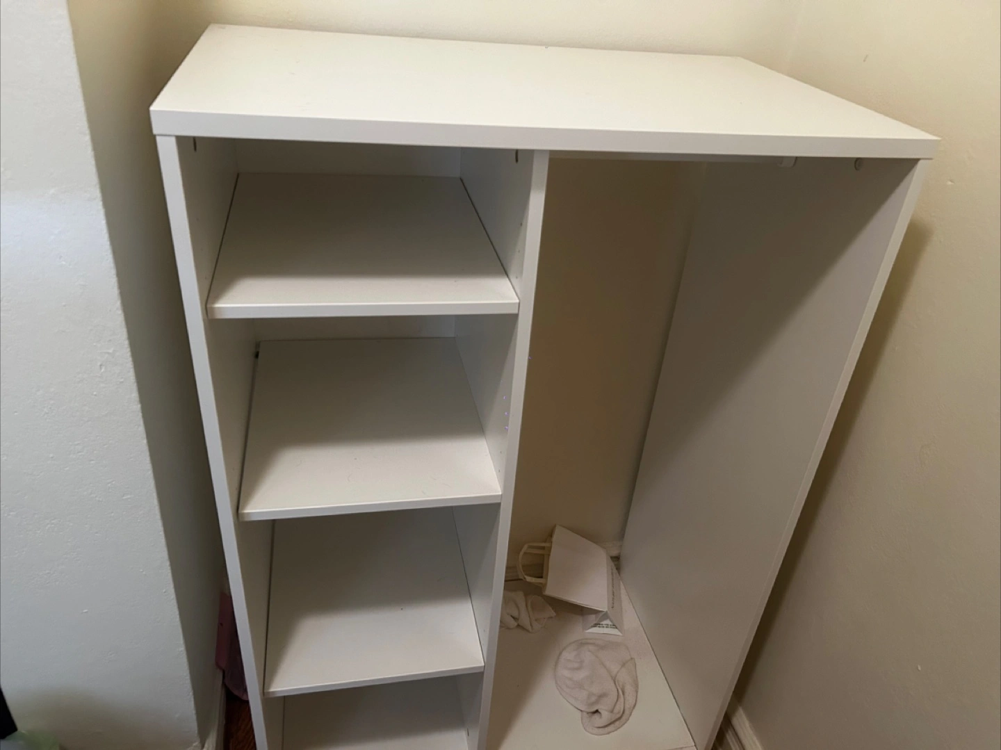 White shelf unit with shelves on the left and a large open space on the right. The unit appears to be a bright white color. It's a great item to use for storage and organization, helping create a space for relaxation.