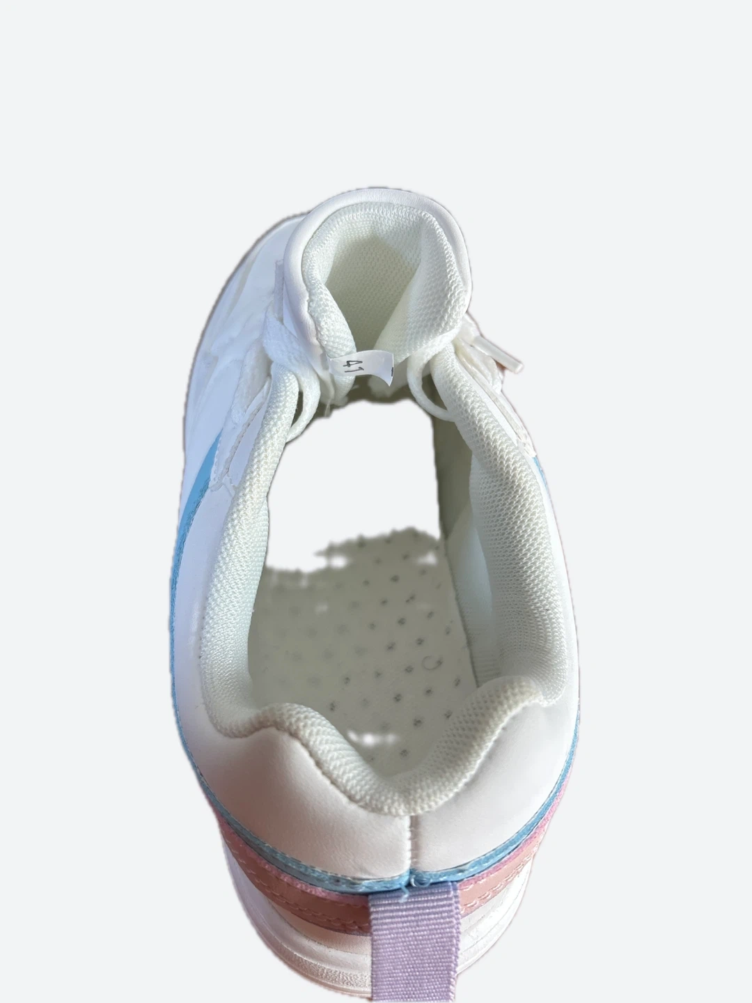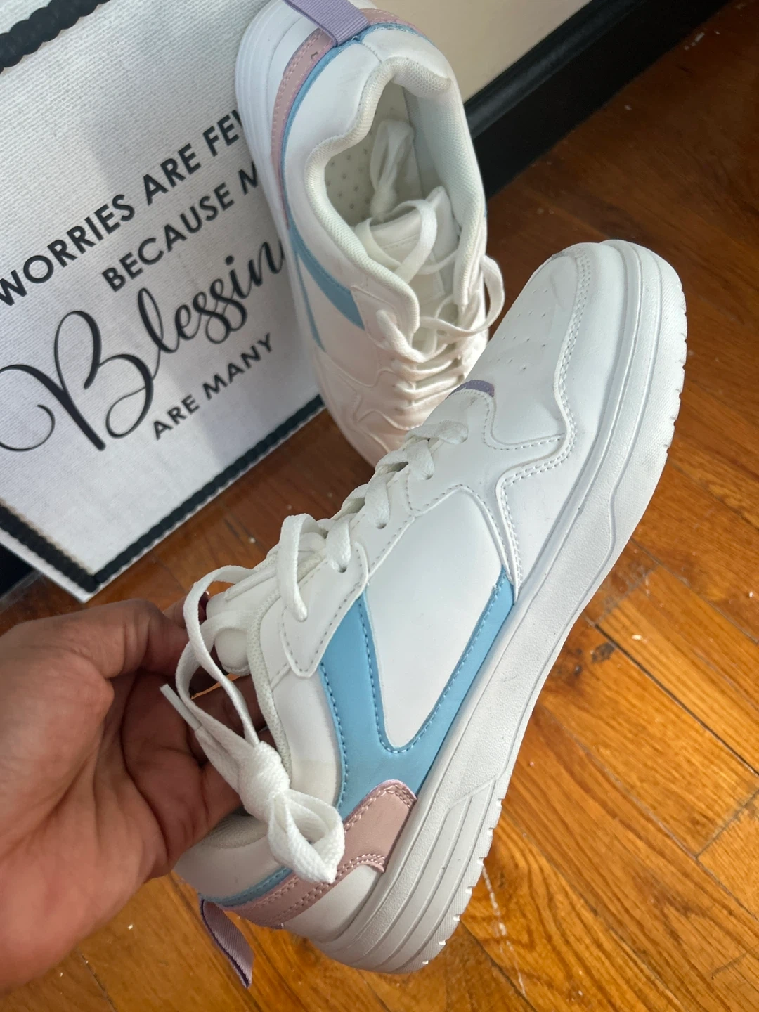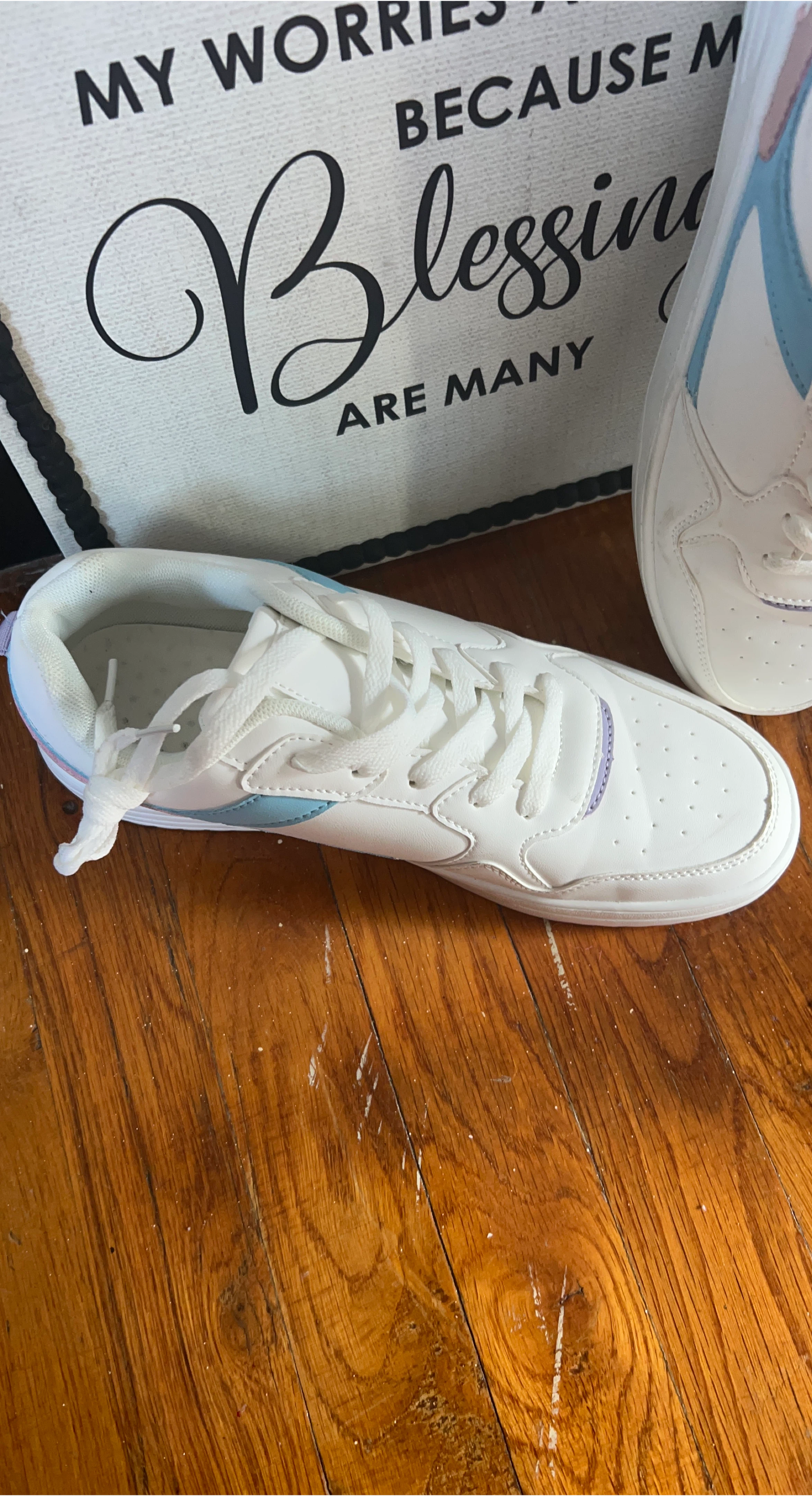60These sneakers are in great condition and ready for a new home! They're white with cute blue and pink accents, perfect for adding a pop of color to any outfit