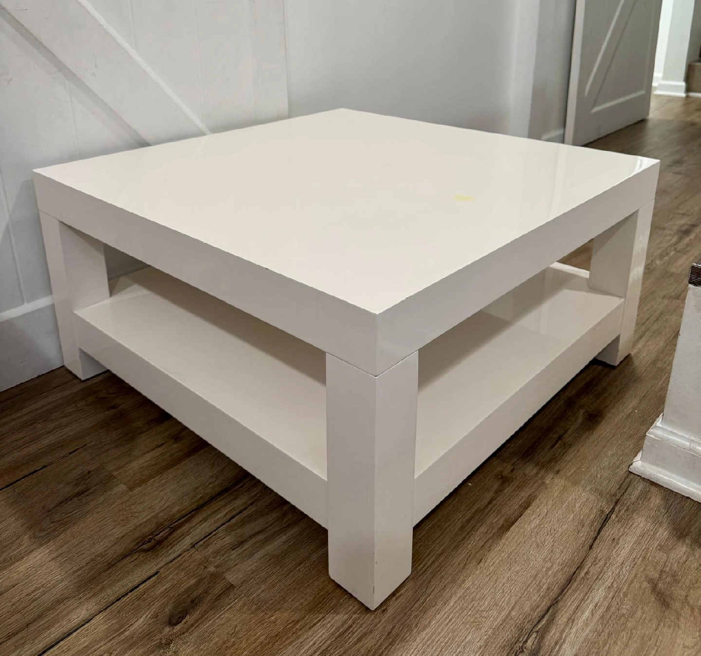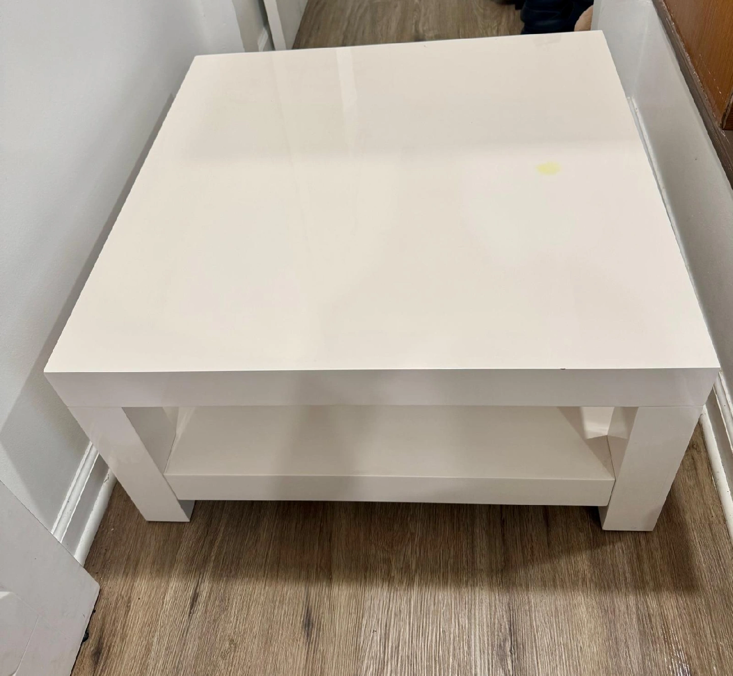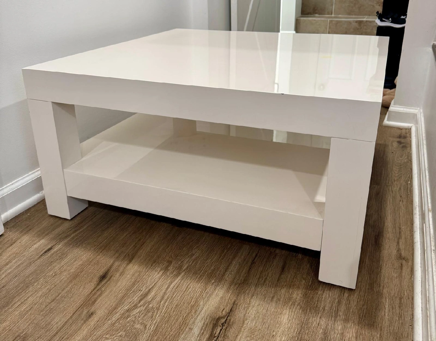 Selling a white square coffee table. It has a shelf underneath for storage or decoration. This table is sturdy and in good condition, ready to add a clean, modern touch to your living room