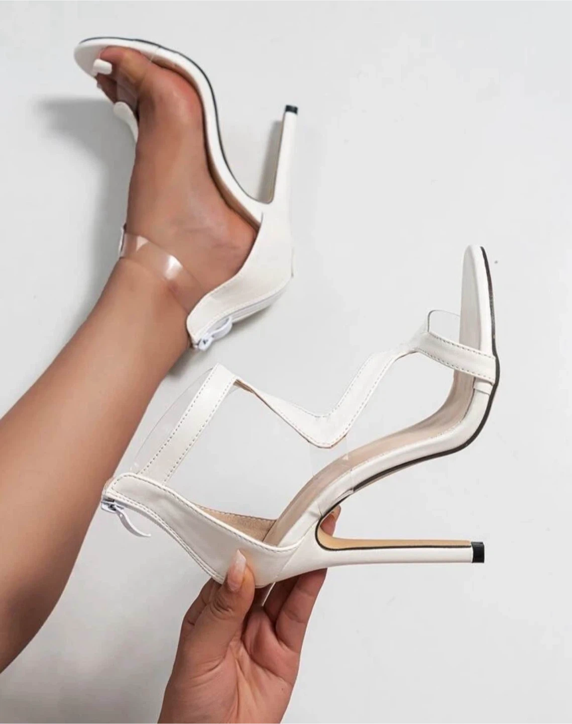 These are a pair of stylish white stiletto heels featuring clear straps. They have a sleek design and would be a great addition to any wardrobe!