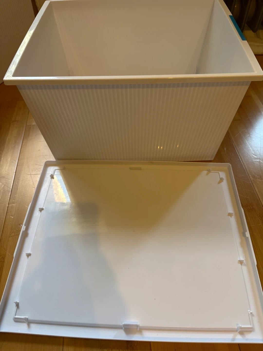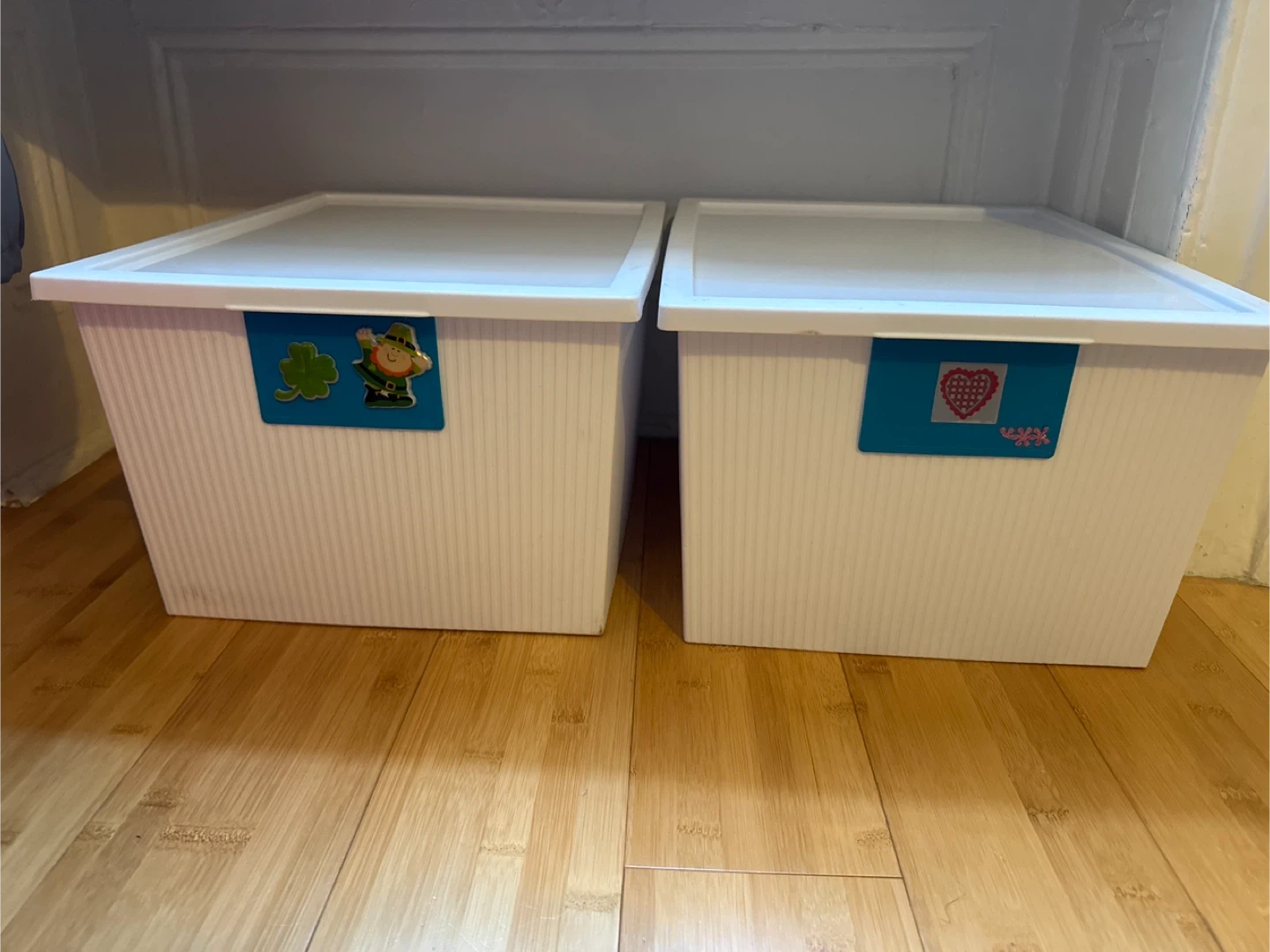 I'm selling a set of two white storage bins, each with a lid. They are in great shape and ready to help you organize your space. Perfect for storing clothes, toys, or anything else you need to keep tidy Exchanges and refunds are not allowed.