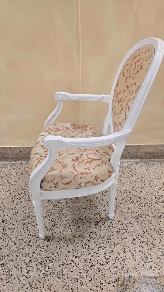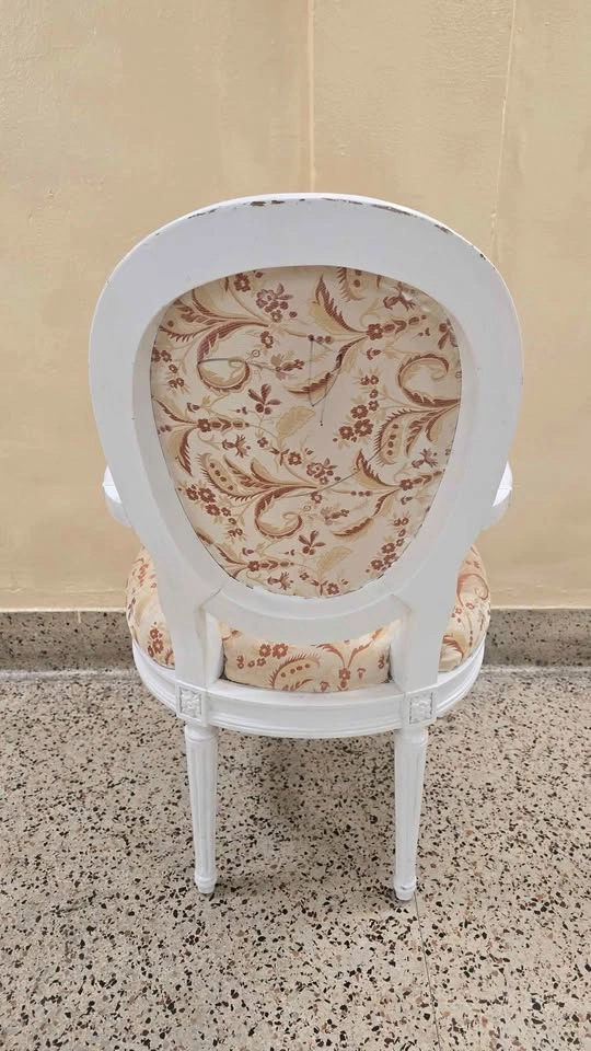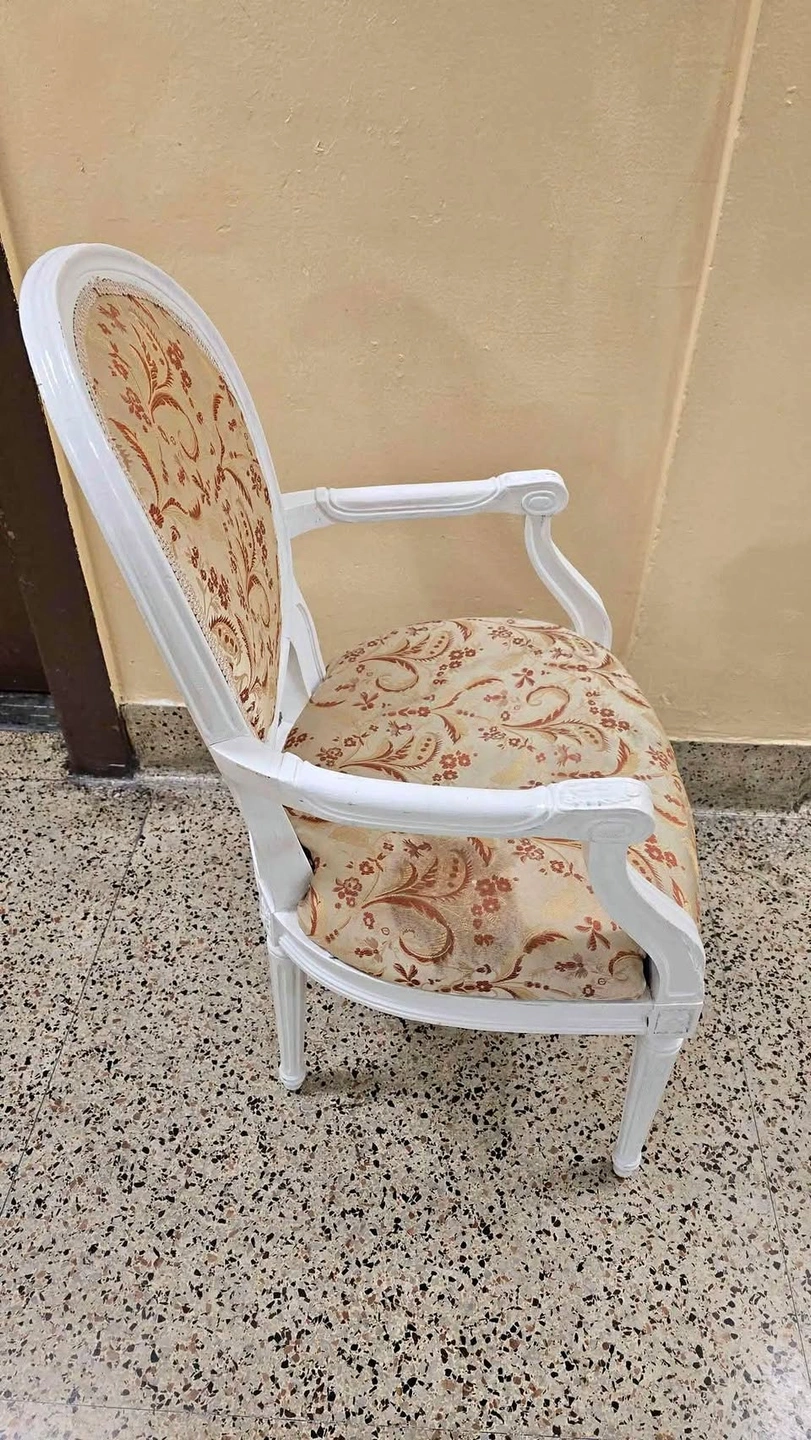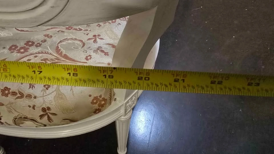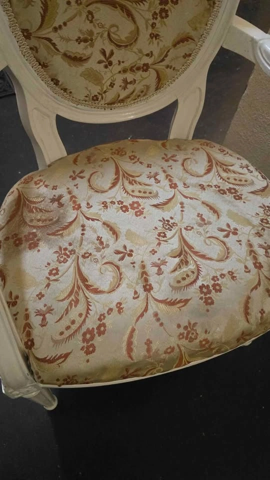 10Beautiful antique wooden sitting chair with cushioned seat and back, adorned with delicate lace fringing. Please note that there is a visible stain on the rear of the seat (as shown in picture 9) and some chipping along the edges of the wood due to age and use. Despite this, the chair remains sturdy and has a solid weight. Located in Hudson Heights, near 181st St and Broadway in an elevator building. Looking to sell ASAP as no longer needed, will accept best offer.