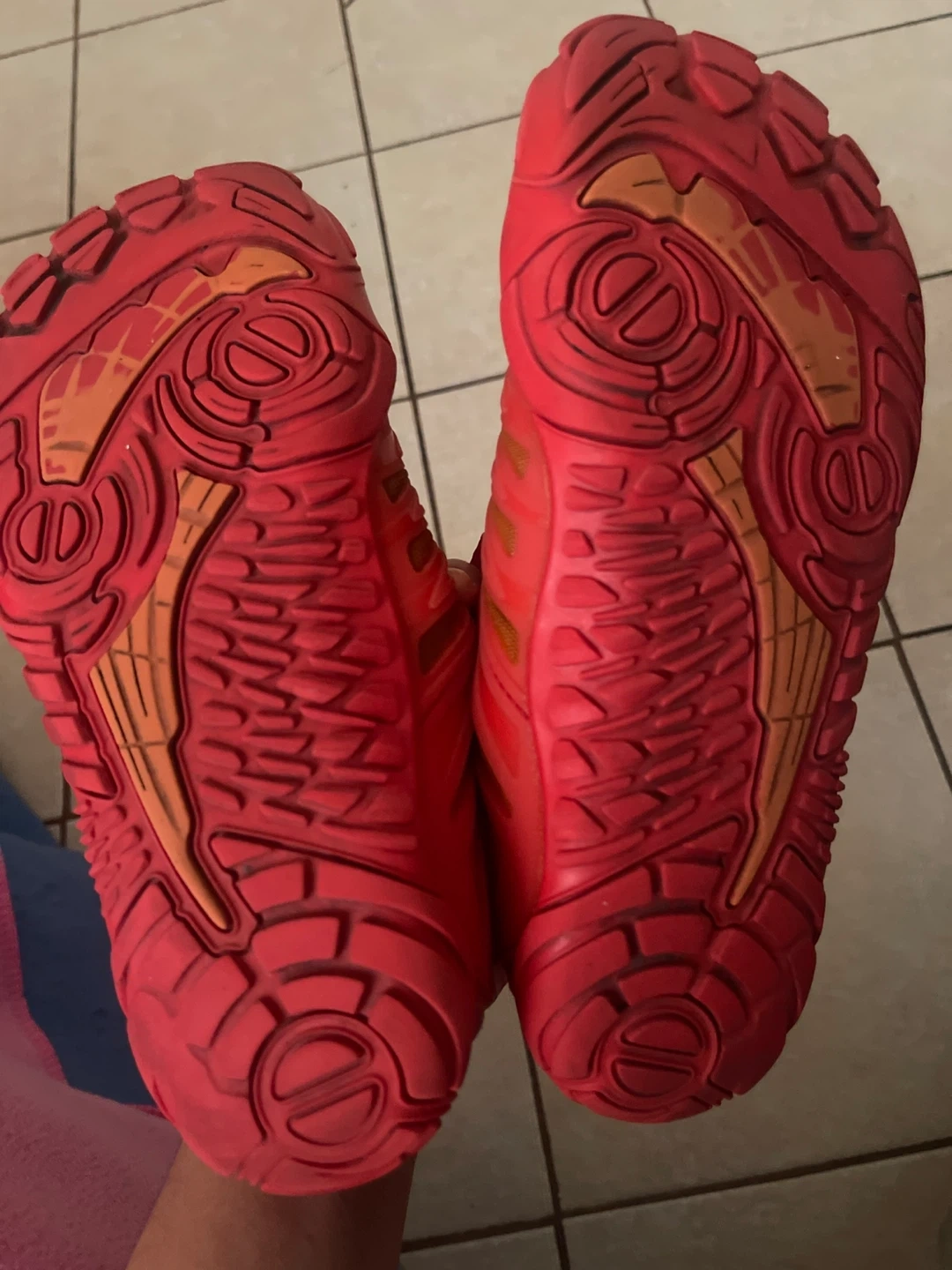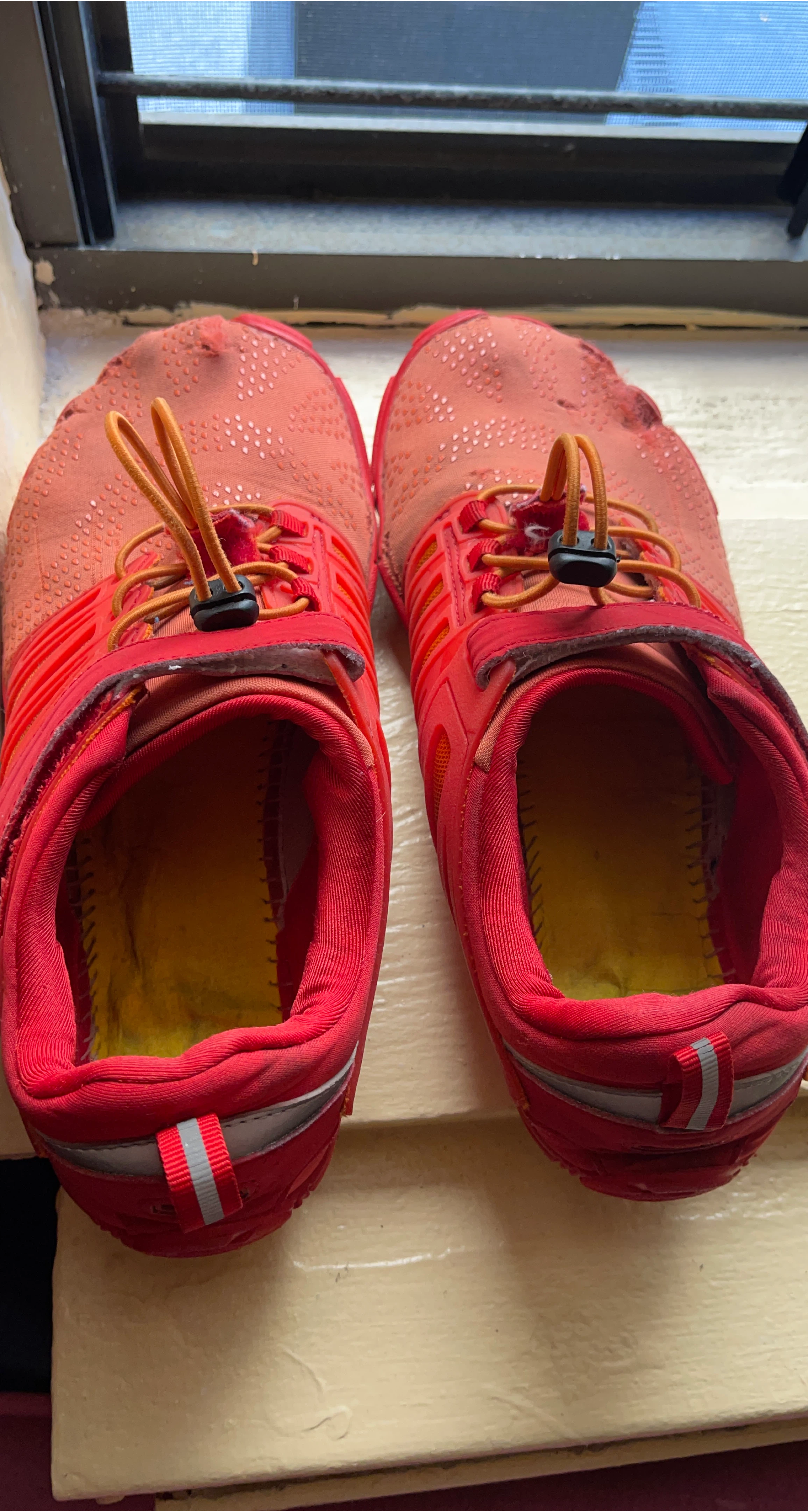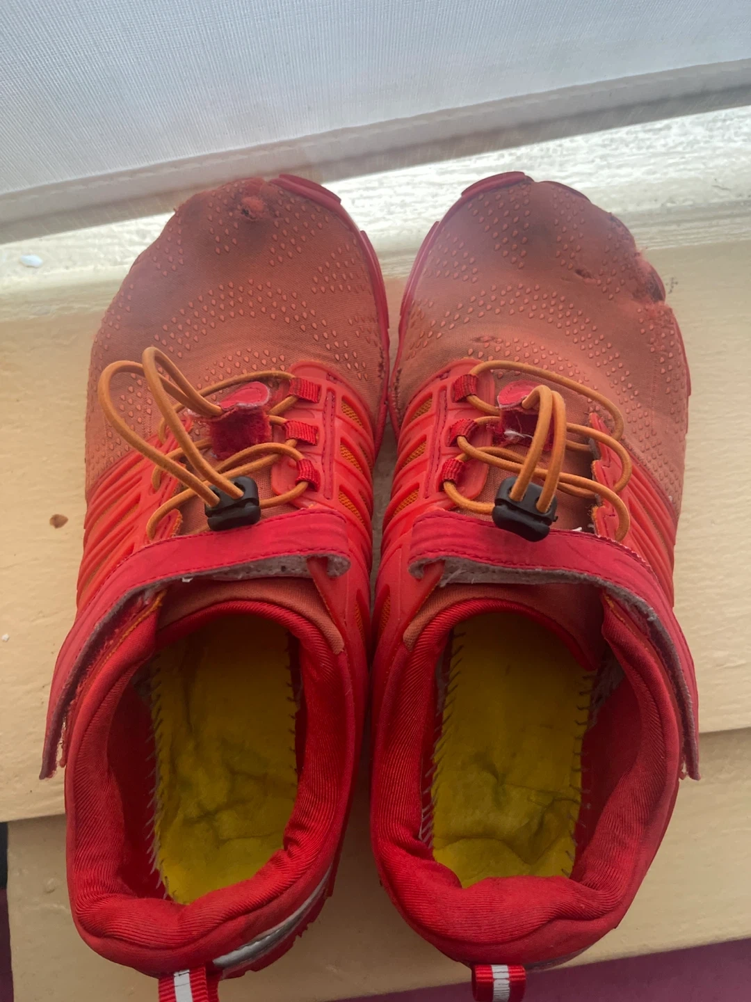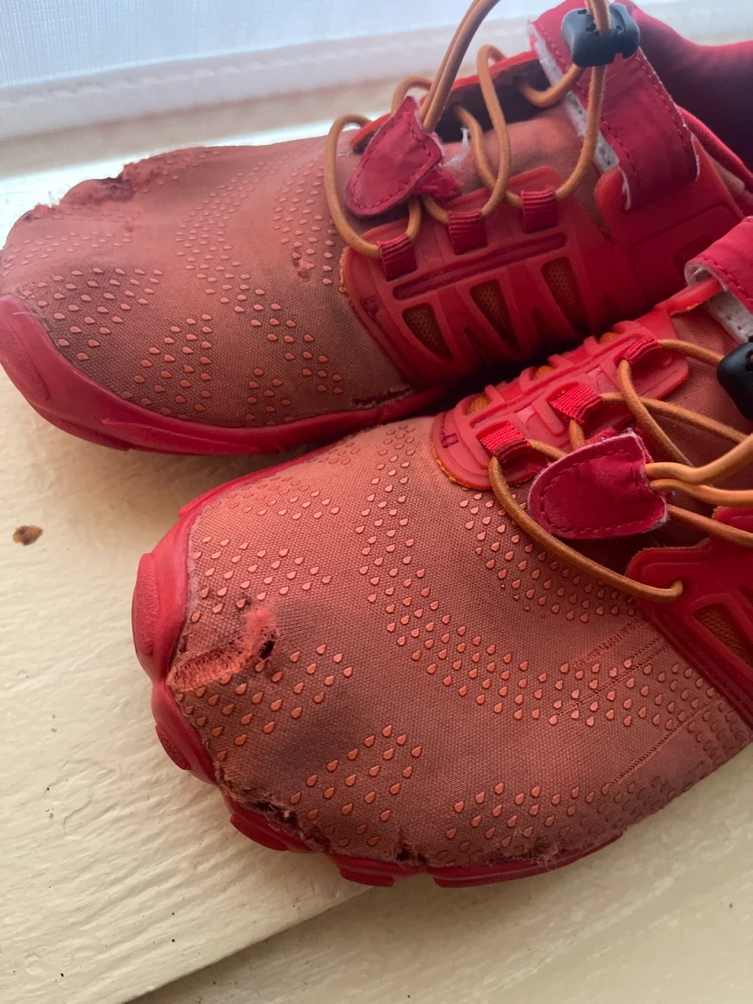 Minimalist design. Red/Orange color. Heavily worn with visible holes, fraying at the toes, & dirt buildup. The insides still look usable with a little bit of wrinkling and discoloration. No insoles. Will wash and dry em
