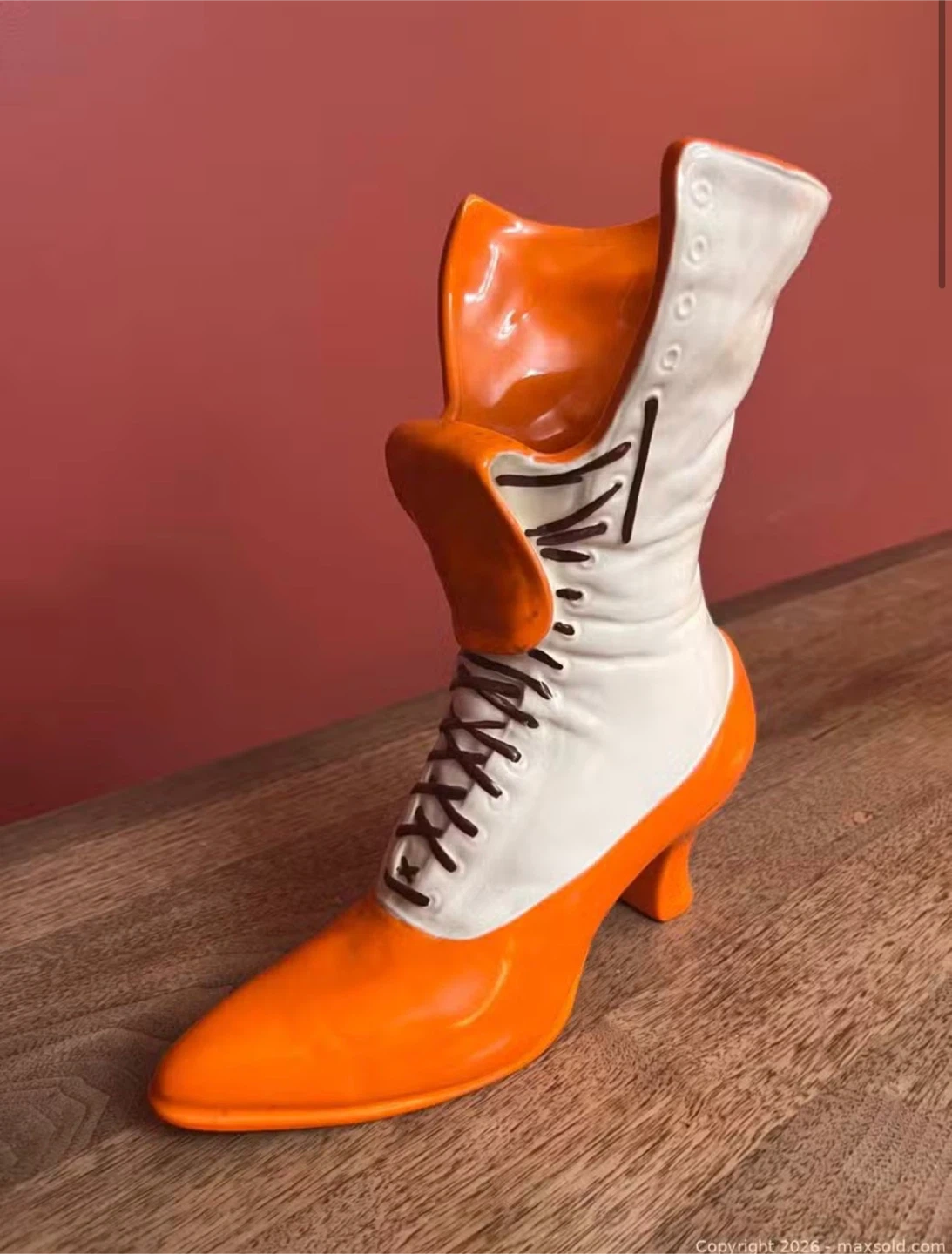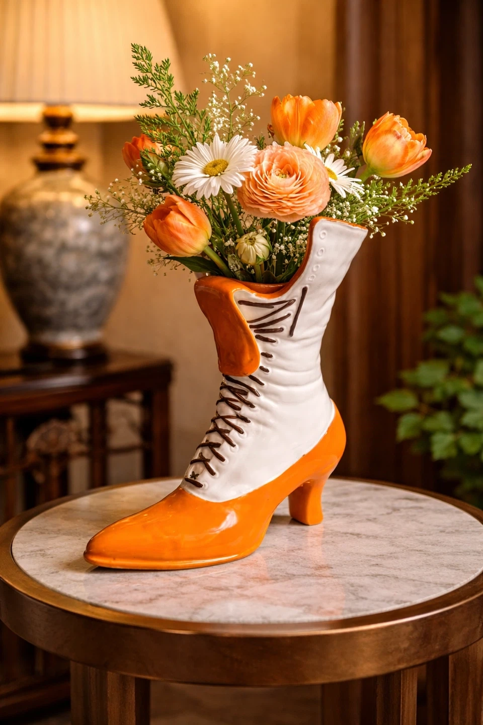 This ceramic vase is shaped like a classic Victorian boot. It features a striking orange and white colourway with lace-up detailing. It's perfect for displaying flowers!