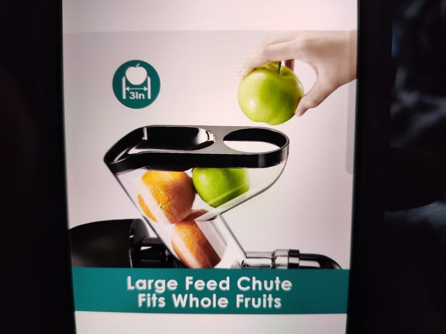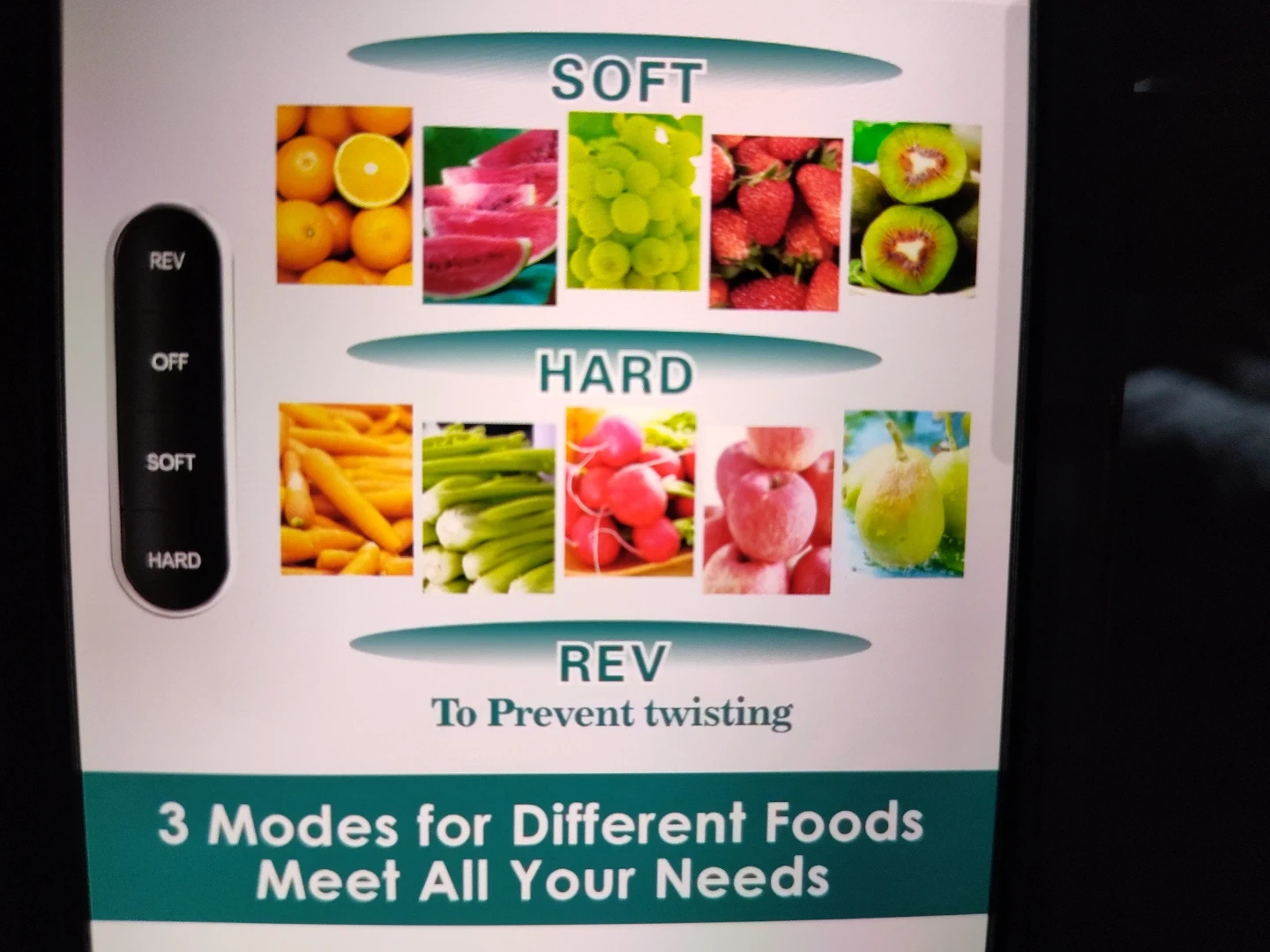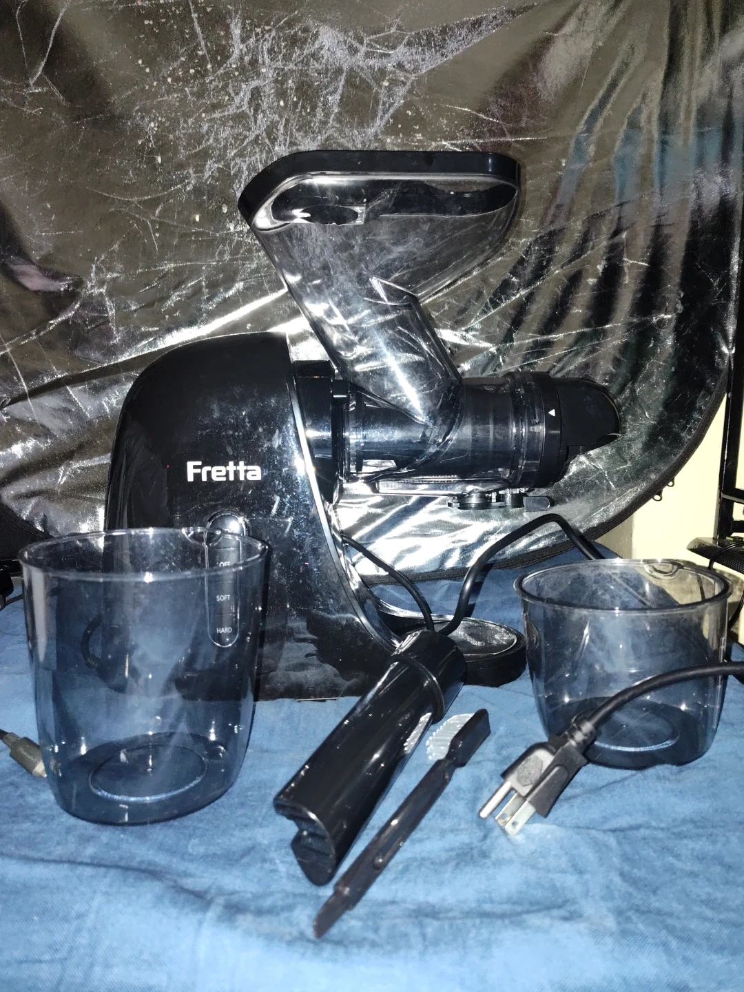 This Fretta juicer has a large feed chute that fits whole fruits. It's designed for high juice yield and offers 3 modes for different foods. Includes two cups and a cleaning brush.