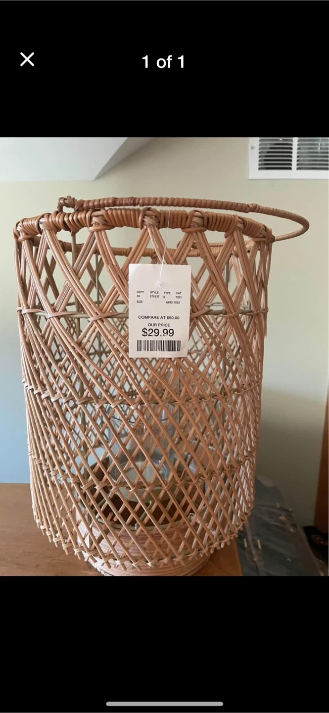 This wicker lantern with a glass insert is in great condition! The tag shows it was originally priced at $50, but I'm selling it for less. It's a stylish piece that would look great in any room