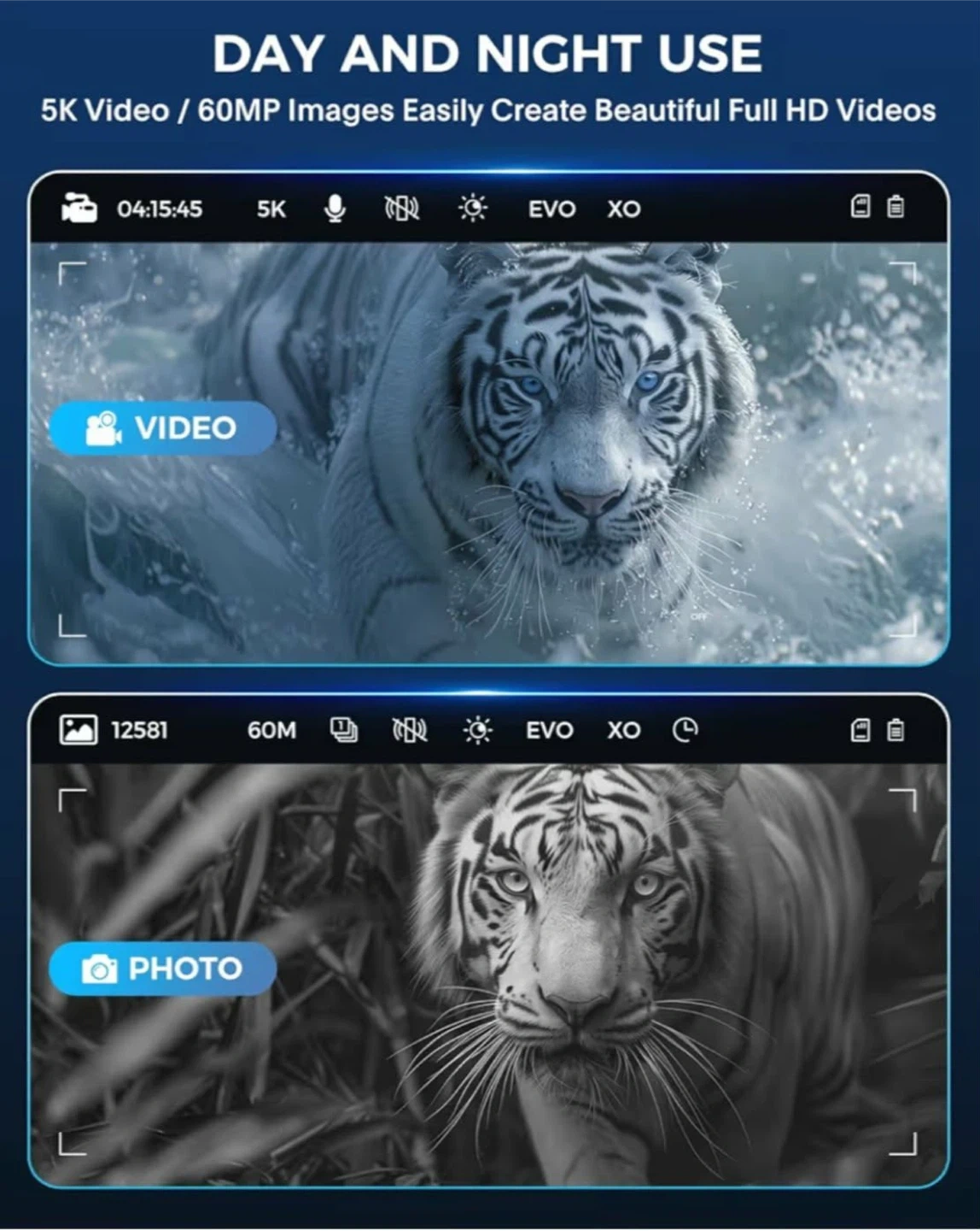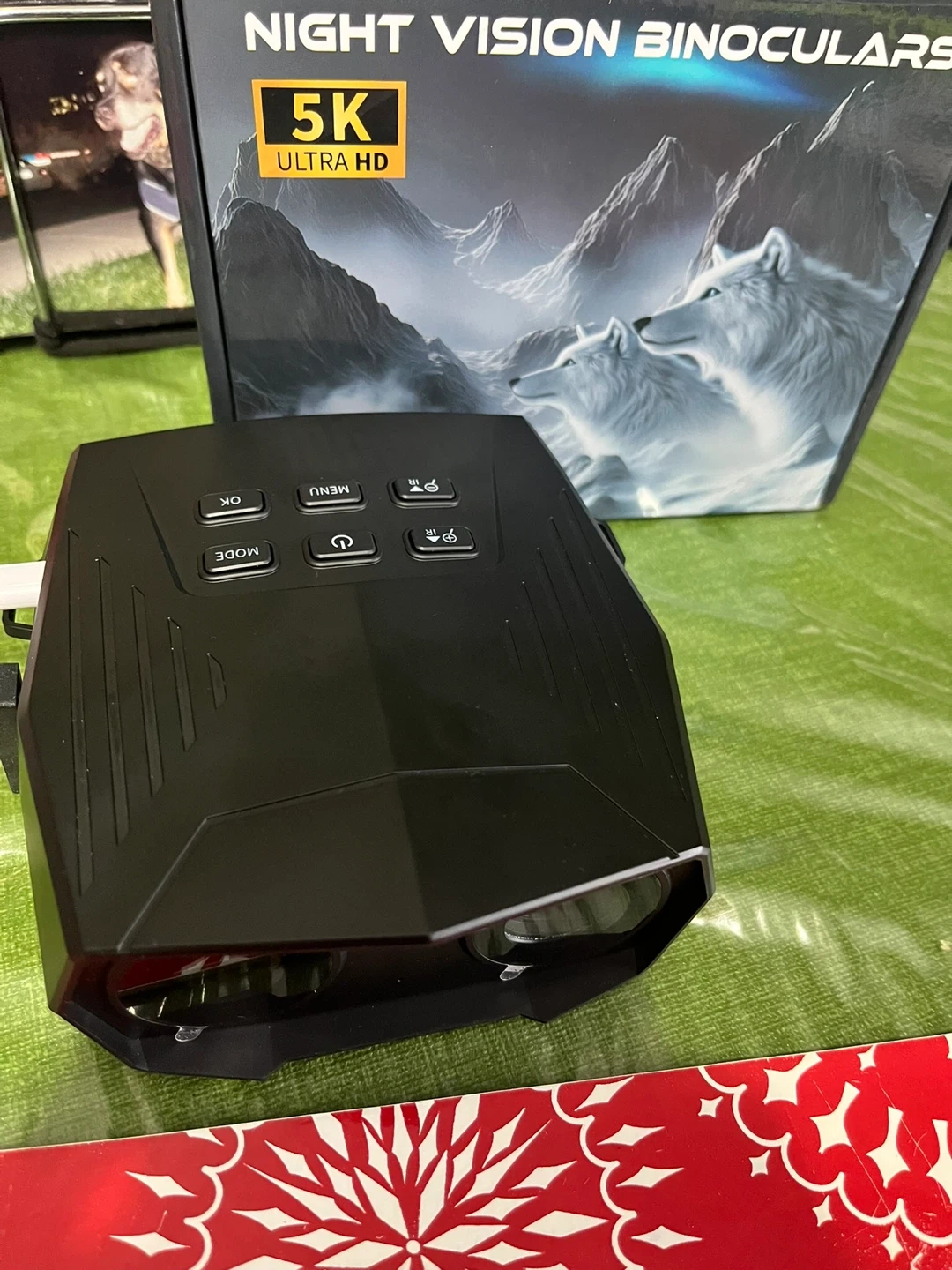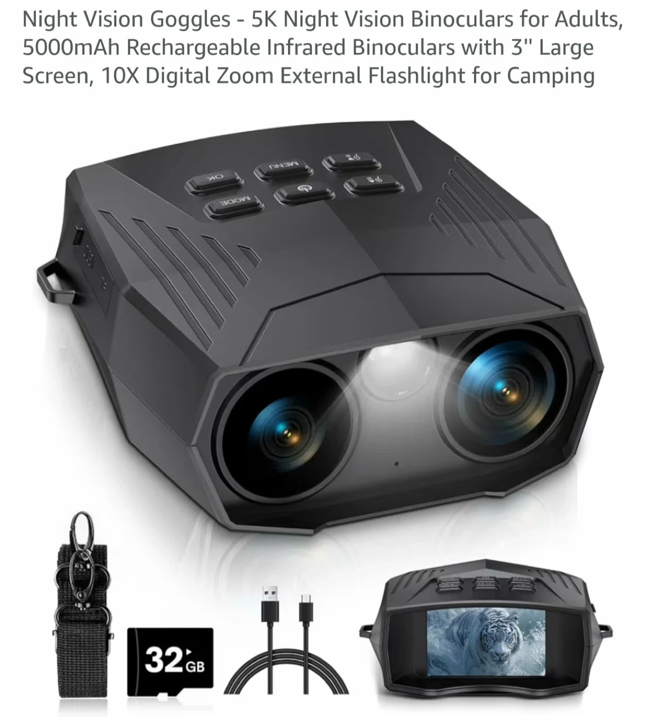 Night vision binoculars for adults with 5K resolution and 10x digital zoom. It features a 3" screen and a 5000mAh rechargeable battery. Includes a 32GB card and USB charging cable.