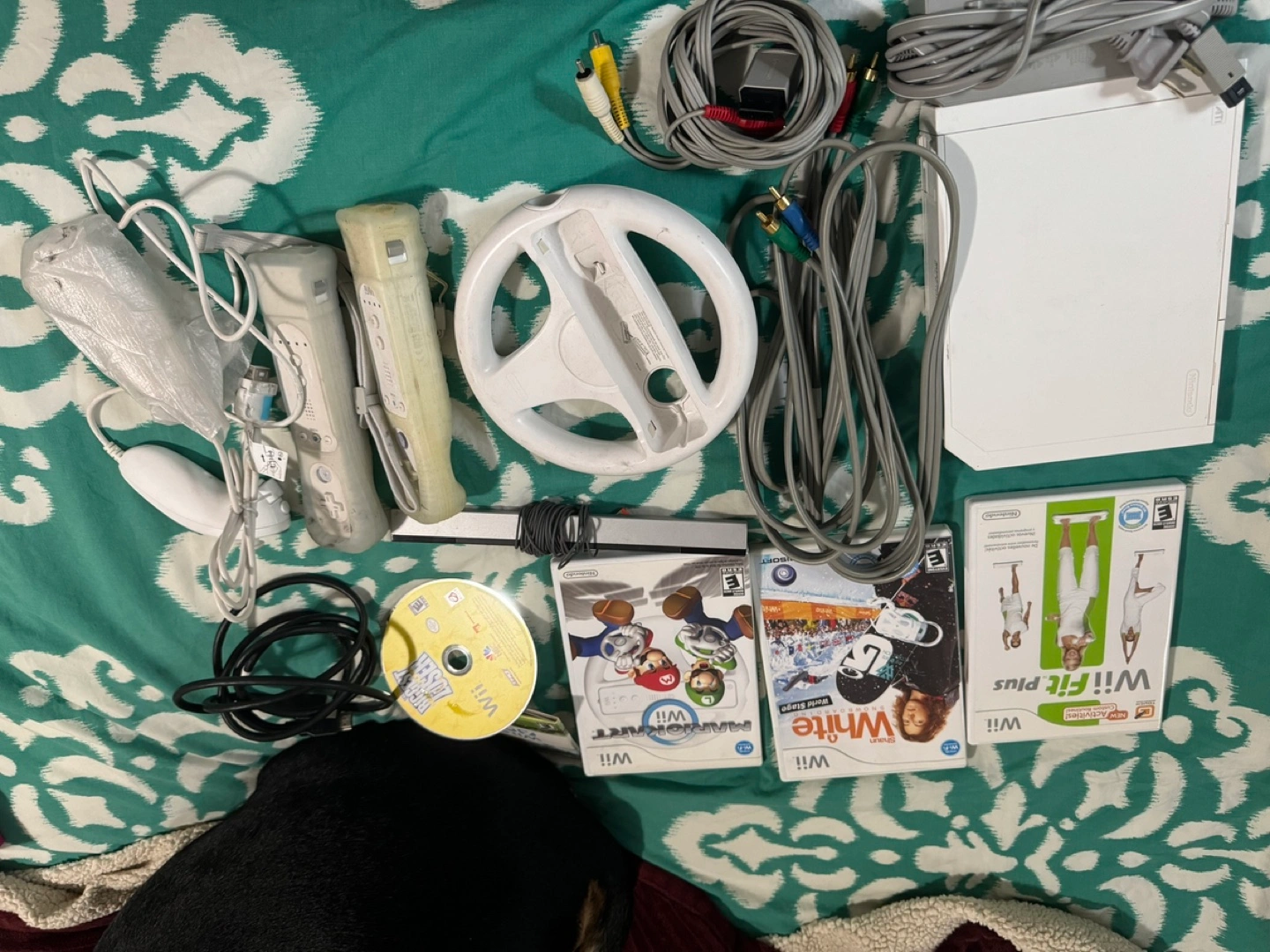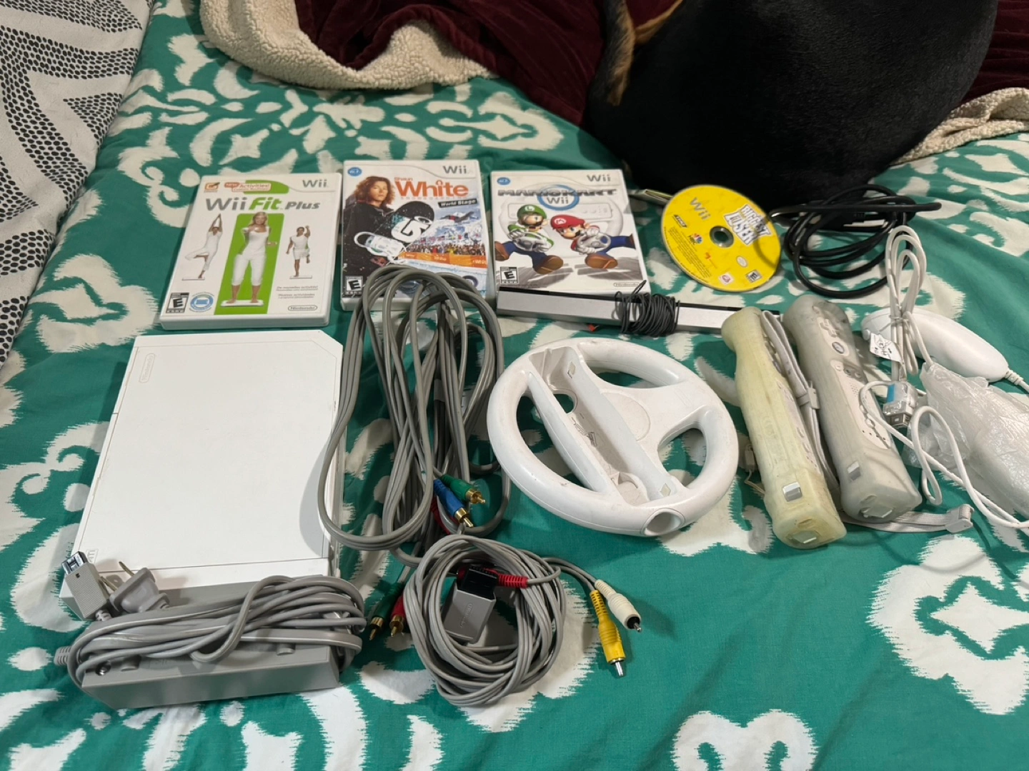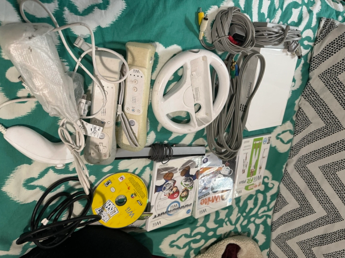 39White Wii console, several games, remotes, nunchucks, Wii Wheel, and various cables included. Pre-owned, some wear and tear visible. Includes Wii fit board Great for casual gamers. Cash/ Venmo only. Must pick up.