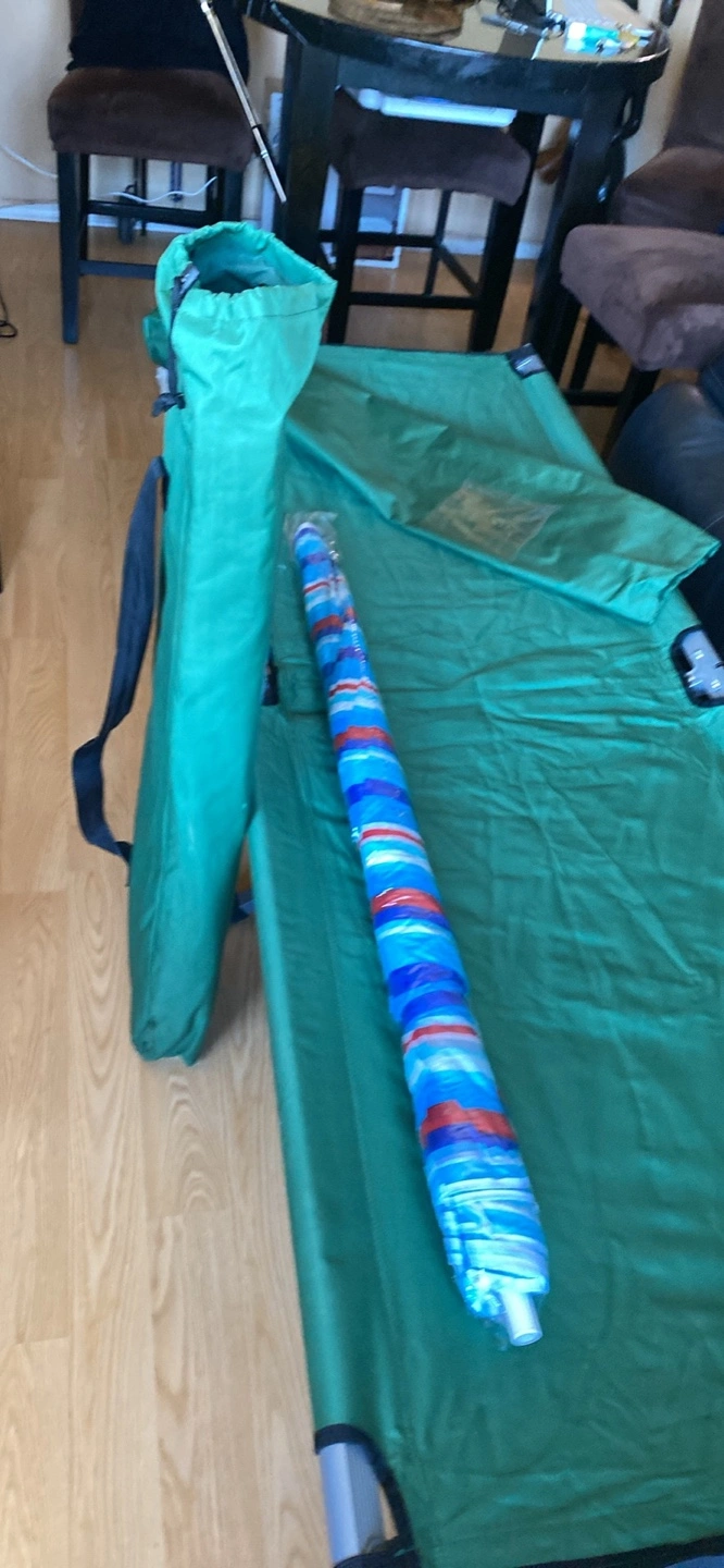 Two (2) sturdy canvas cots- folds for easy transport. Includes carrying case and a beach umbrella. Great for camping or the beach. $30.00 each cot & beach umbrella is free!