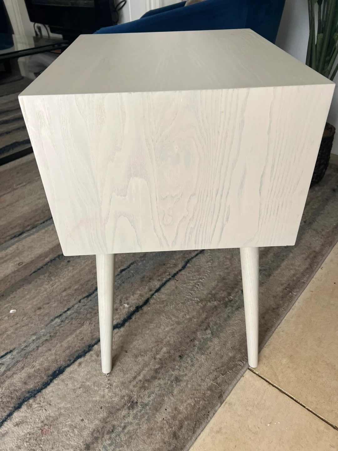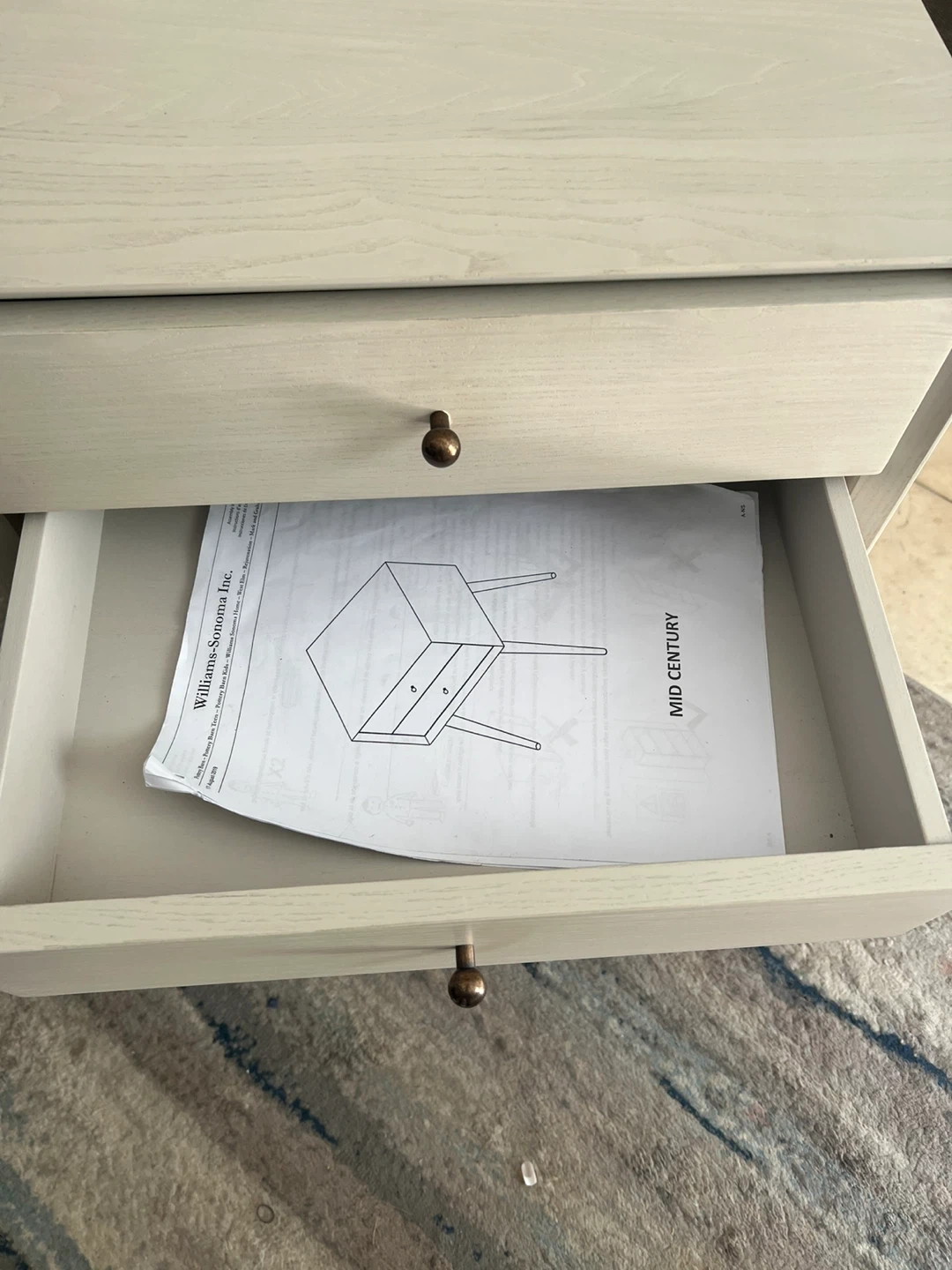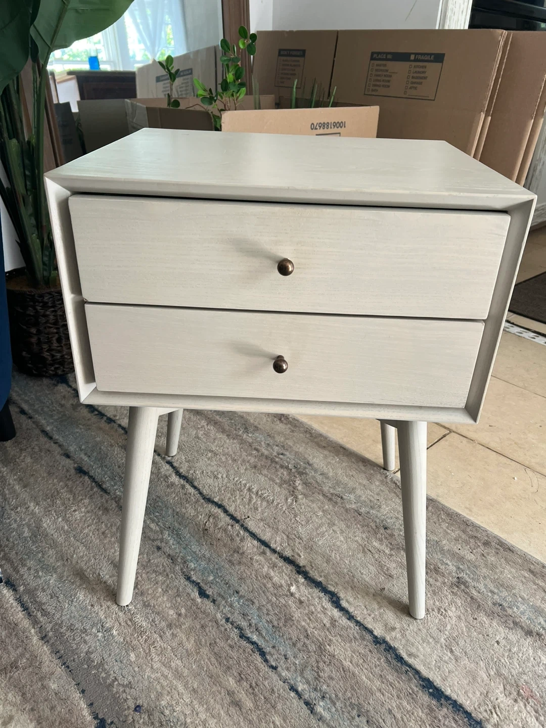 Selling a Williams-Sonoma Mid-Century nightstand. It features a clean, minimalist design with two drawers for storage. The nightstand has a light-colored finish and is in good condition. Perfect for adding a touch of mid-century modern style to your bedroom! Is New
