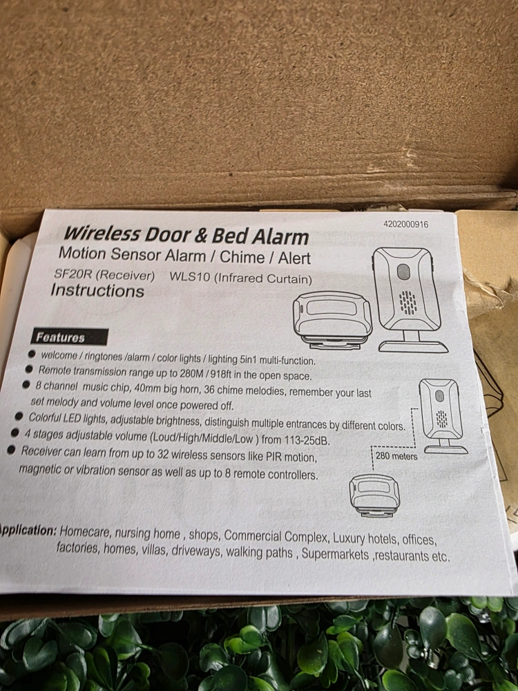 Selling a Wireless Door & Bed Alarm with motion sensor. It's a multi-function device that welcomes with ringtones, alarm, and color lights. The remote transmission range goes up to 280 meters. It features 8 channel music chip and 4 adjustable volume levels. Great for homecare, nursing homes, shops, and more. The box is included Best way to get a deal is if you make multiple offers on different items. I got lots of stuff for sale.