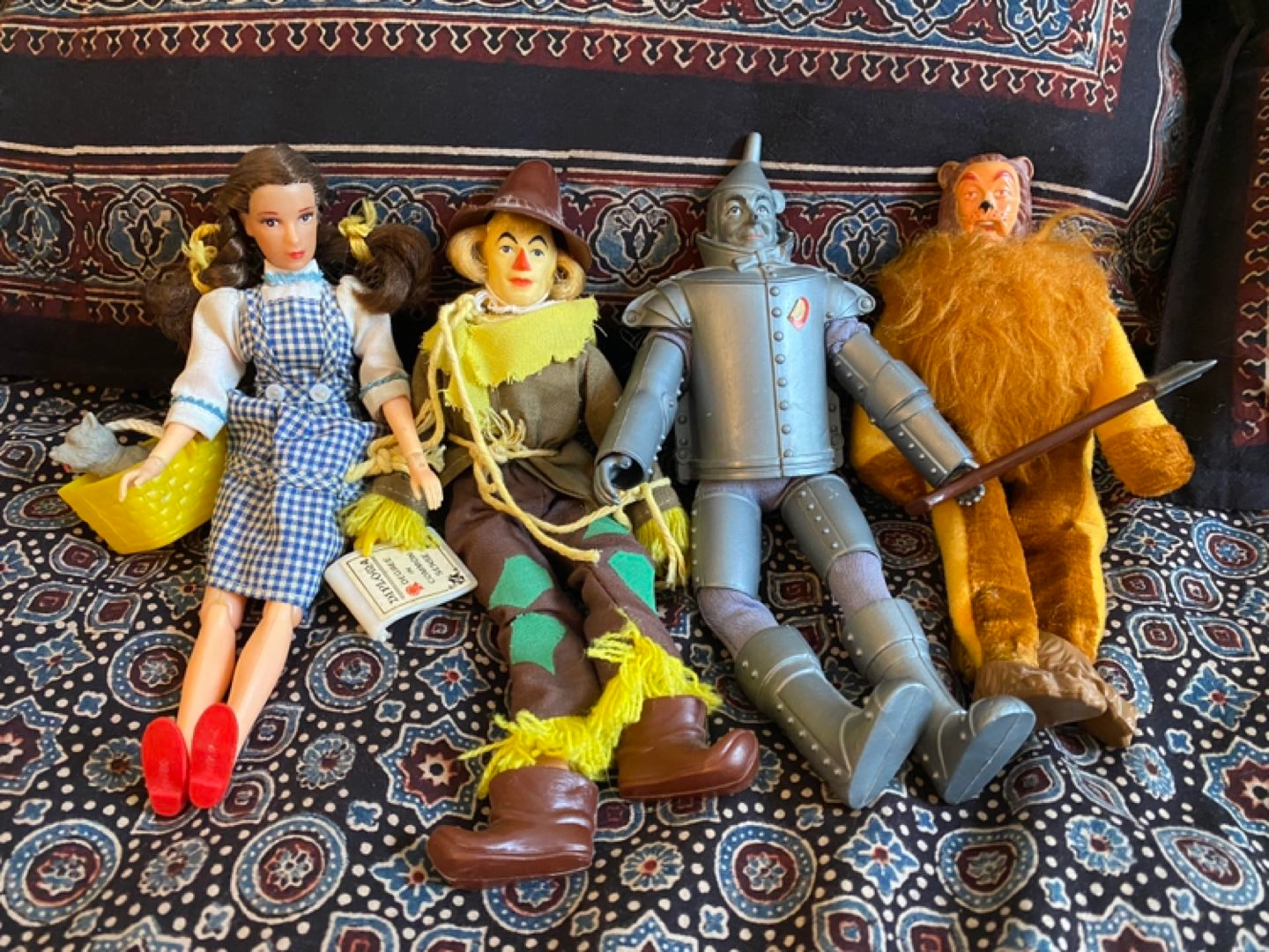 106These were given to me as a child and I loved them. The Scarecrow and Tin man each have one broken leg at the knee joint. The Lion is missing his medal, although I think it may be around, I just can't find it right now. Also the handle Dorothy's basketball broke and I just glued a braided string onto it.