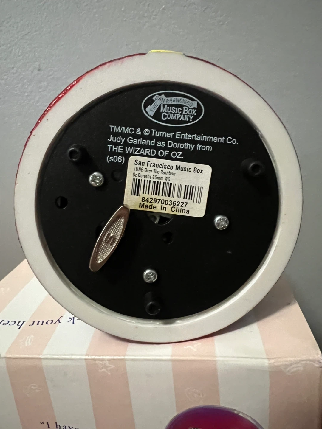 10This is a San Francisco Music Box Company Wizard of Oz music box. It plays 'Over the Rainbow'. It features Judy Garland as Dorothy. The box is included
