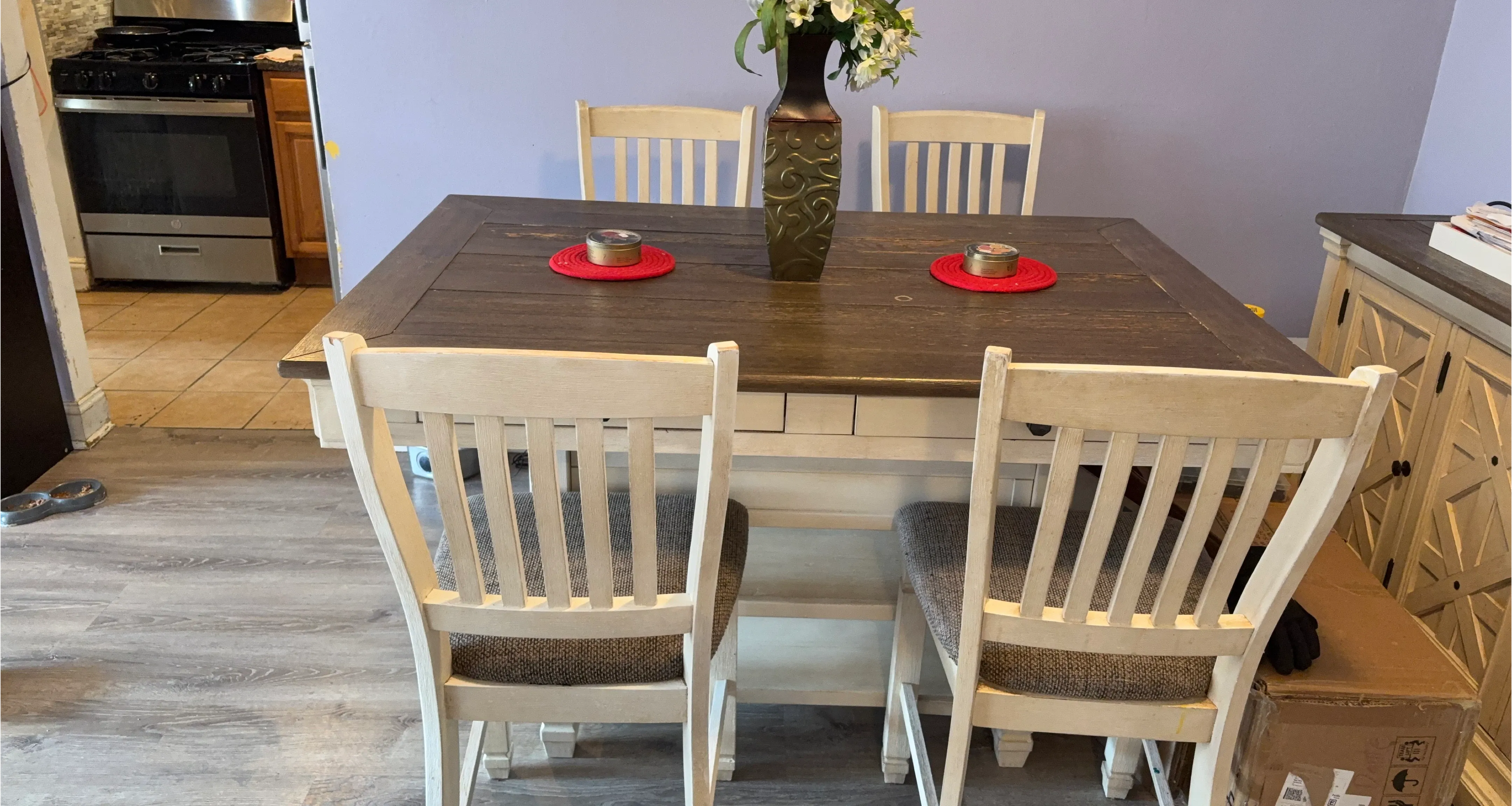 This set includes a rustic distressed wood dining table with four matching chairs, four draws and a wine rack. The table has a dark wood finish and the chairs are painted white with upholstered seats. It's a great option for a cozy kitchen or dining area!
