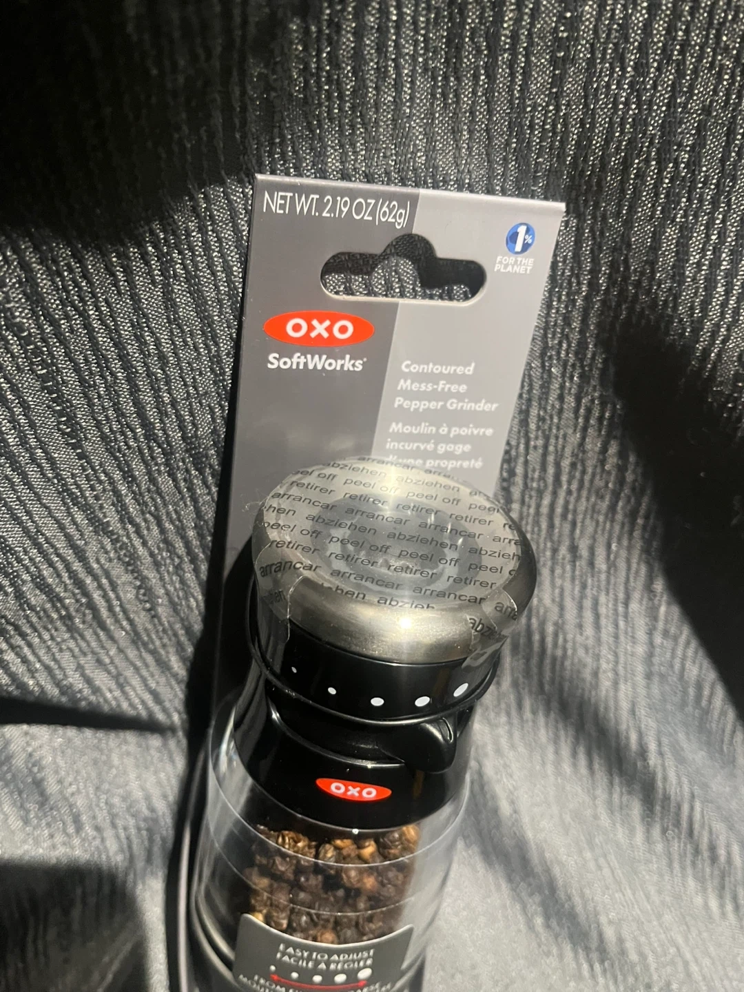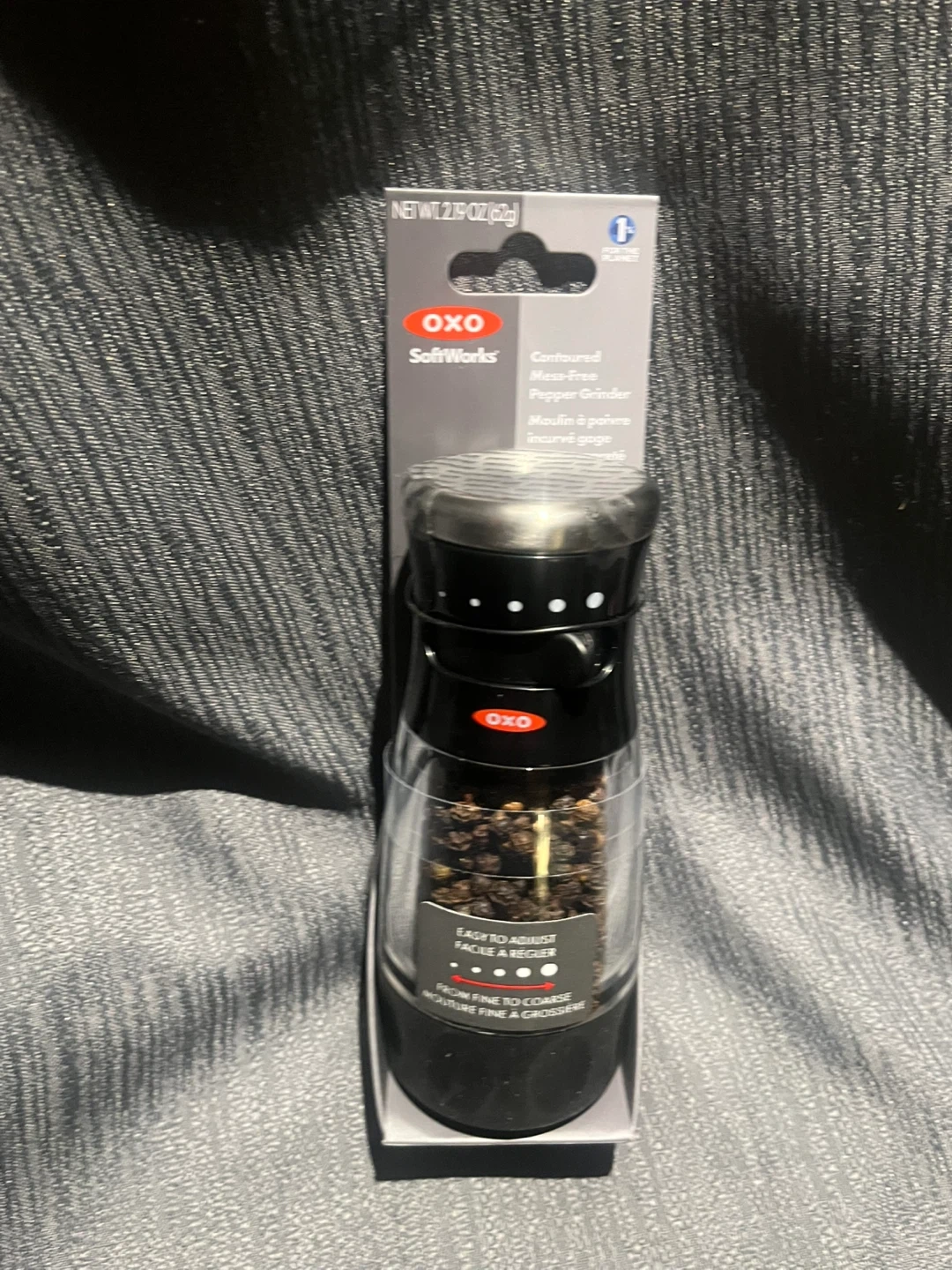 This is an OXO SoftWorks Contoured Mess-Free Pepper Grinder. It's designed with a metal grinder and a contoured body. The grinder has adjustable settings from fine to coarse.