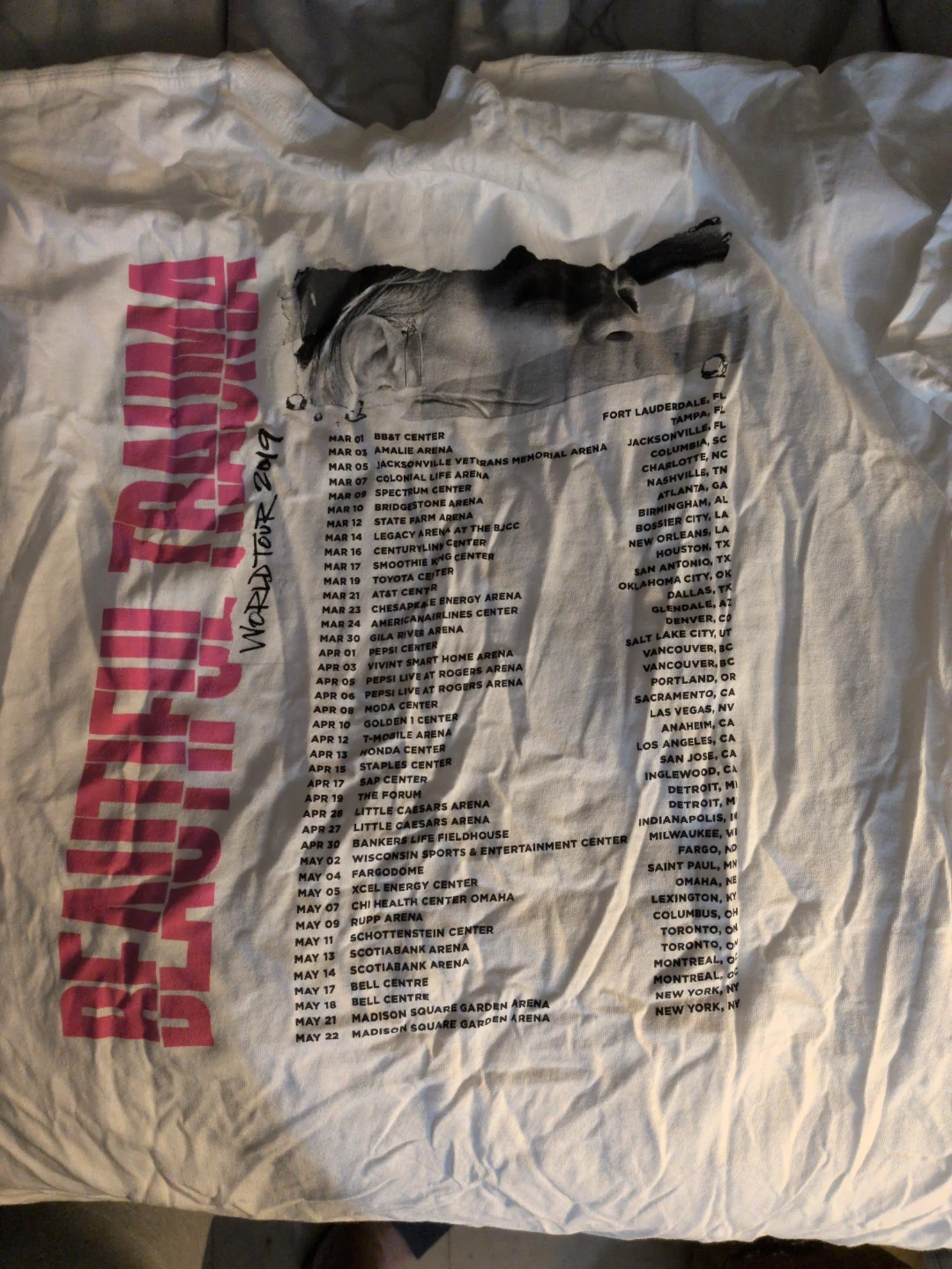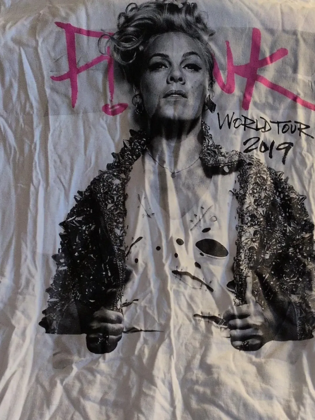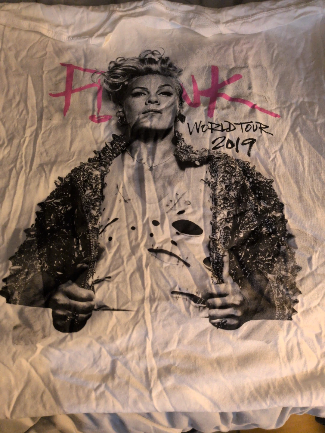 This white t-shirt features P!NK with 'Beautiful Trauma World Tour 2019' printed on the front and back. It's a great way to remember the 2019 tour! Cotton material.