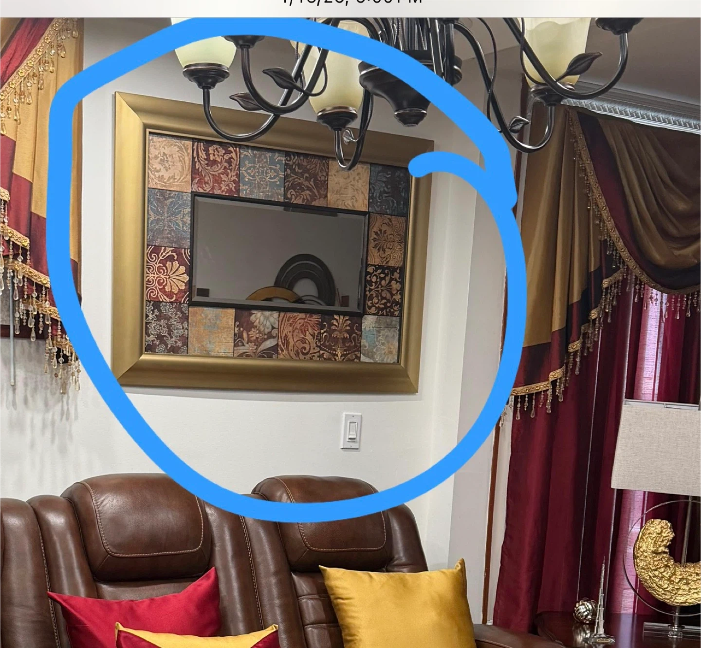 This decorative mirror features an ornate gold-toned frame. The surround is embellished with a mosaic of patterned tiles in warm, rich colors. It's perfect for adding a touch of elegance to any room.