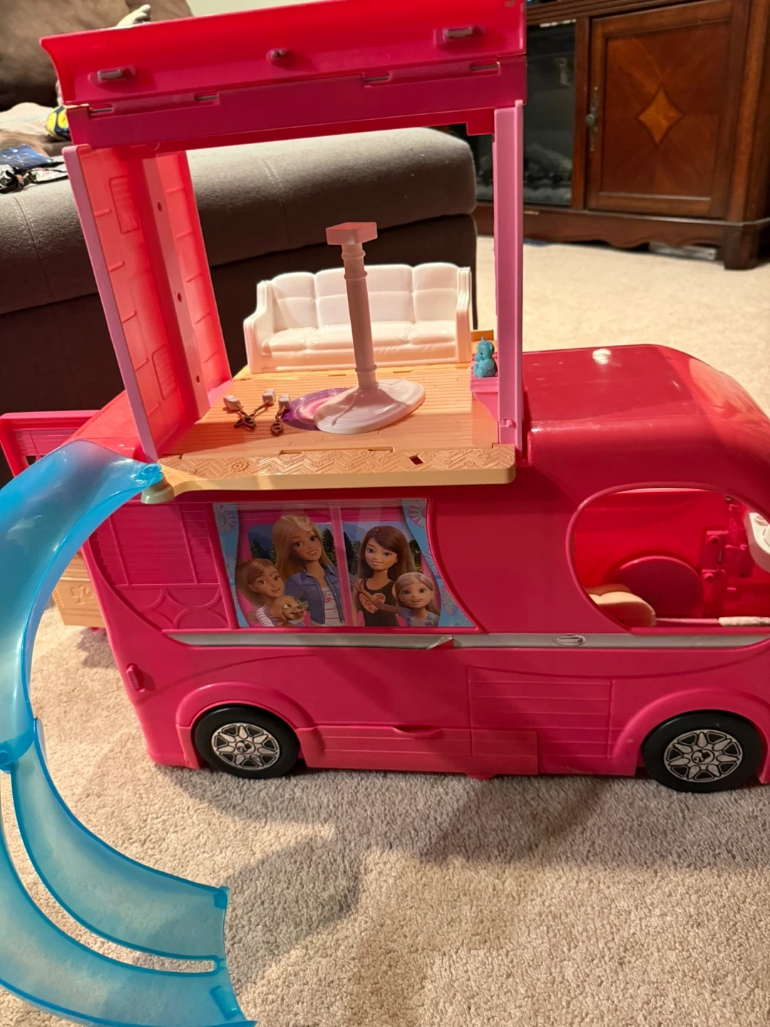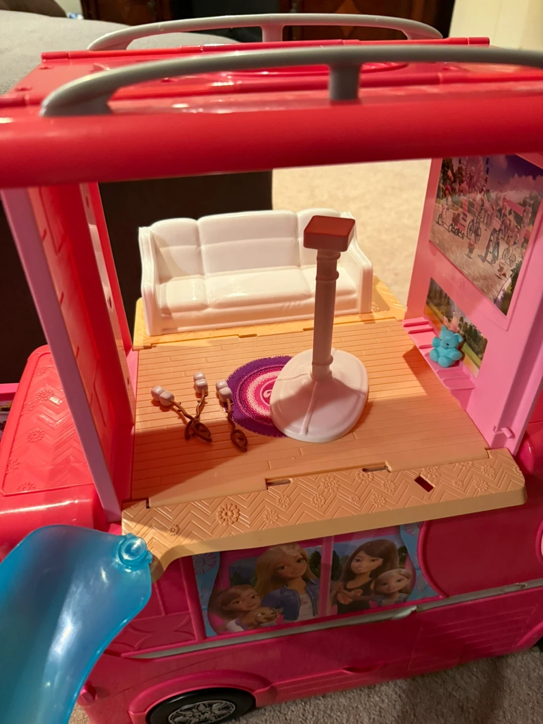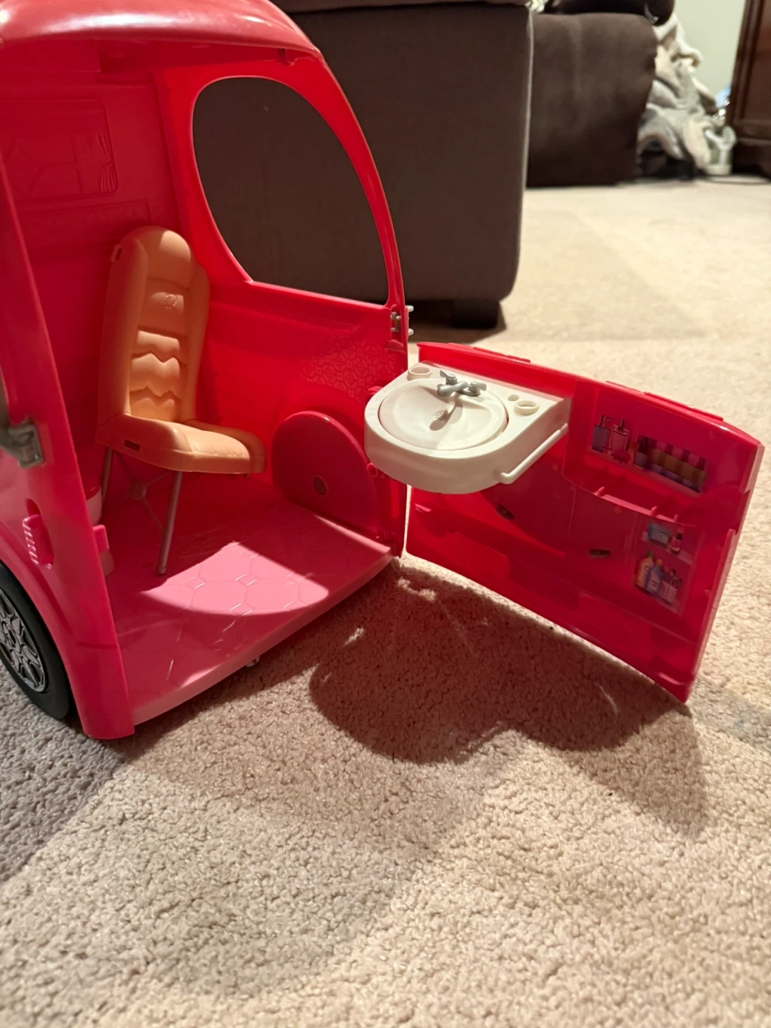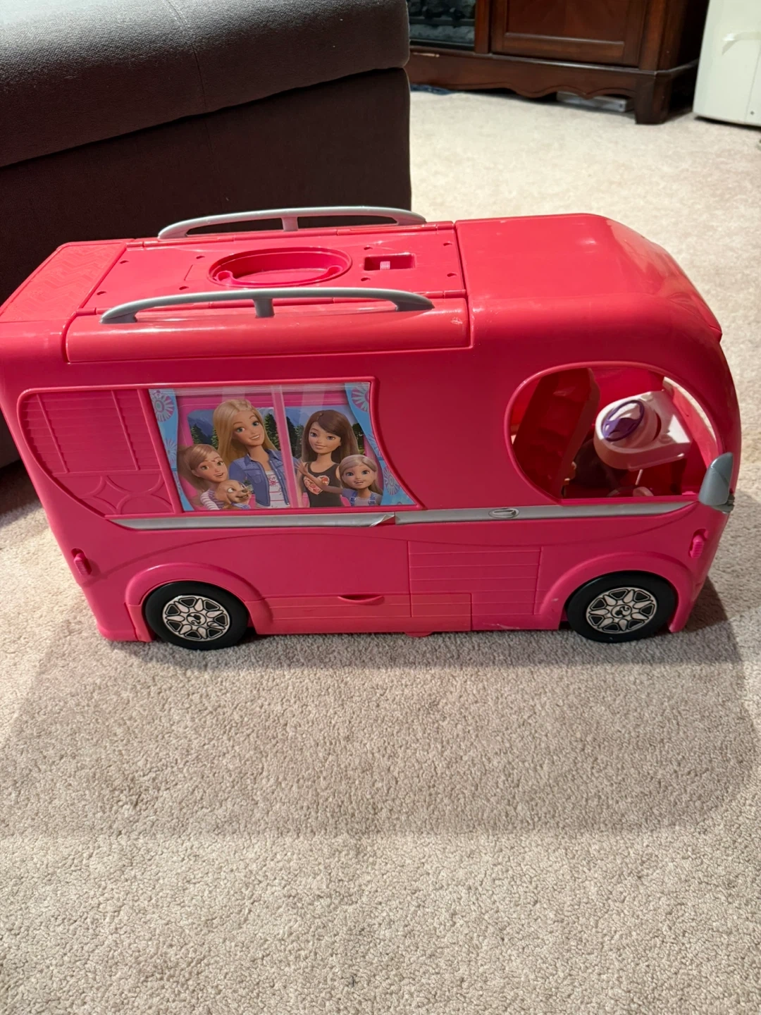 This is a Barbie camper RV playset. It features an opening kitchen area with sink and stove. The camper also includes a fold-out bed and a slide. It's a fun toy for imaginative play! Might be missing some pieces.