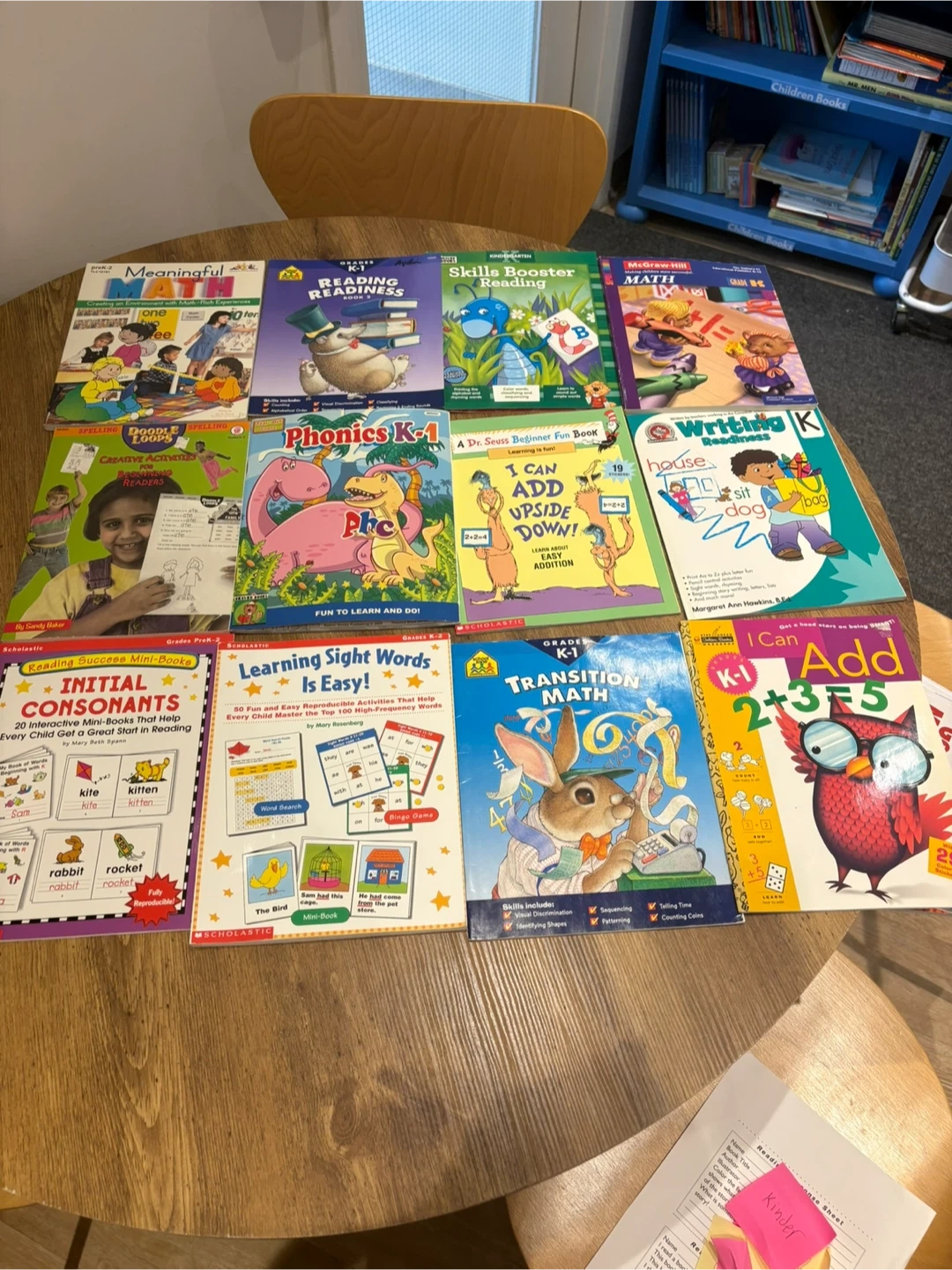 Large bundle of early learning workbooks including phonics, sight words, math readiness, writing practice, spelling, and reading activities.