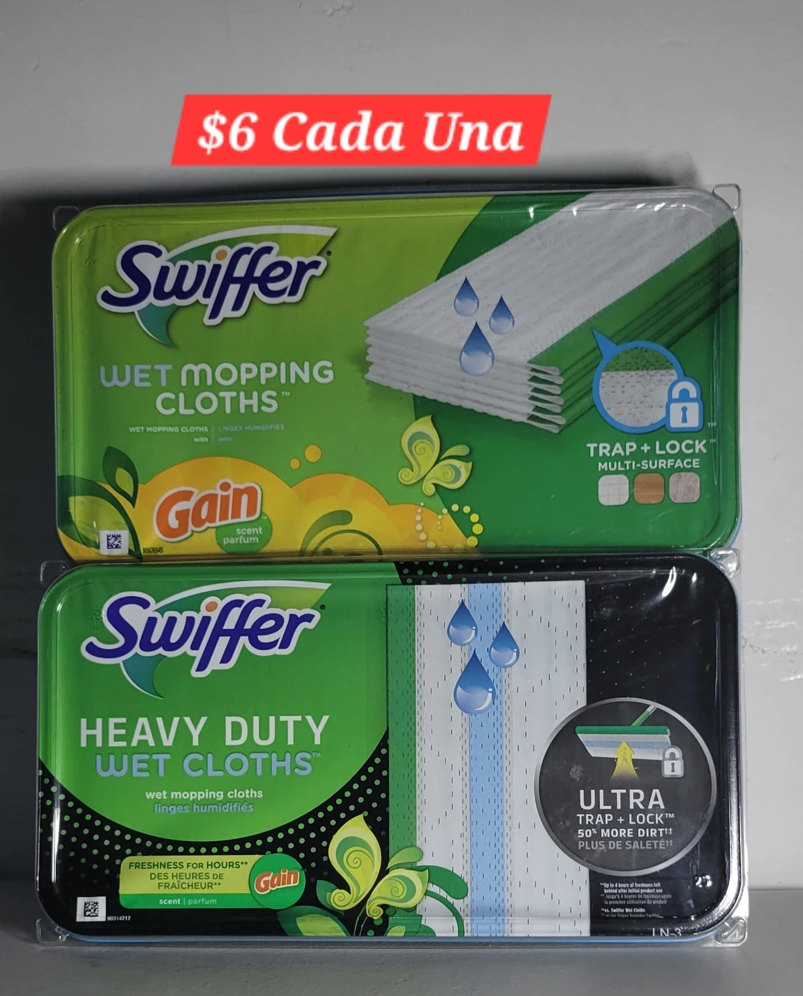 Swiffer Wet Mopping Cloths and Heavy Duty Wet Cloths are included. Both feature Trap + Lock technology. Gain scent for a fresh smell.