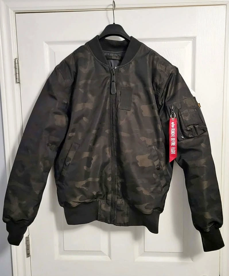 Like new, lightly worn. Classic Alpha Industries MA-1 bomber with a reversible design and down insulation. Clean condition, no flaws.