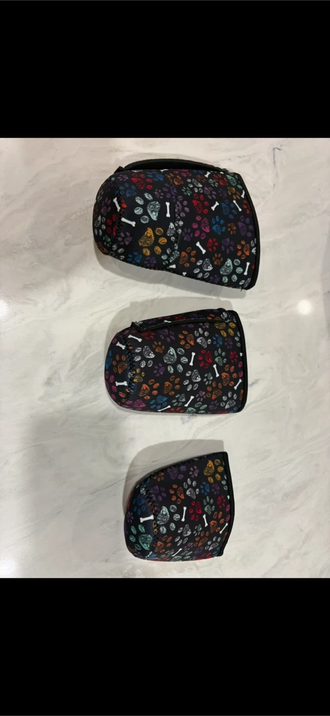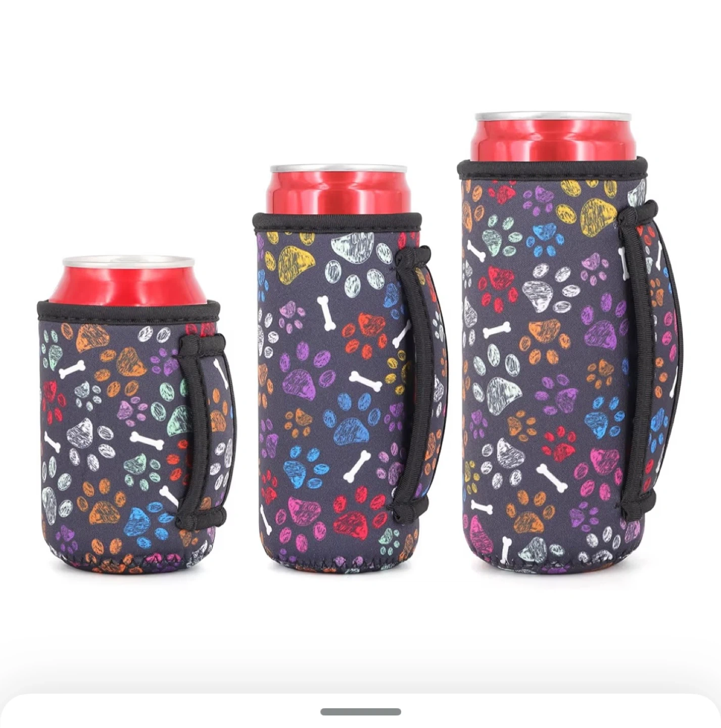 Here's a set of three can coolers featuring a fun dog paw print design! They come in different sizes to fit various cans and bottles. Perfect for keeping your drinks cold while showing off your love for dogs